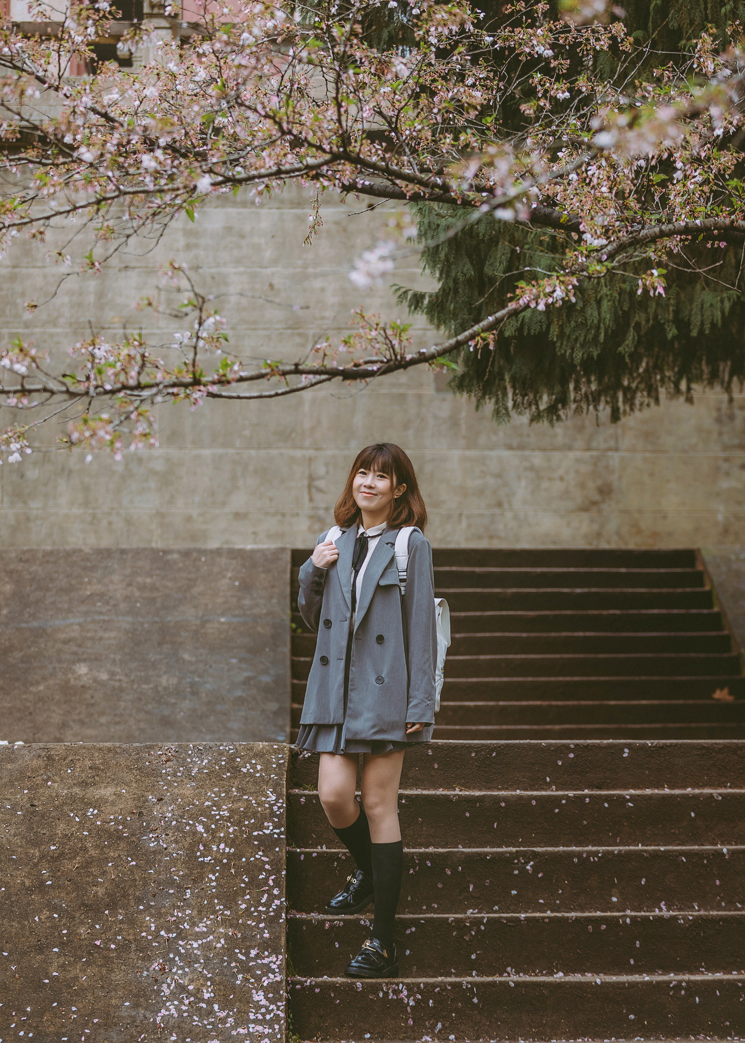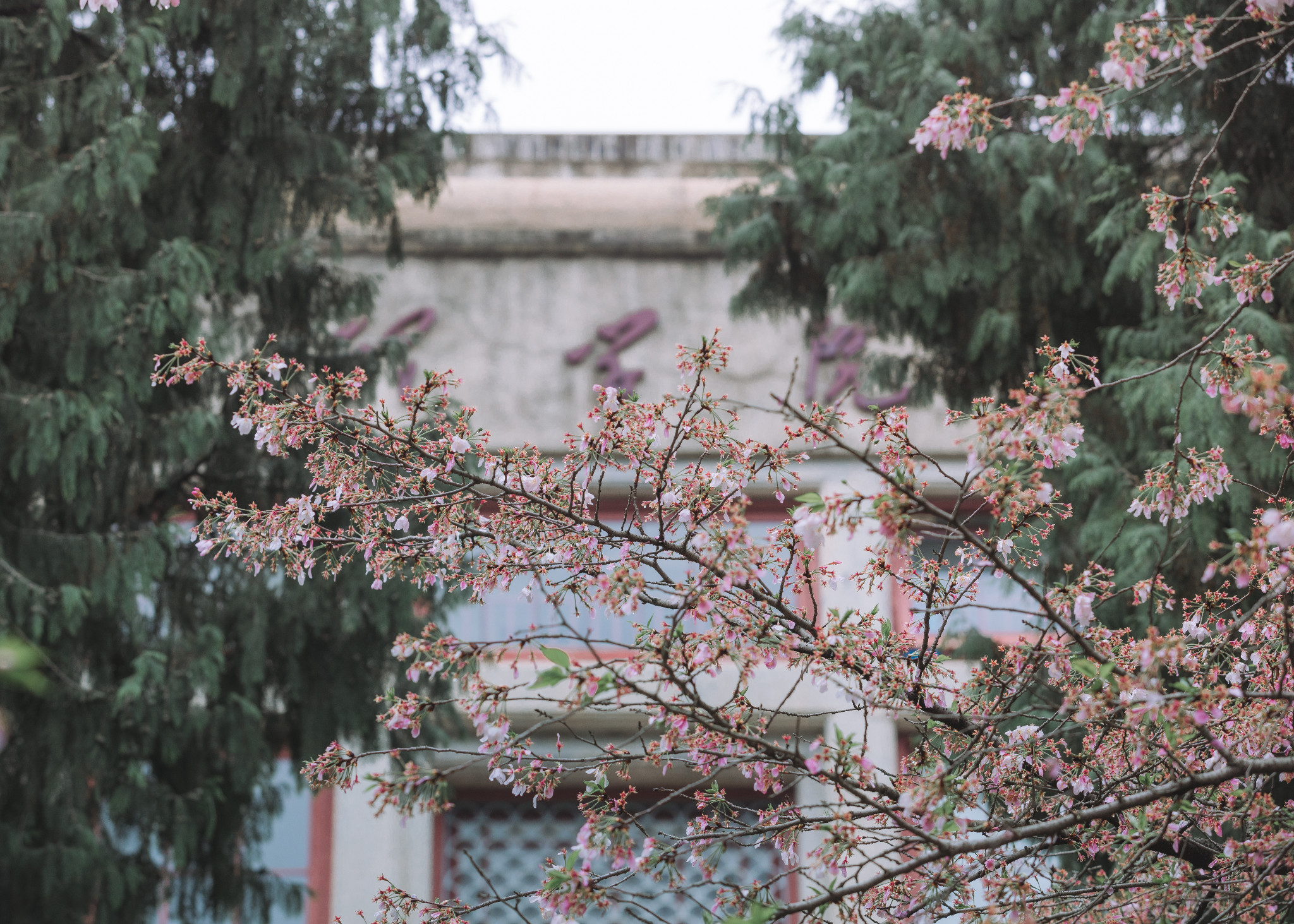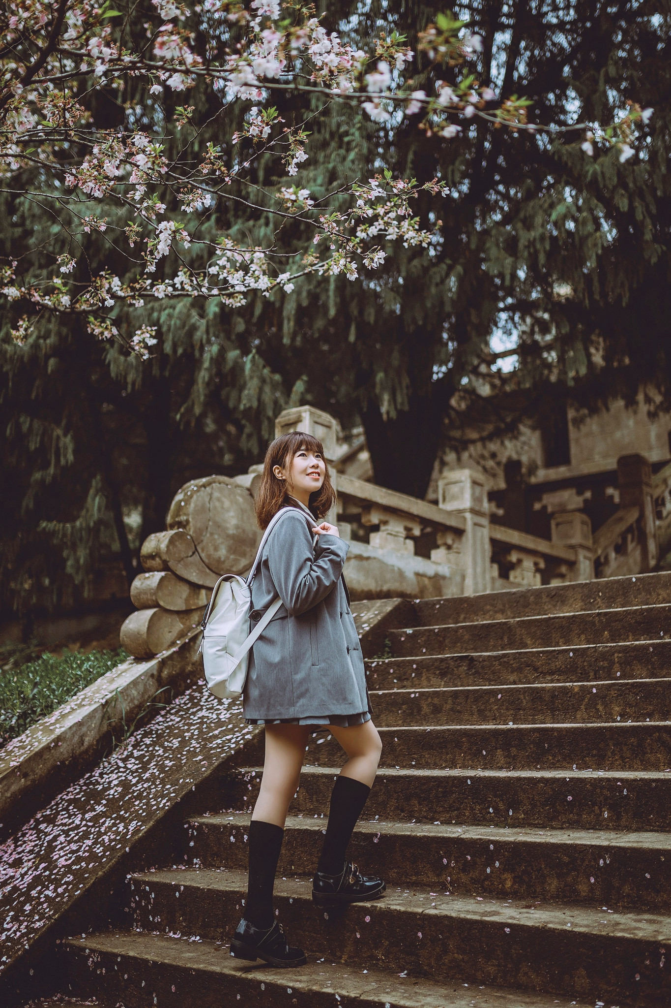 理学楼下有一片小小的樱林,超级美,那里有几株生长很旺盛,高到二楼天台上的樱花,除了在天台上拍摄他们,模特也可以去樱花树底下,机位在理学楼二楼平台上,以樱花做前景,可以拍出非常非常唯美的樱花照!
