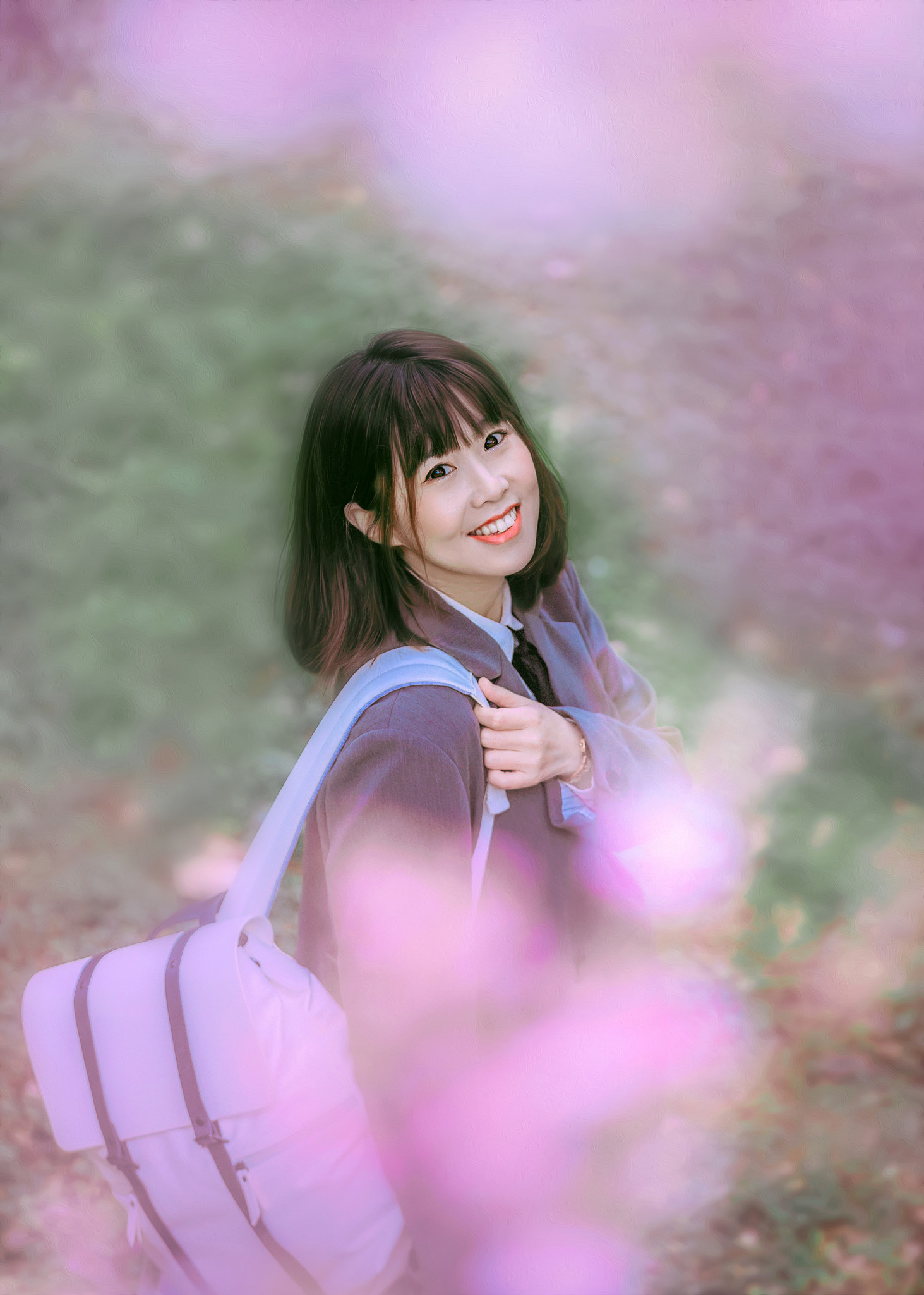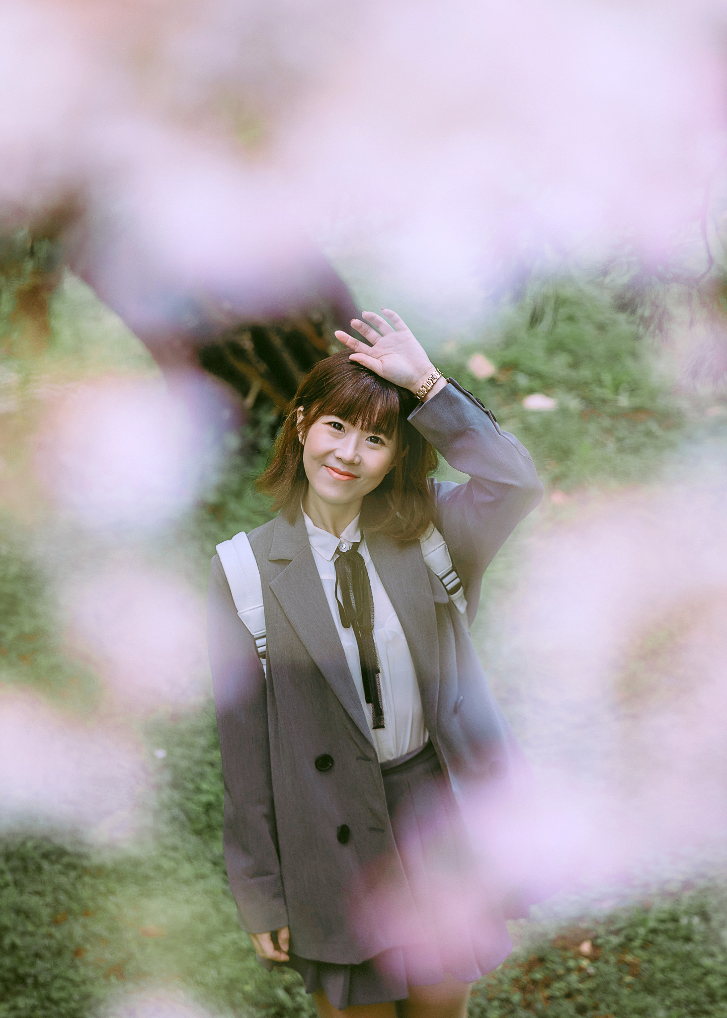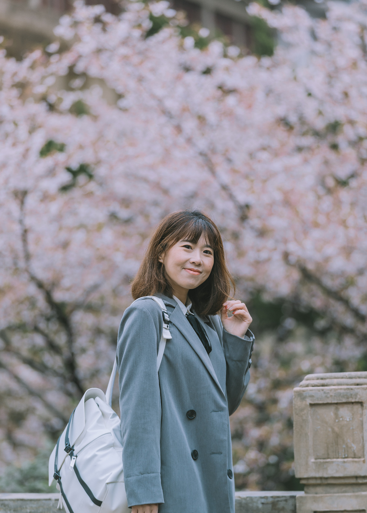 理学楼下有一片小小的樱林,超级美,那里有几株生长很旺盛,高到二楼天台上的樱花,除了在天台上拍摄他们,模特也可以去樱花树底下,机位在理学楼二楼平台上,以樱花做前景,可以拍出非常非常唯美的樱花照!
