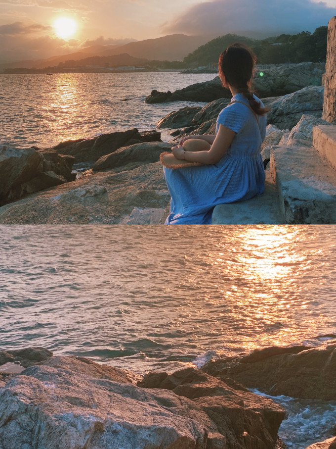 沙滩不大,沙滩椅一打开,狗子一奔跑,小帆船和潜水玩起来,这不是我梦寐以求的治愈系周末嘛!往左手边走走有片礁石堆,日落撒在海面上,折射的光线映在礁石,温柔得很~