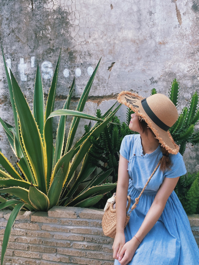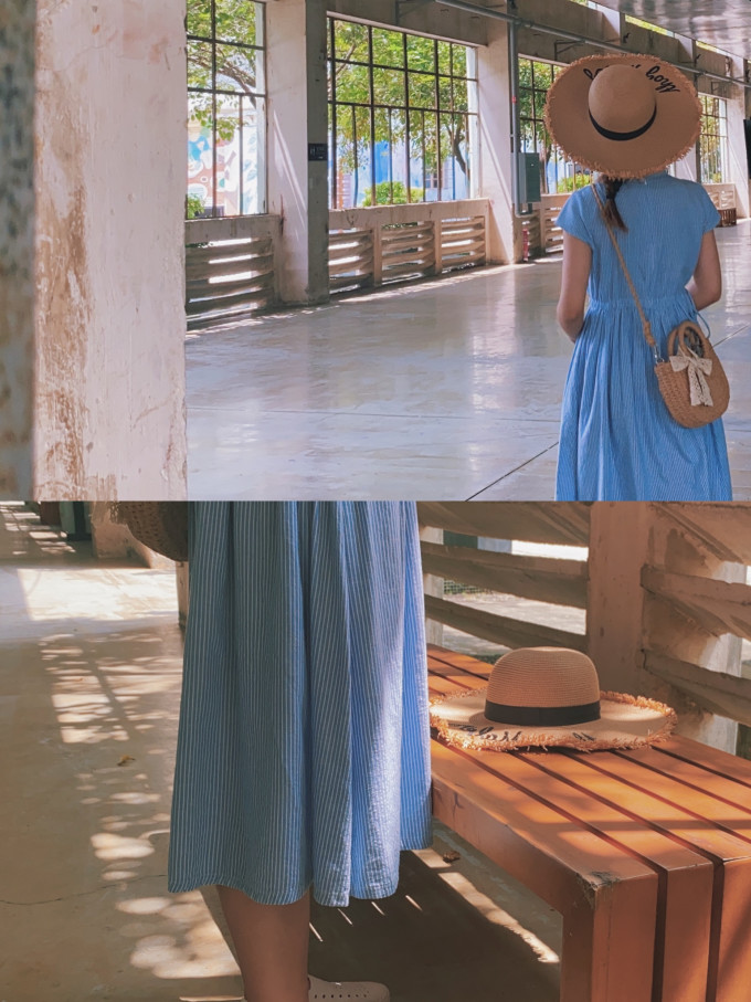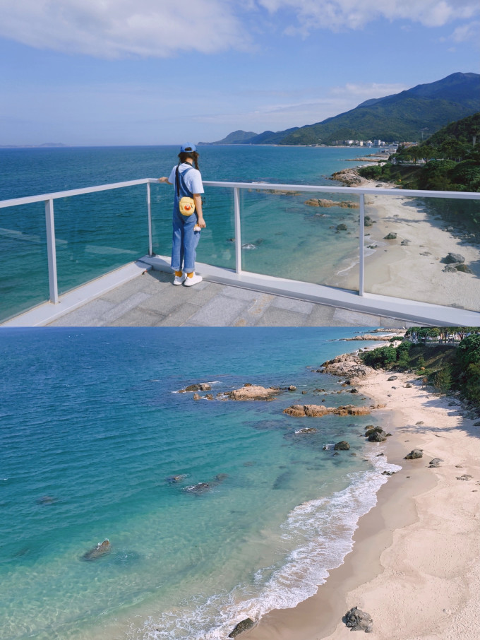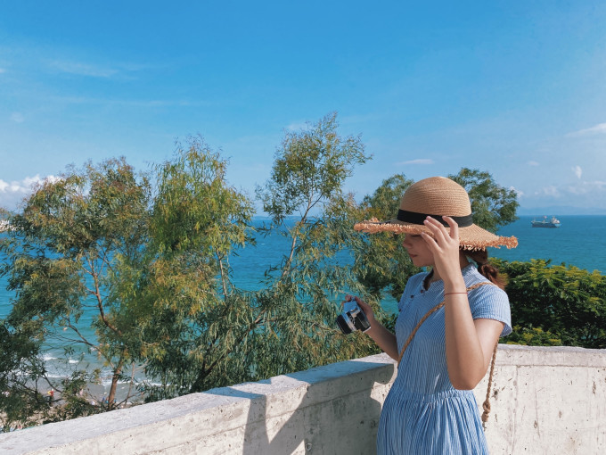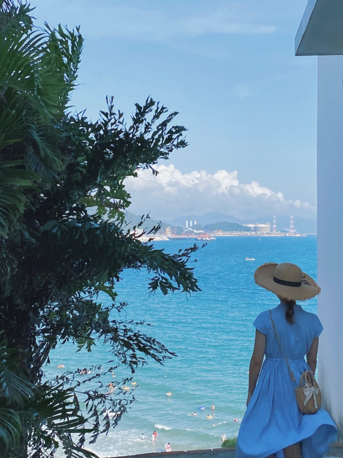 去海边要选低饱和度且干净的颜色,白色、浅蓝色、淡黄色都ok,我当天的穿搭是亚麻料新式旗袍➕草帽➕编制袋➕懒人鞋,小清新文艺风(但我还是觉得很越南feel)