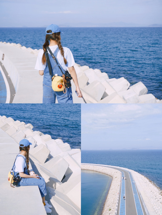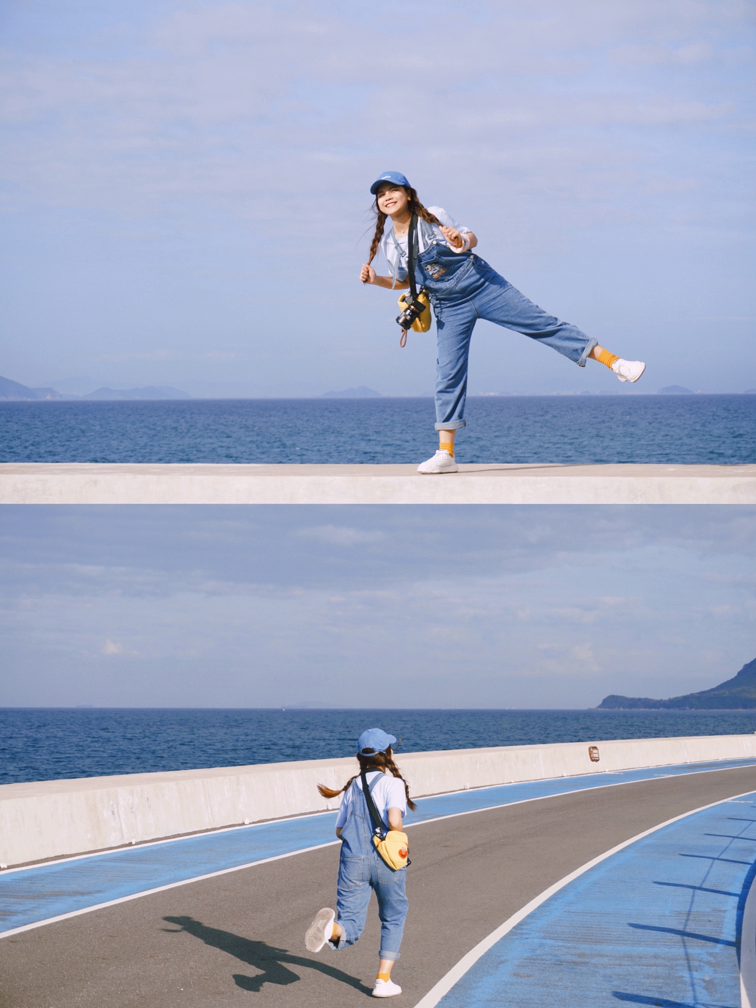 摄影师站在防波堤上拍奔跑的你,或者你站在堤上平视拍摄,很元气很日系!有无人机加分