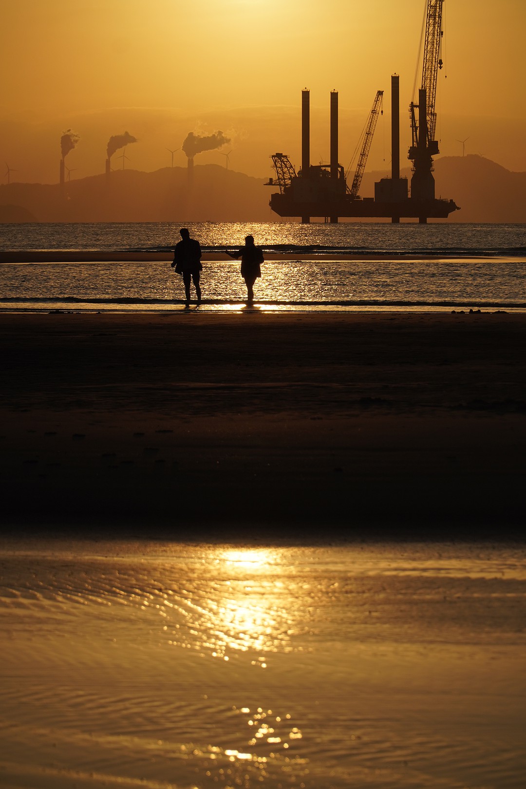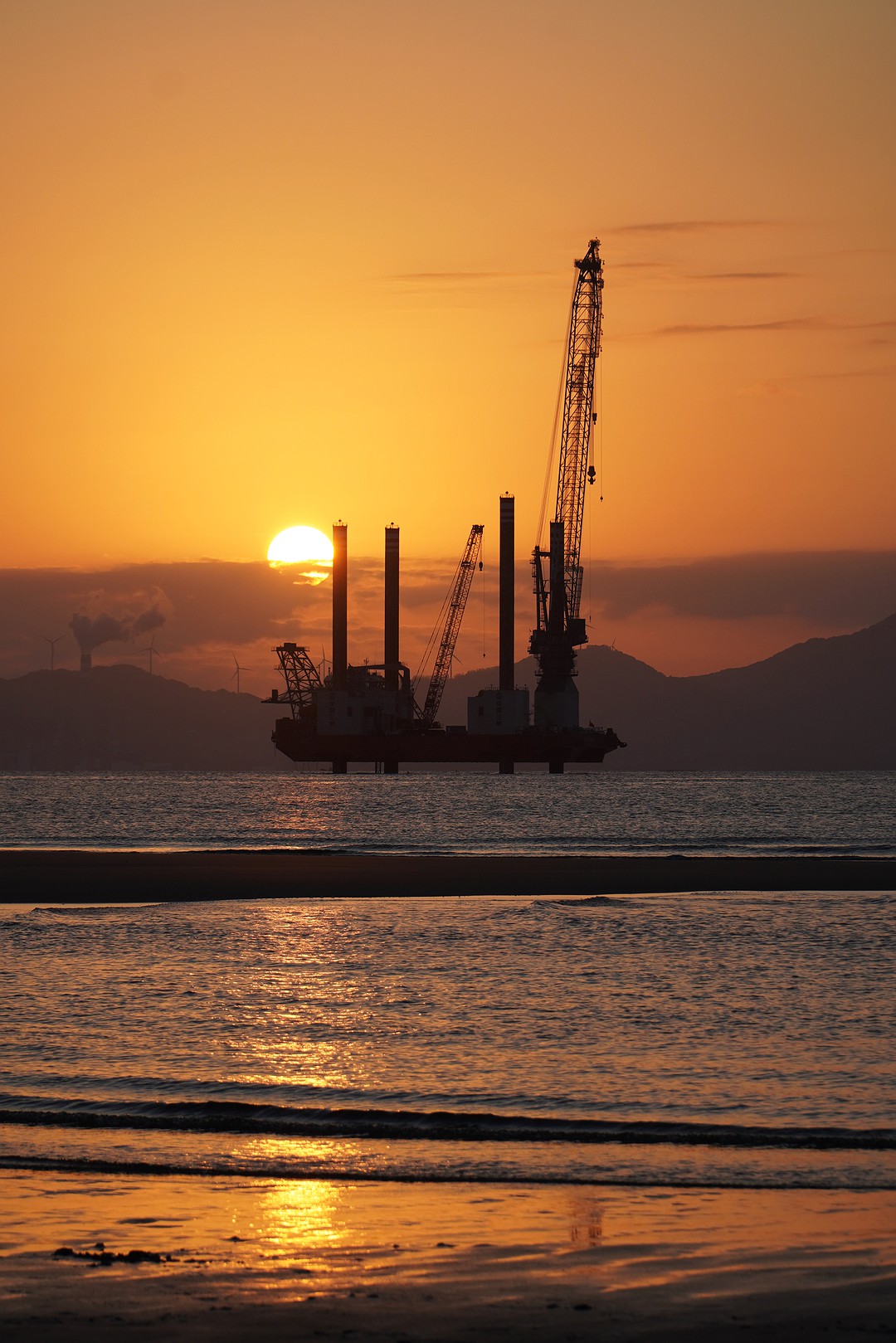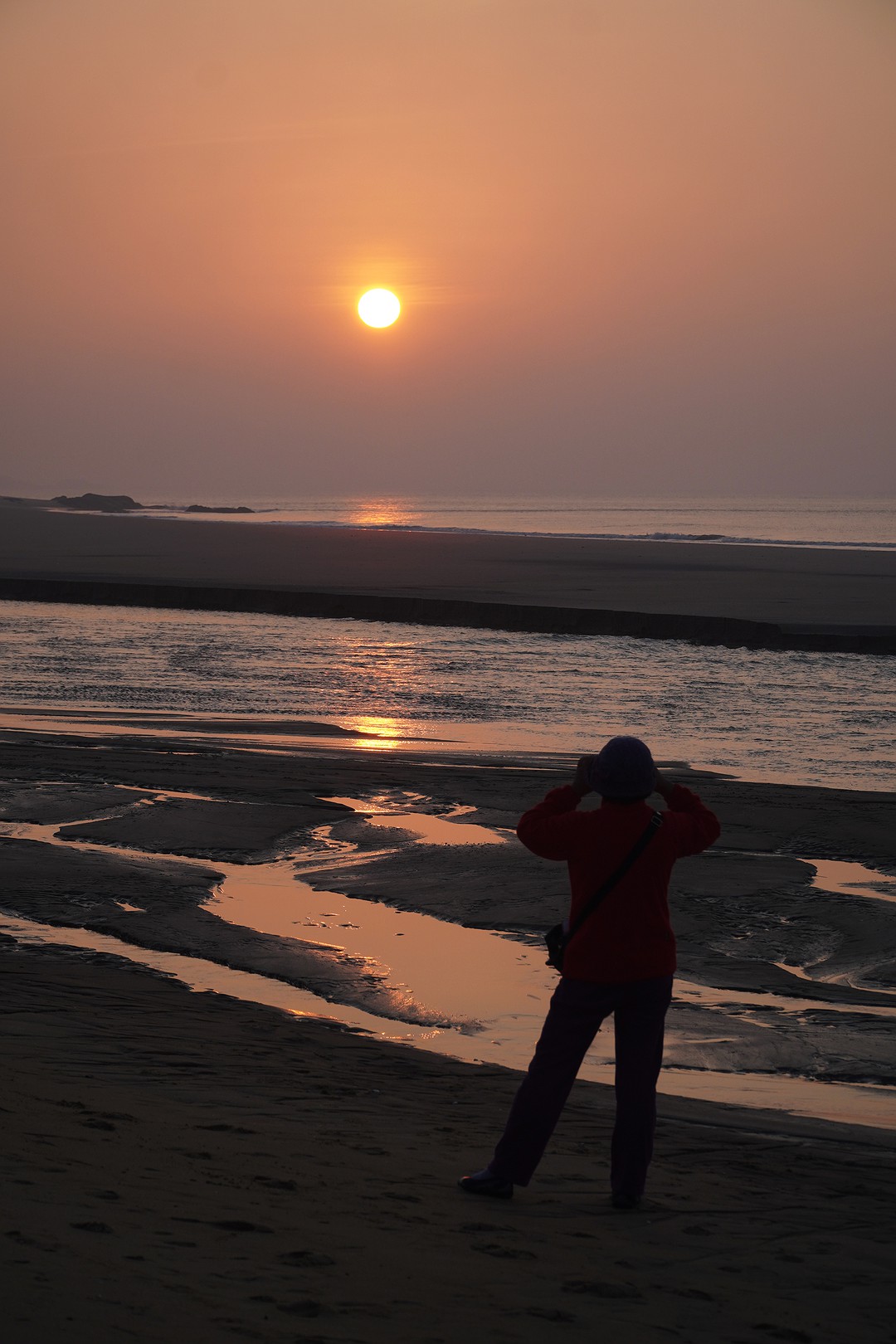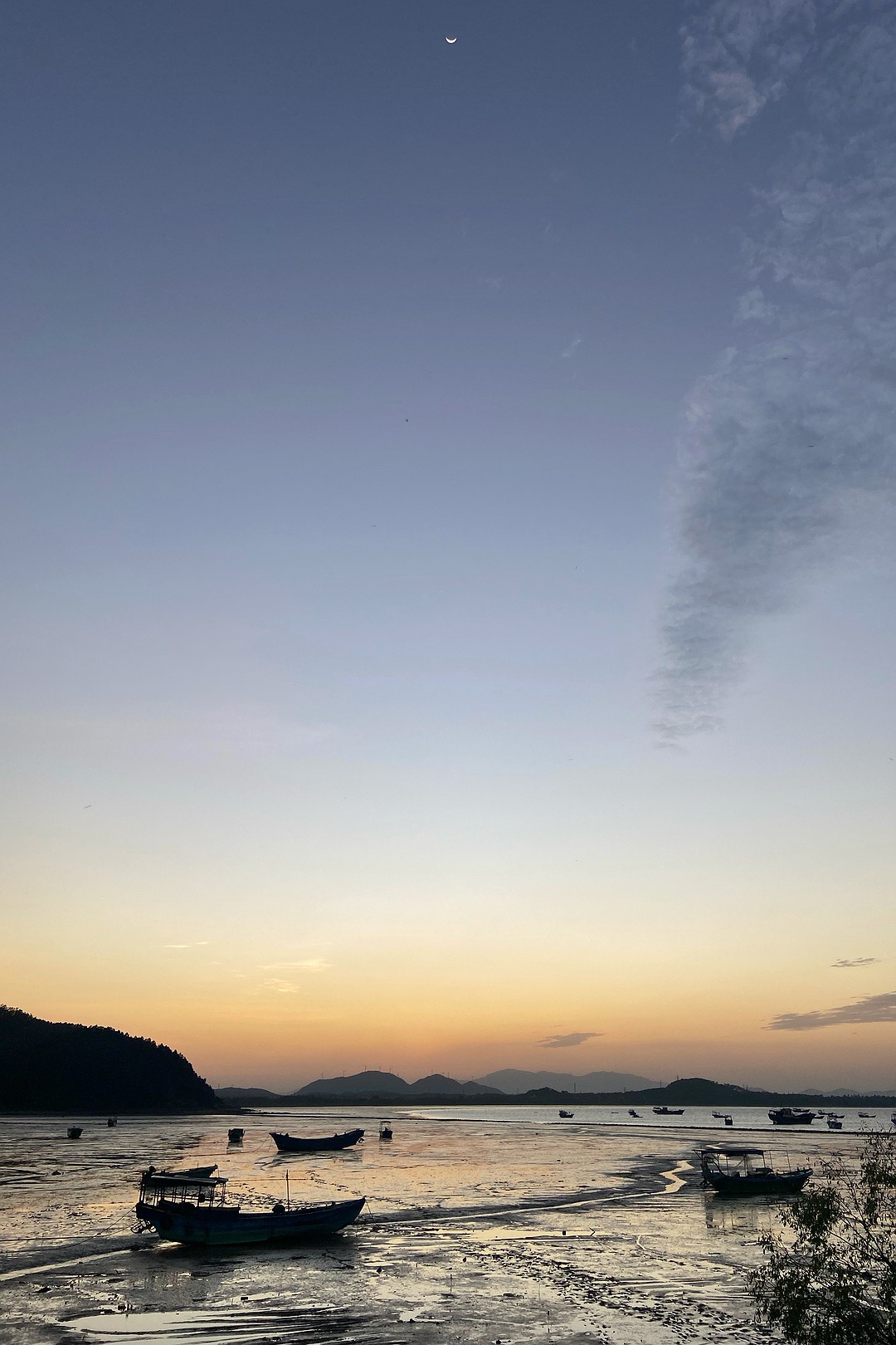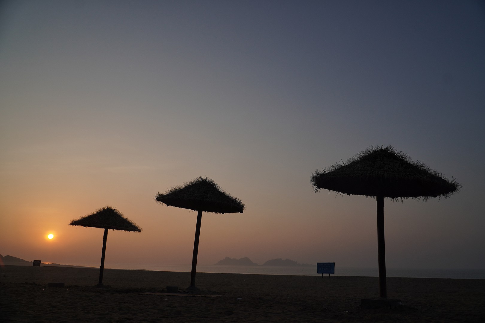 这里是看日落的好地方。近处的沙滩,远处的岛上丘陵,海面上穿梭的渔船,丰富了落日余晖下人类的活动。