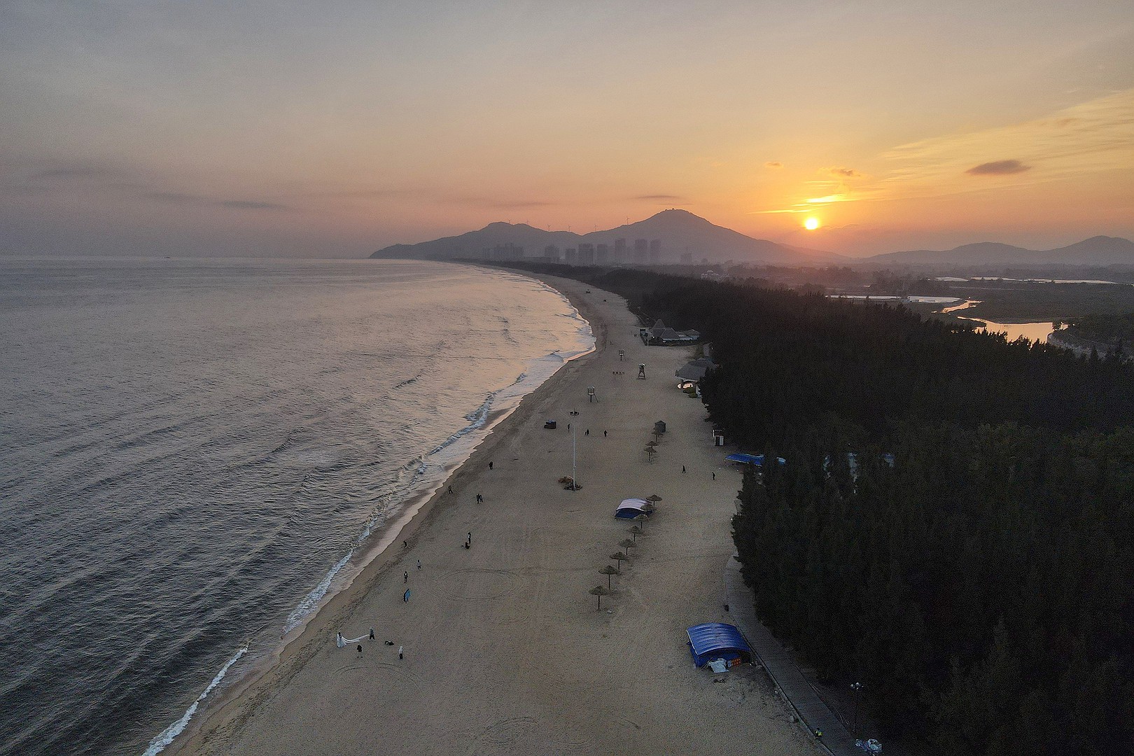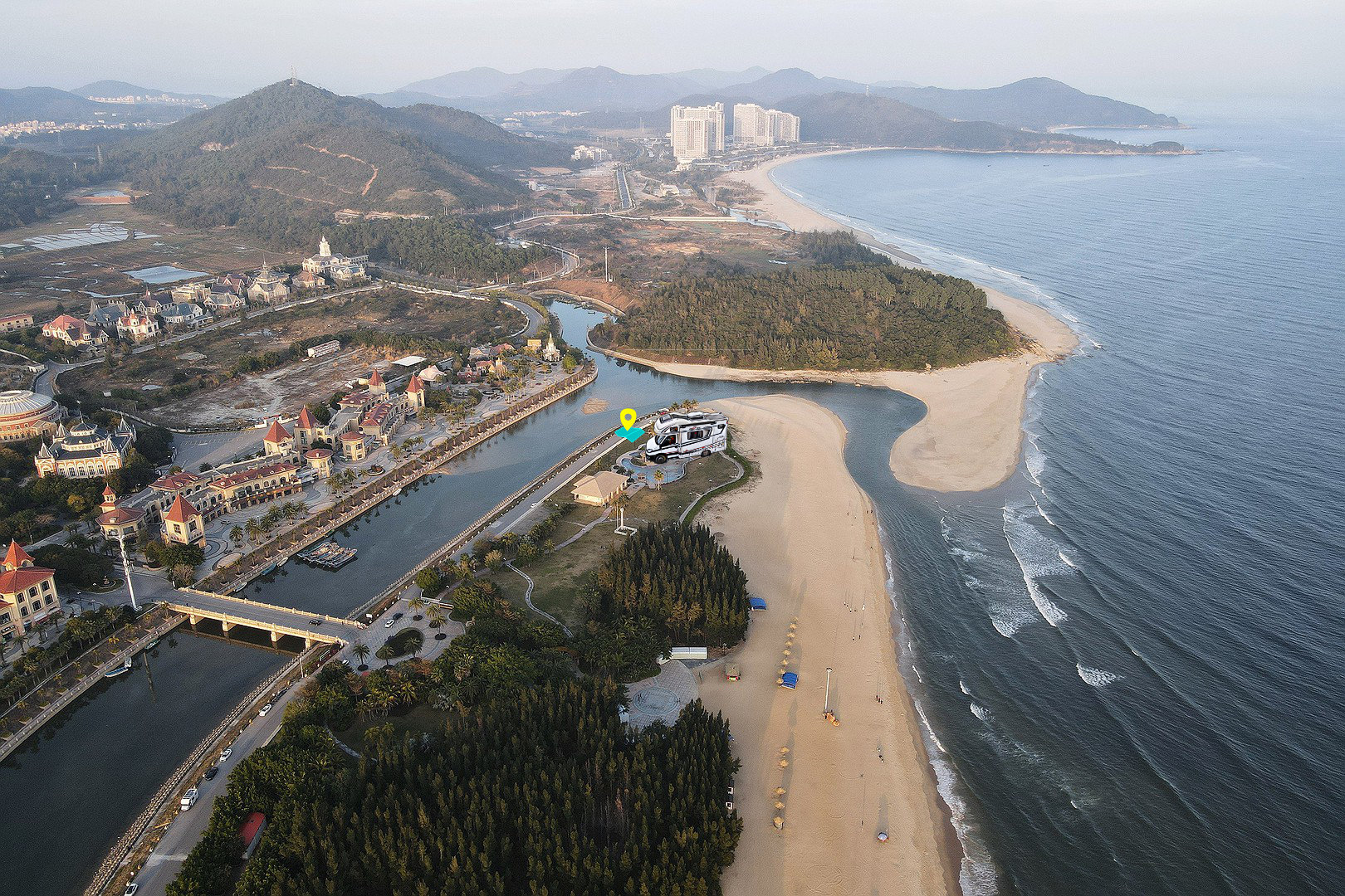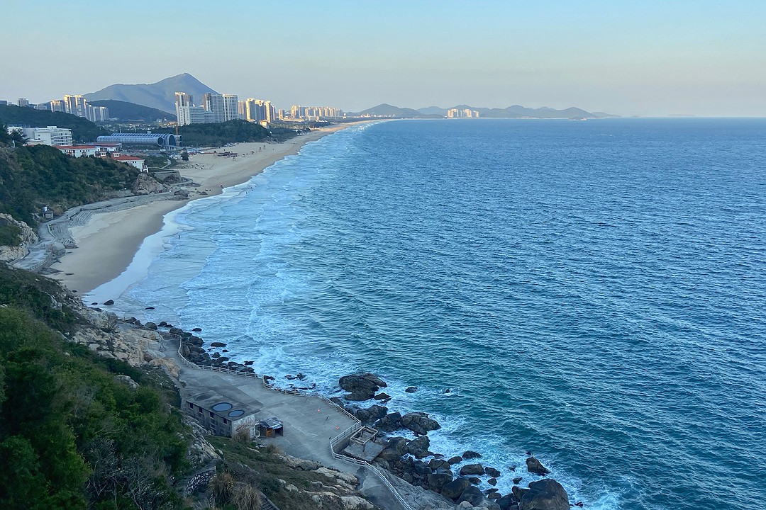 所以,我们打算去某音上的网红景点“东方银滩”看看。这里是观看十里银滩绝佳的角度。评选结果揭晓的那年建成的。那时十里银滩背后是一片树林,一座高楼也没有。