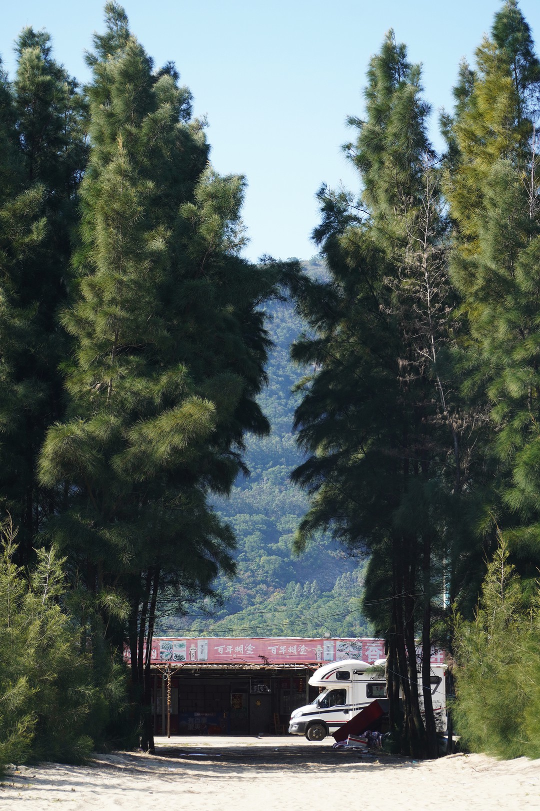 如果往南走,海滩的防风林外,有一条水泥路穿过,那有几家饭店。有车友停在那。那里是可以把车开到海滩的。相对来说原生态了许多。但这沙地会陷车。卫生条件也不好。所以,我们没有选这里。