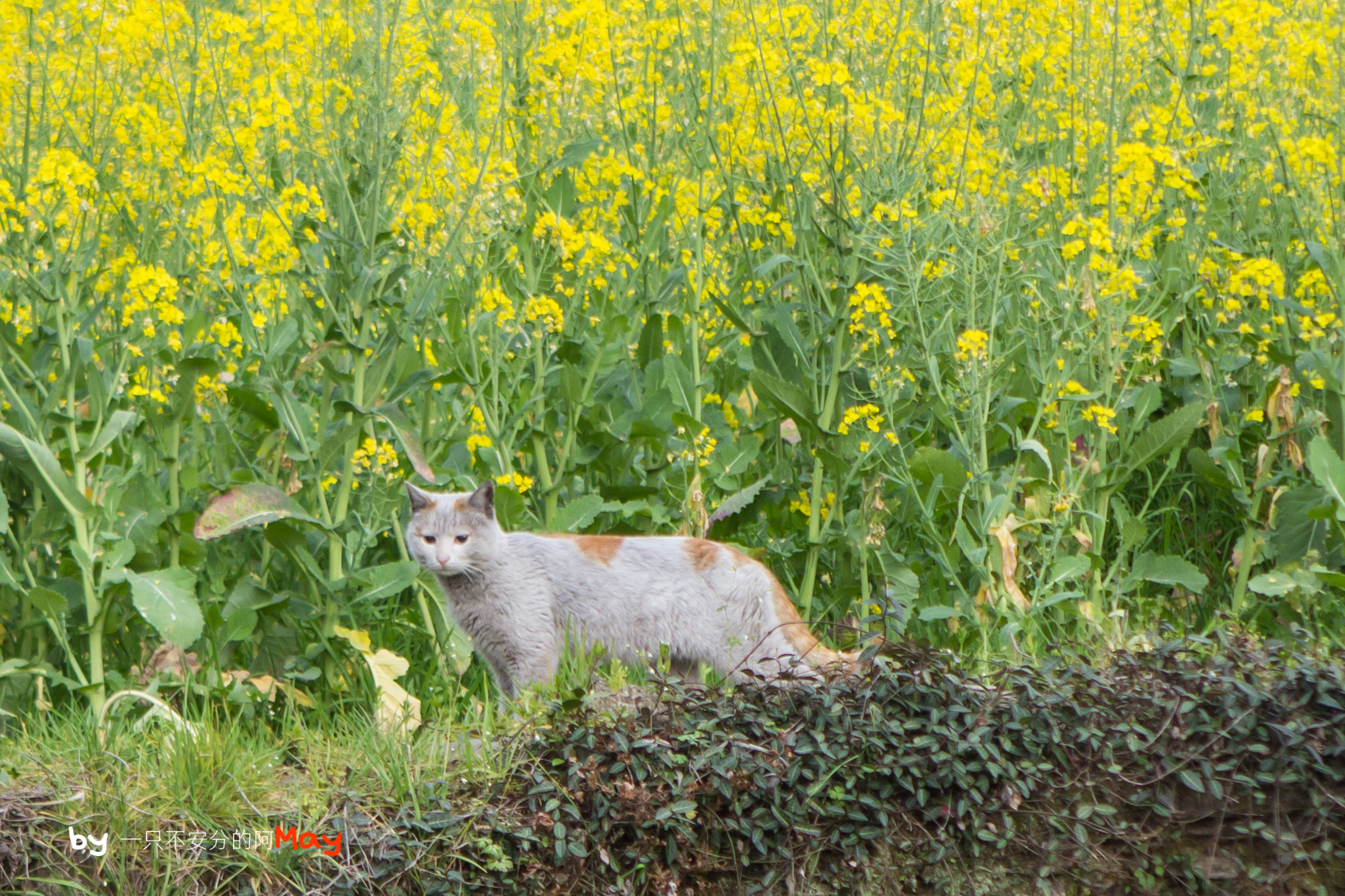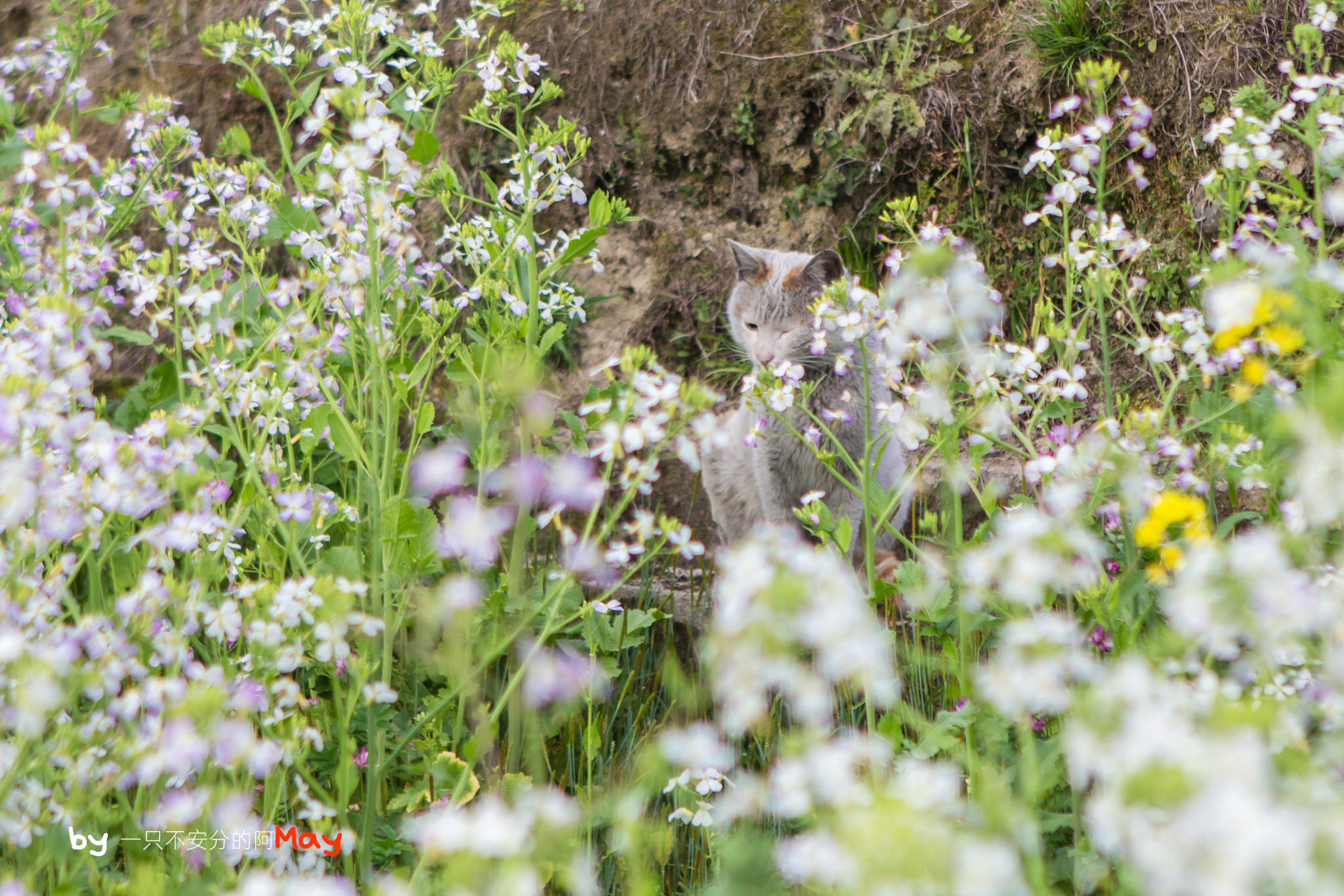 田野里偶遇了一只小猫,远远地行走在田埂上。为了不让我的相机吓到他,我先是对着花丛拍了一些,它见我没有敌意也就继续向前走了,我这才偷拍了几张。然后转过身去拍背后的萝卜花(刚开始还以为是彩色油菜花的品种,后面才了解到原来是萝卜花),没想到这小崽子也跑了过来,但与我保持了一定的安全距离,蹲在花丛中就那么陪着我一起拍照,简直太治愈了啊!