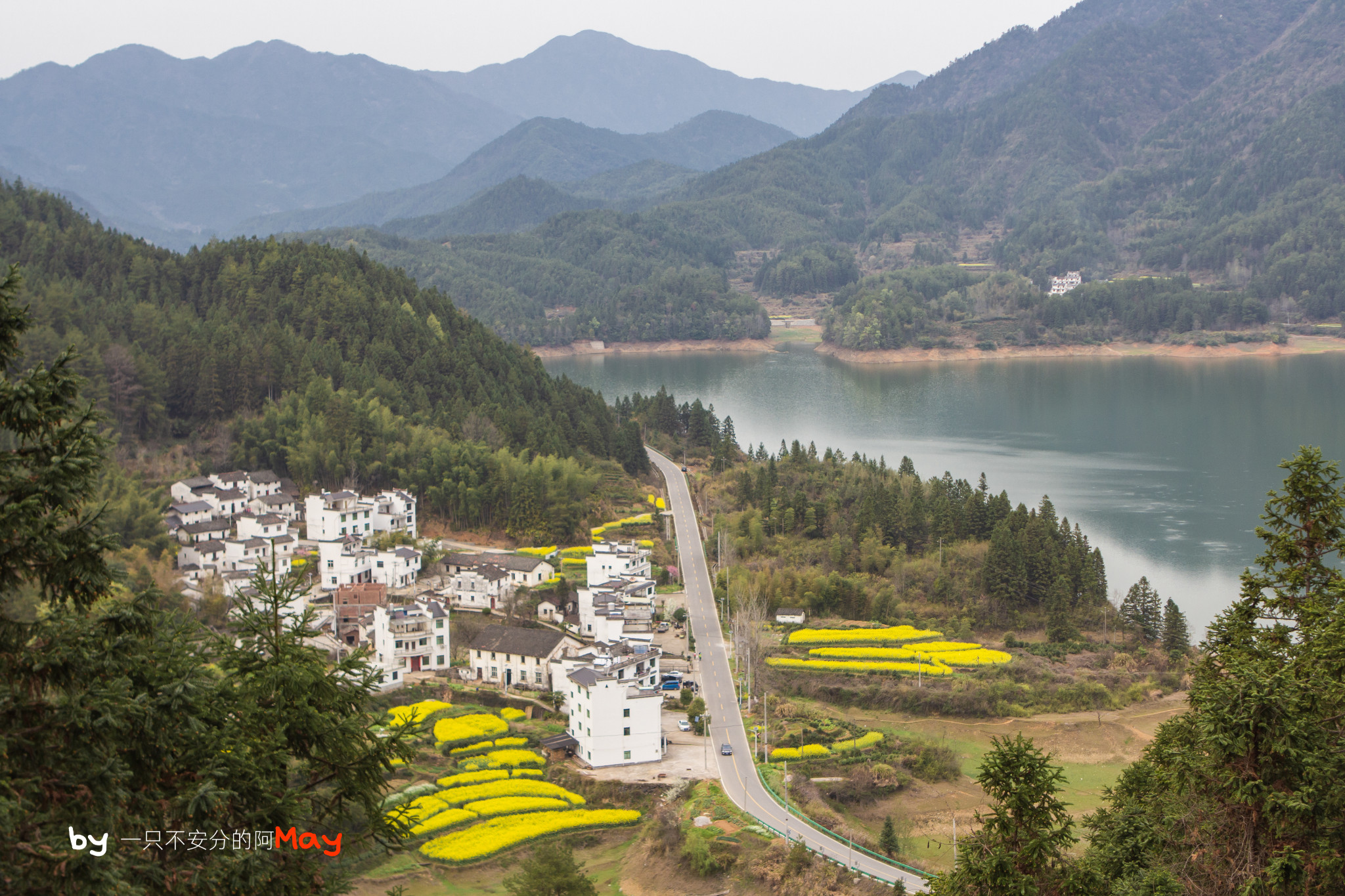 沿途只见两侧树荫遮蔽,也少见车辆和游客,说实话,天色渐暗还有点害怕。刚走不一会就看到一处开阔的平台,俯瞰能见到山下的段莘水库。据说这段莘水库原为段莘河的源头,后因截留蓄水做电站才成为了湖泊。而段莘水库四周群山环绕,海拔相对较高,因而成为了婺源风景秀丽的高山平湖。