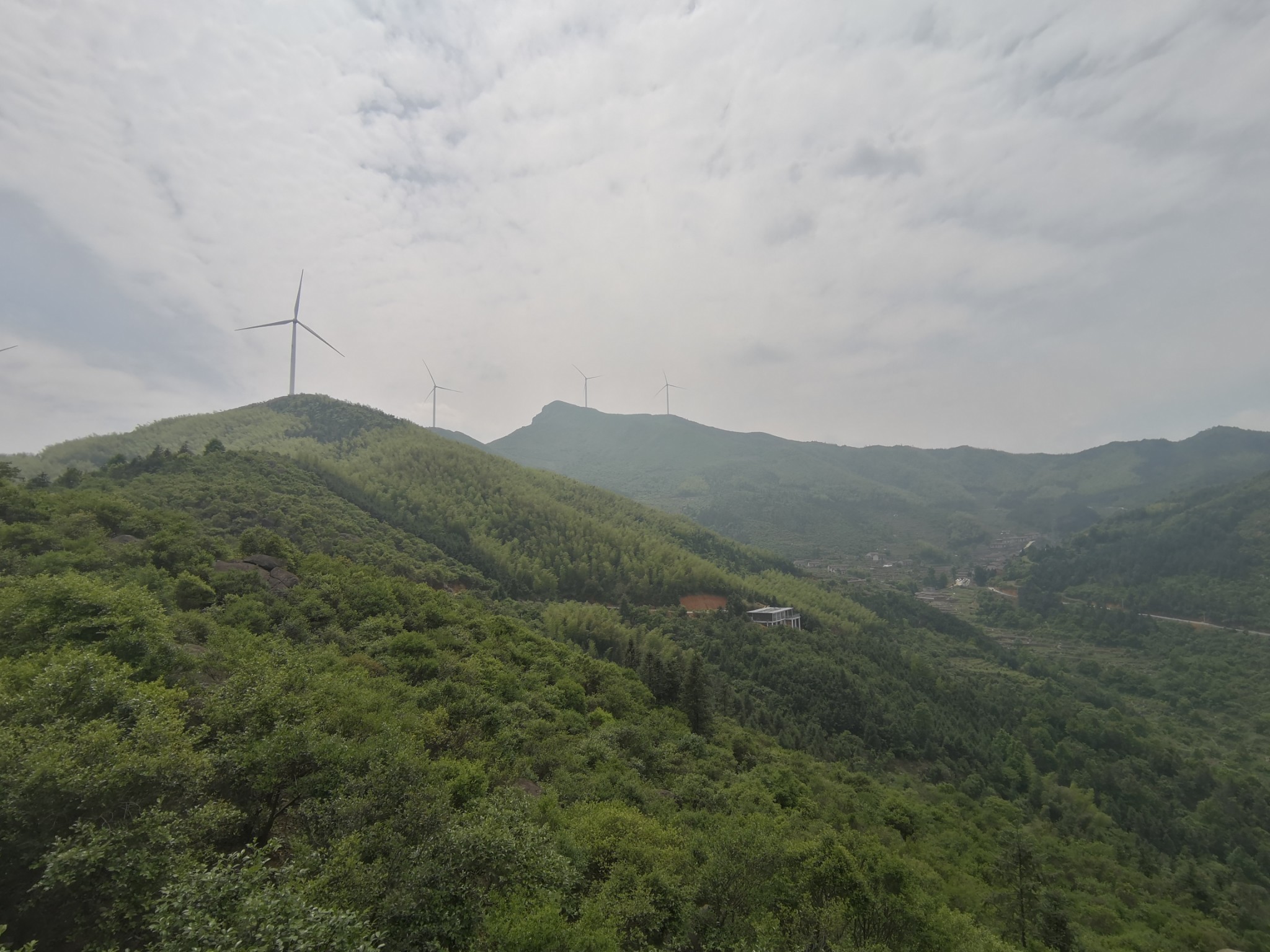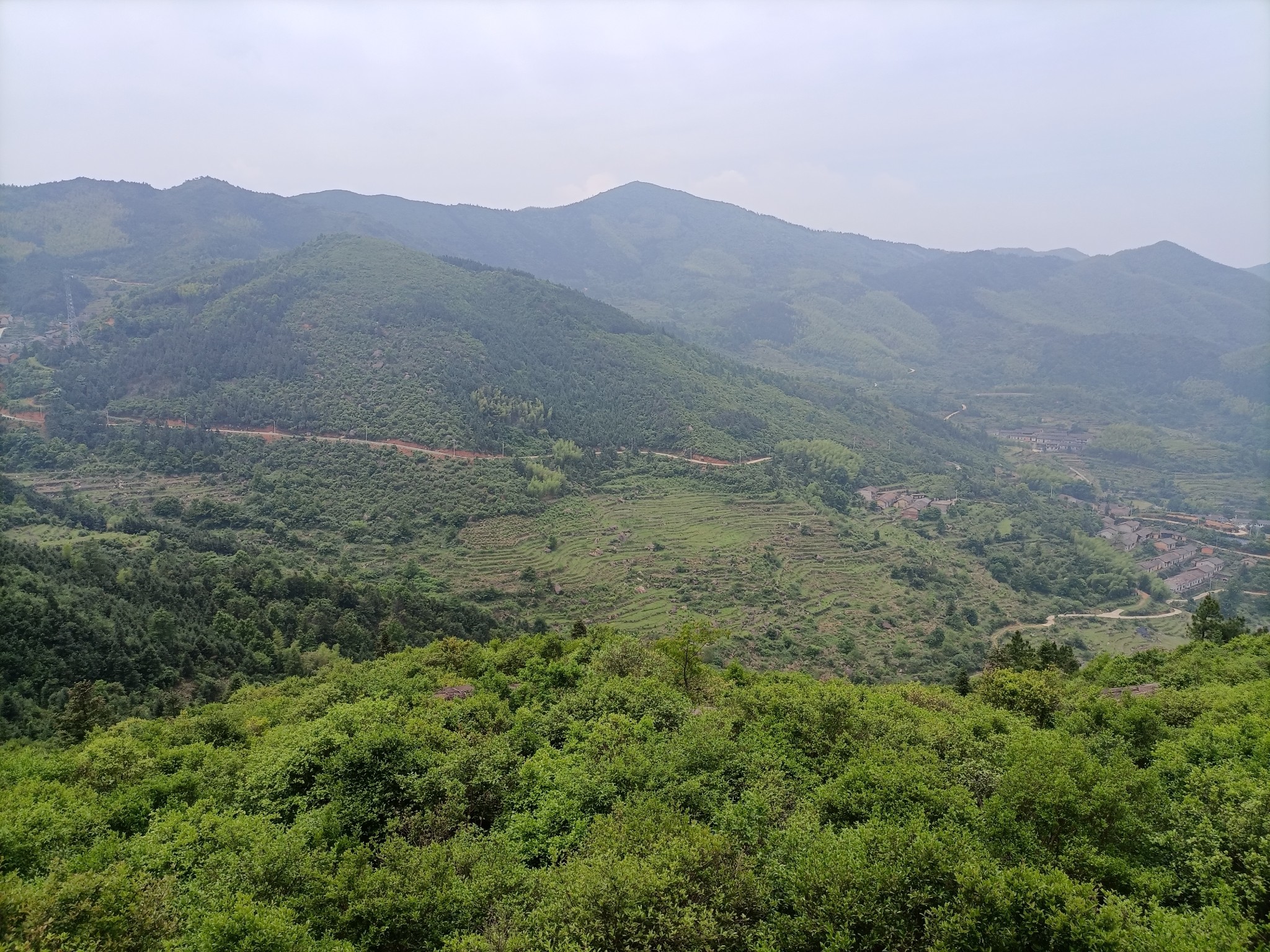 远处的最高峰为鸡笼山-石江第一高峰,近处路边的玻璃房子为新建的民宿。