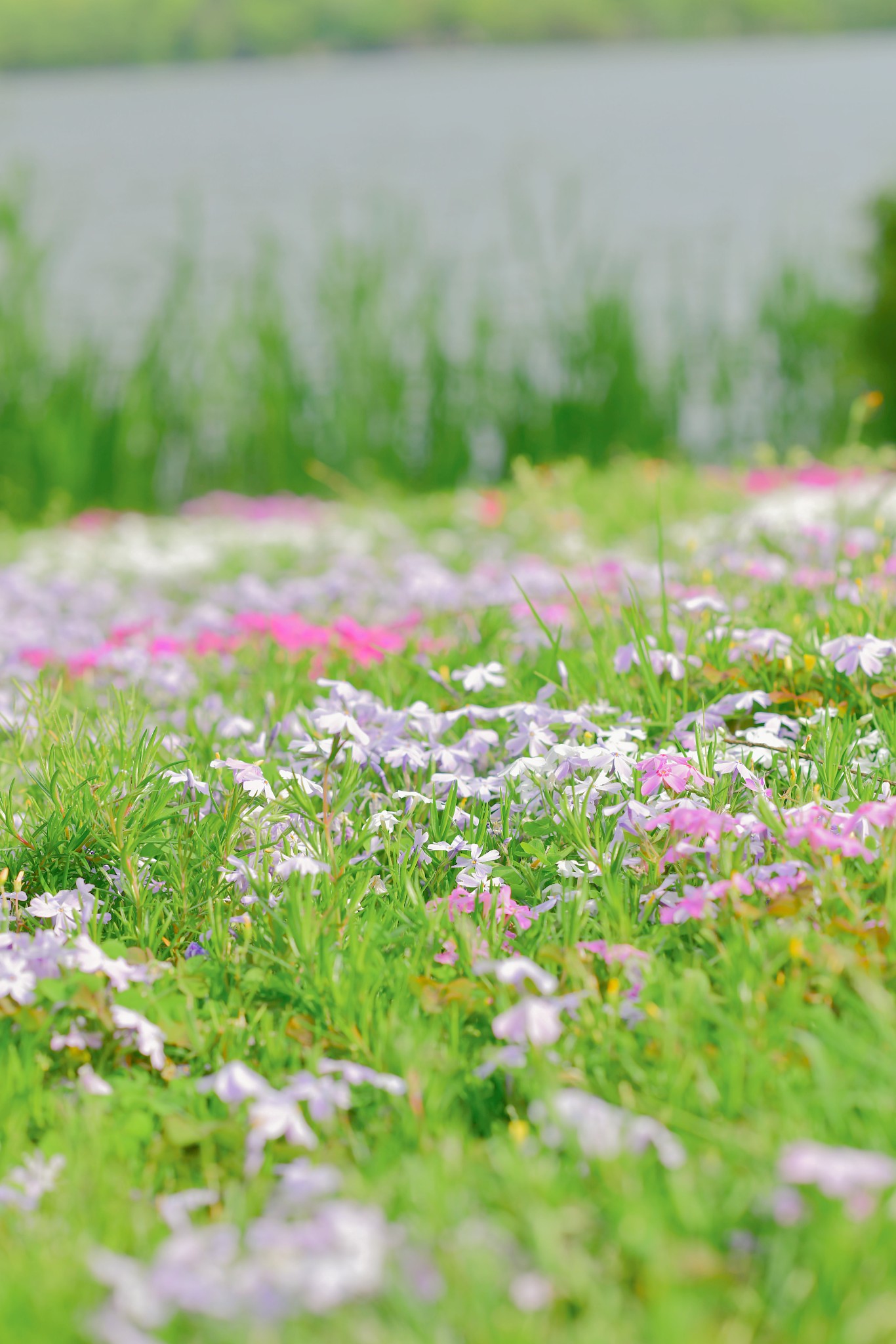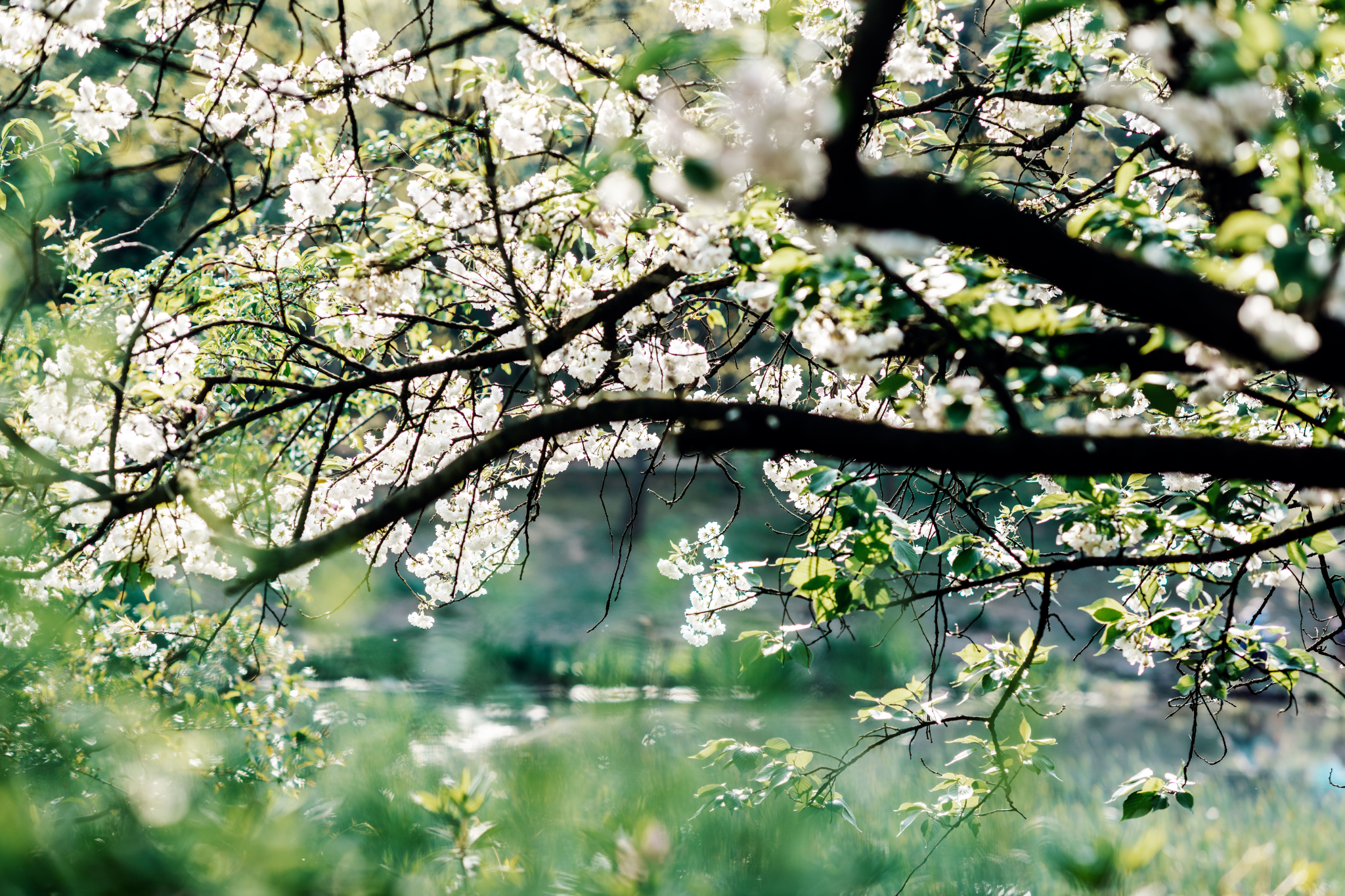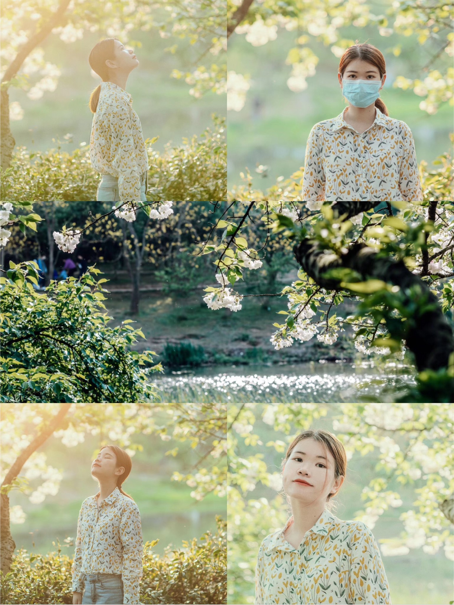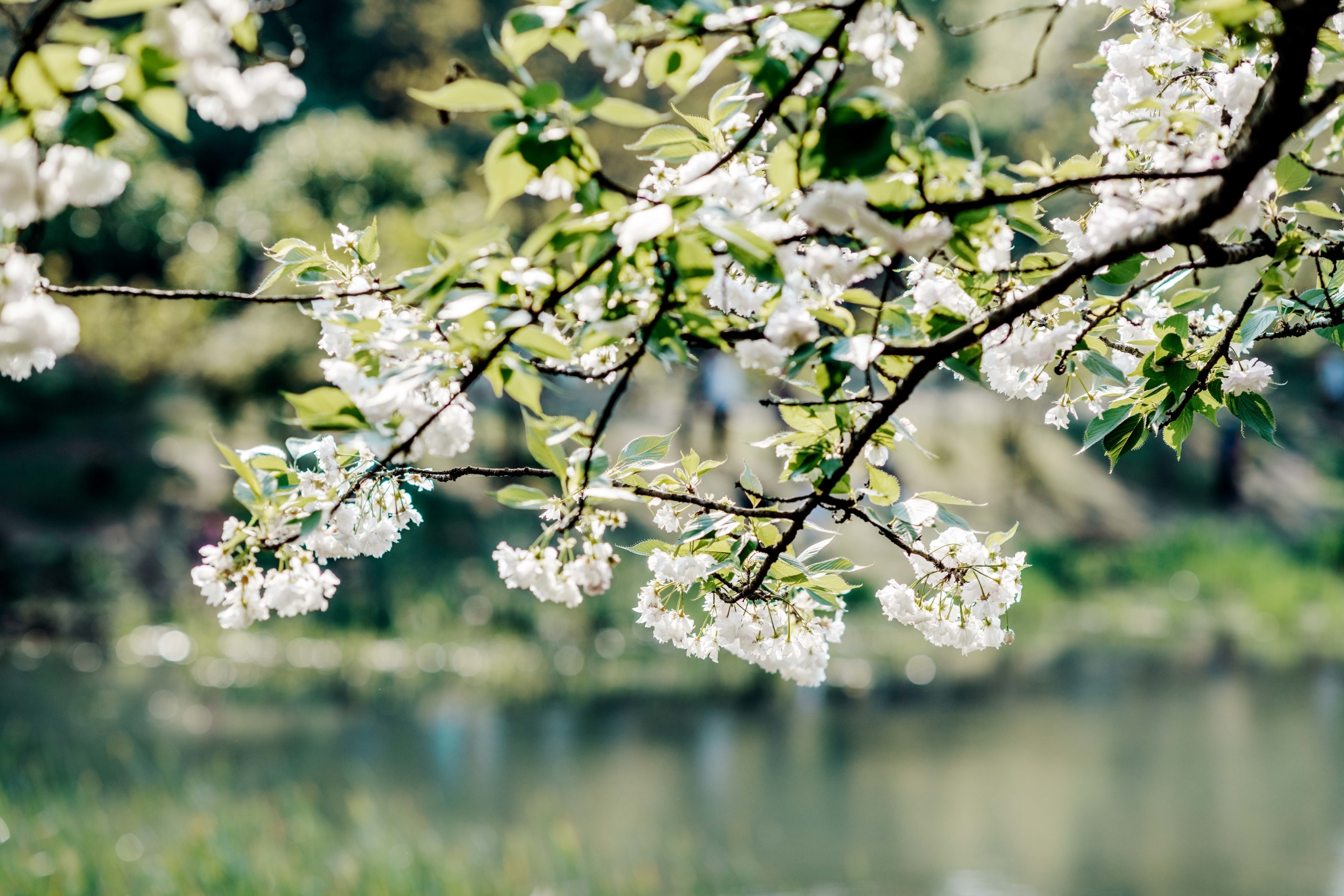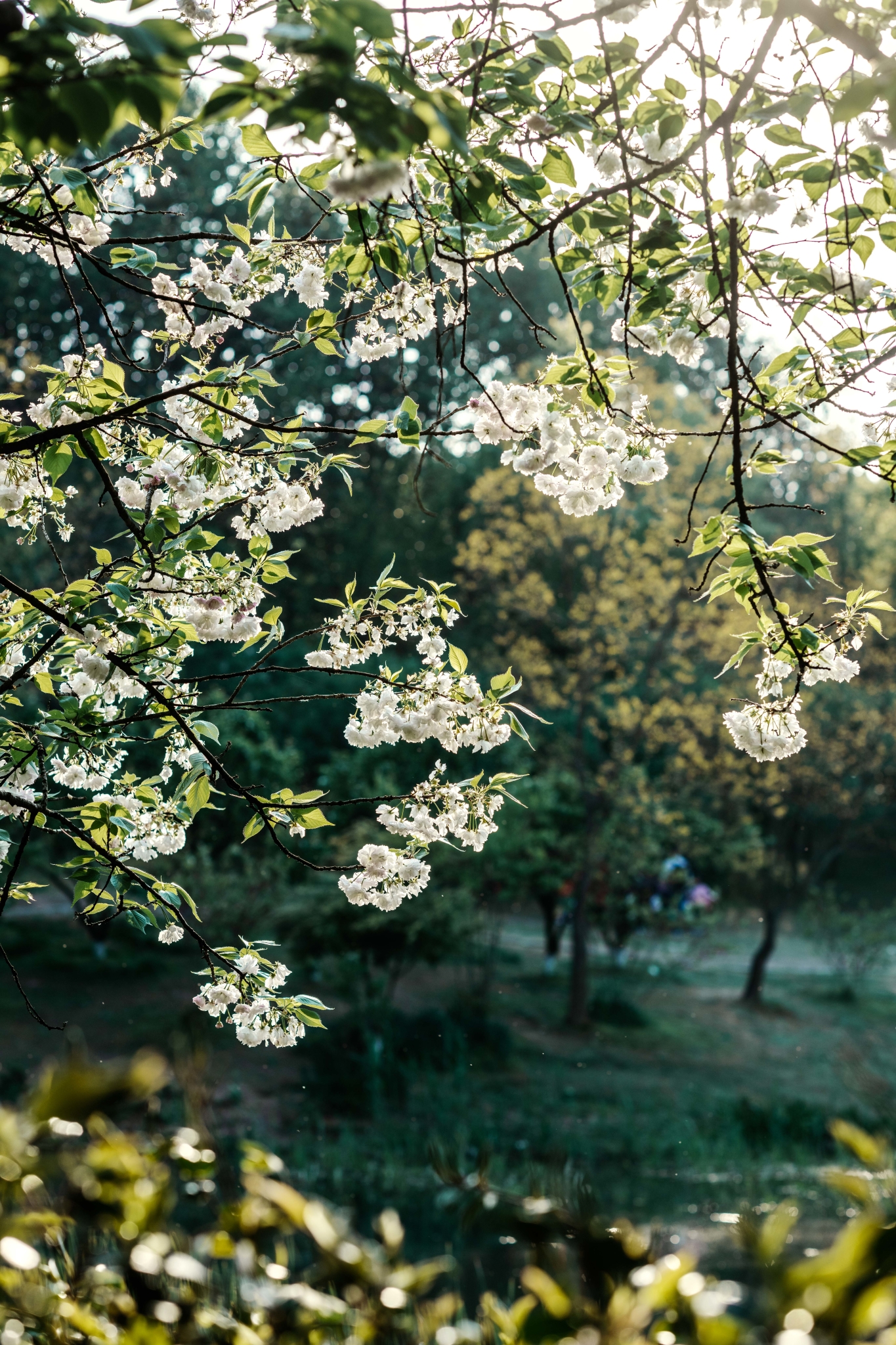 乌龟潭的潭水是蓝绿色的,白色樱花映衬之下简直不要太美,可以以湖面作为背景虚化