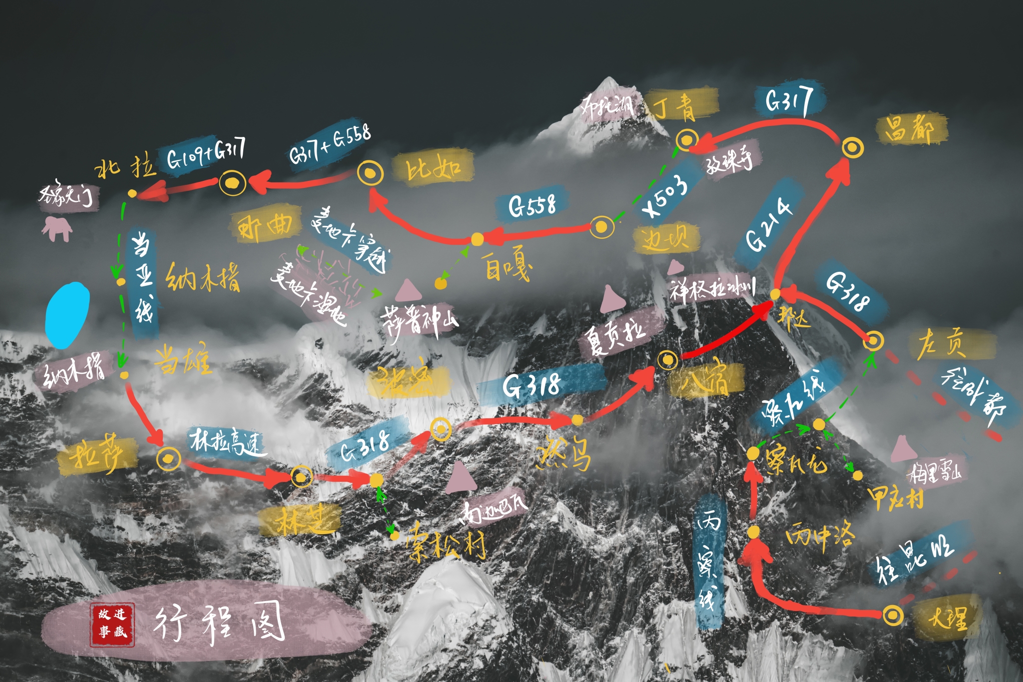 我的行程是这样的:(分割线后是回程线路,为传统的318)
