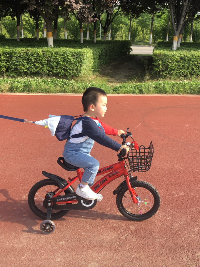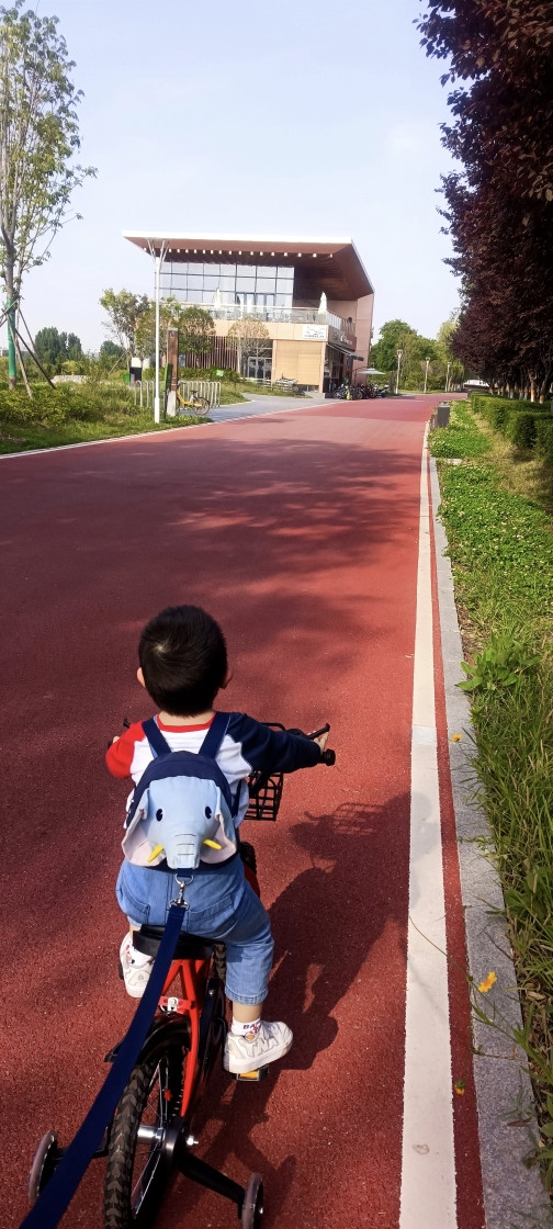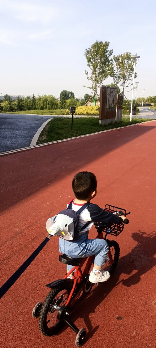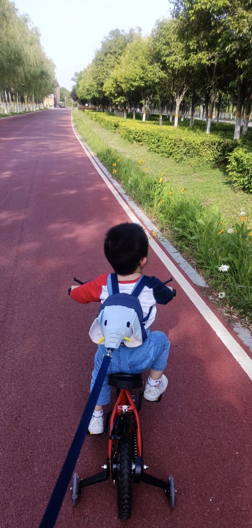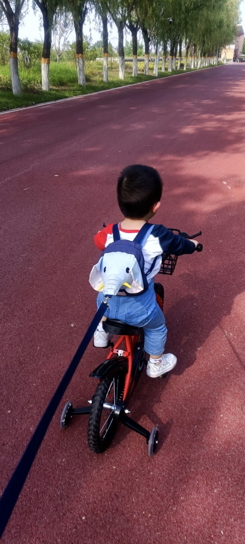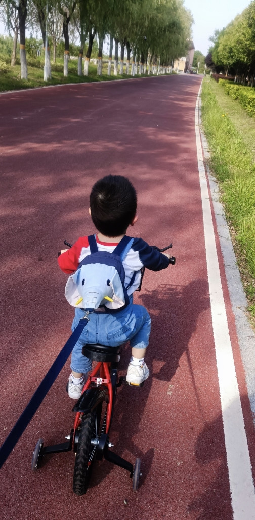 人小鬼大,不让你来扶,骑上车就跑,还好咱有准备,给稚子戴上了遛娃神器,大象背包,带子在手,看你还能跑哪去,哈哈。