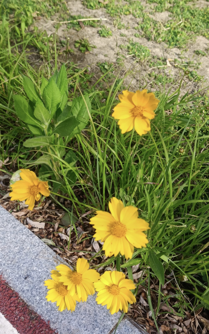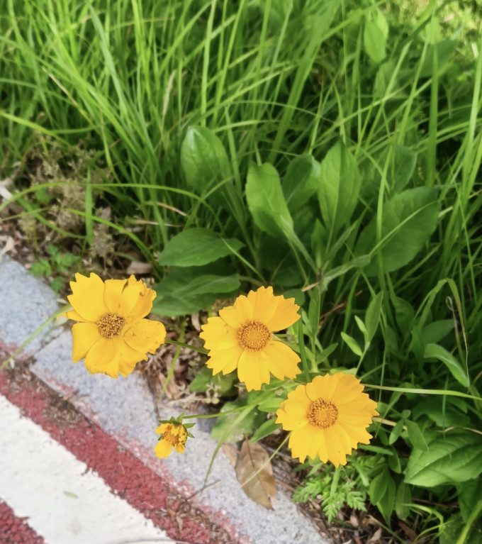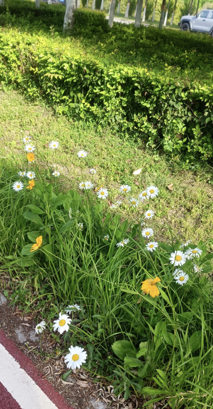 遛娃,驱车河堤,恰正阳桥下。绿道树荫蔽,道旁黄白花。