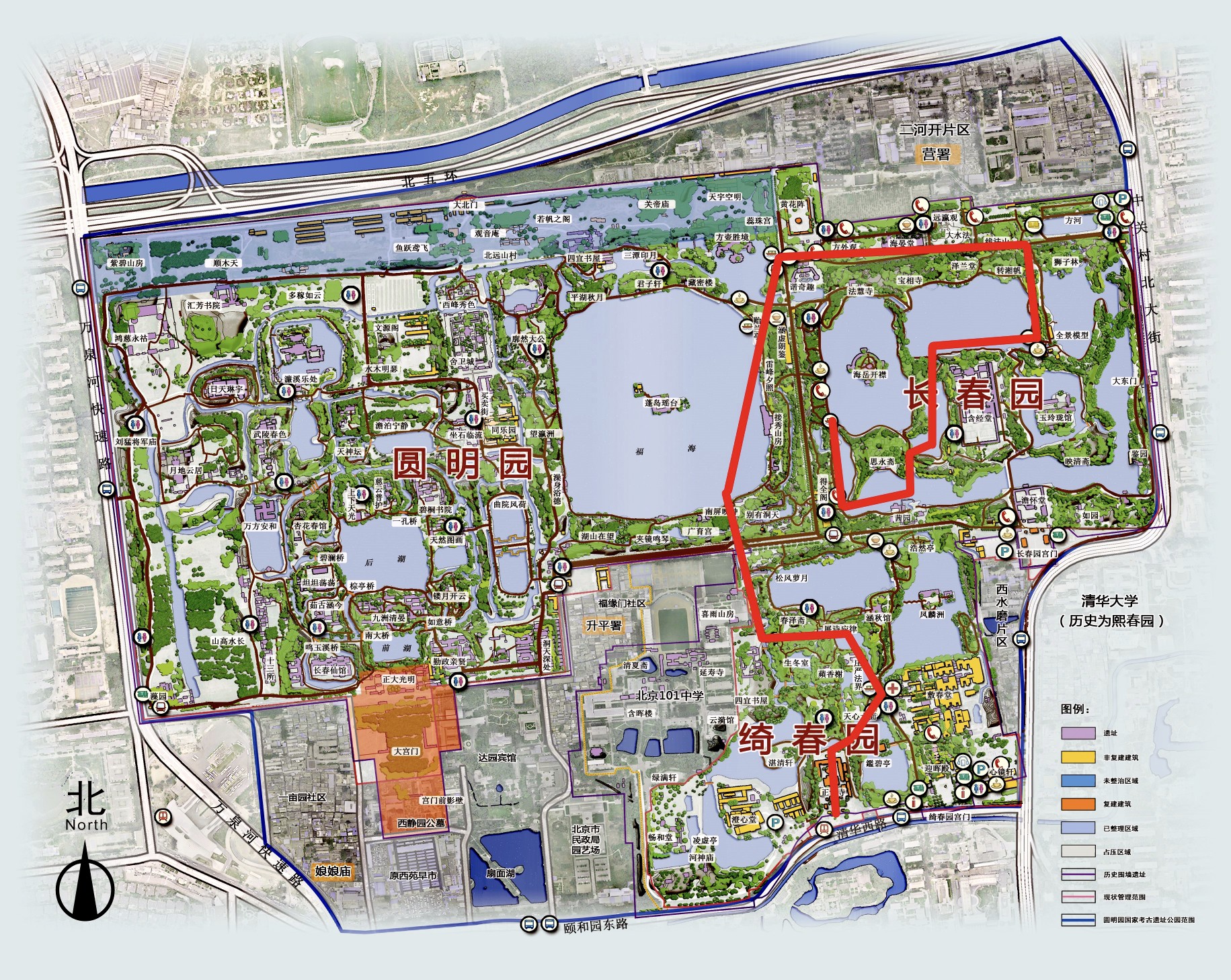 园、绮春园三园组成。占地350公顷(5200余亩),其中水面面积约140公顷(2100亩),有园林风景百余处,建筑面积逾16万平方米,是清朝帝王在150余年间创建和经营的一座大型皇家宫苑。