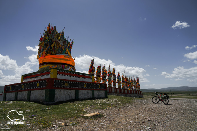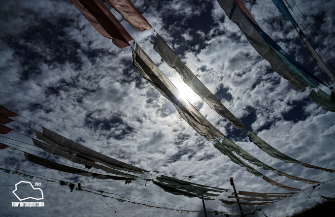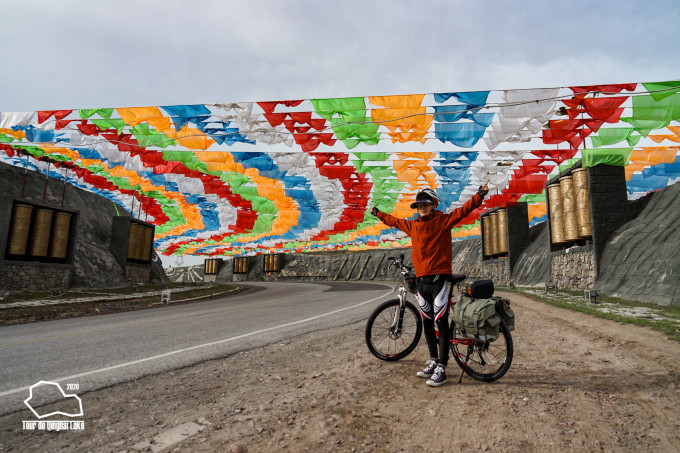 过了“原子弹射击营”,有一个两公里长的上坡。不仅是上坡,还是逆风。骑到坡顶看到山口两侧挂着经幡,在风中猎猎作响。