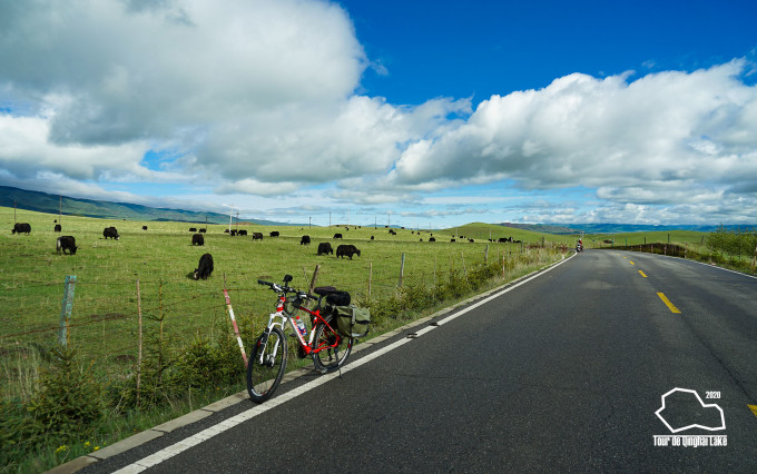 走上柏油路没多久就开始爬坡,两侧都是嫩绿的草地,一直延伸到远方的山脉,成群的牦牛点缀其中。云层碎裂成朵朵白絮,天青如洗。