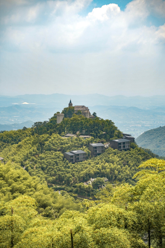 沿台阶登上二楼,可看到莫干山全景,眼前翠绿一片,参差楼台,竹海别墅,尽数铺展于眼前。难怪古人总爱登高远眺,立于山巅举目四眺的心境是完全不同的。当大千世界的悉数美景徐徐展于眼前,我们很难再悲悲戚戚、怨天尤人,仿佛通过这满目苍穹的绿,我们可以抵达繁星。
