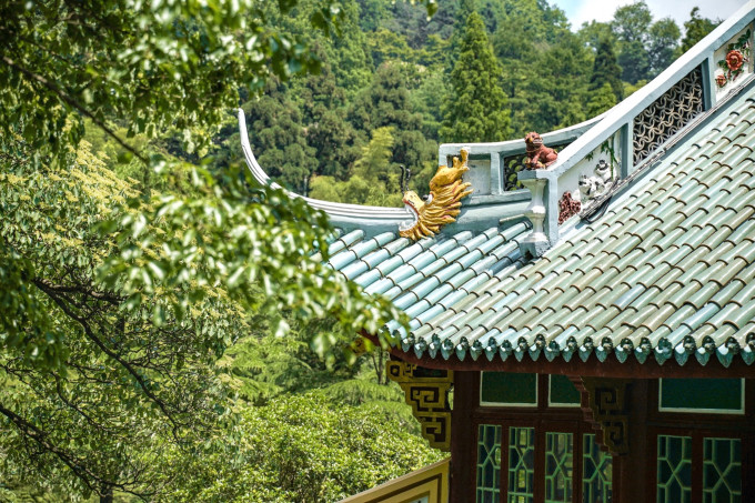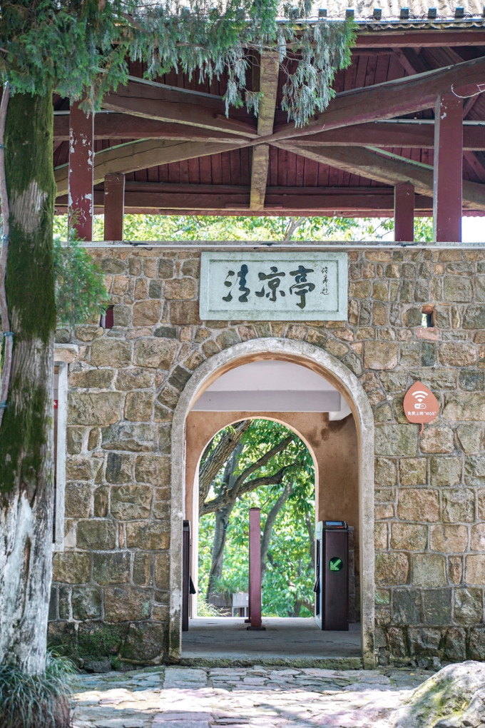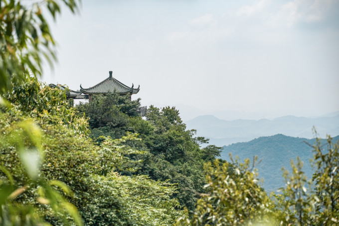 从停车点身后的岔路走下来,没几步路先看到一个气派的门楼——清凉亭,这里是抵达旭光台的检票口,过去再走几步山路,就能看到前方山尖上飞起的屋檐,那就是旭光台了。