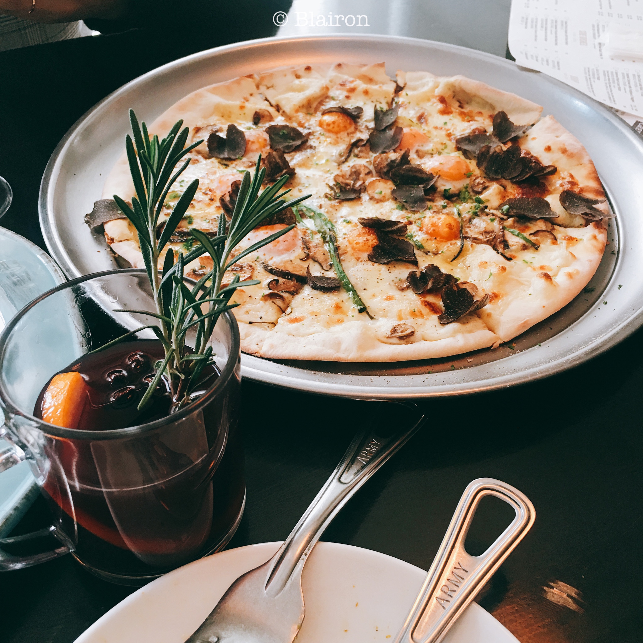 「松露牛肝菌蘑菇披萨」现烤的松露味很浓郁,一般不爱吃薄披萨但是这个真的不错。人少的话每次都没有吃完,因为分量真的太大了!