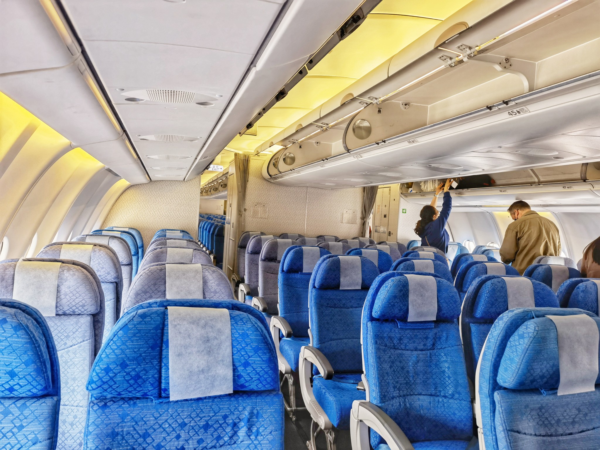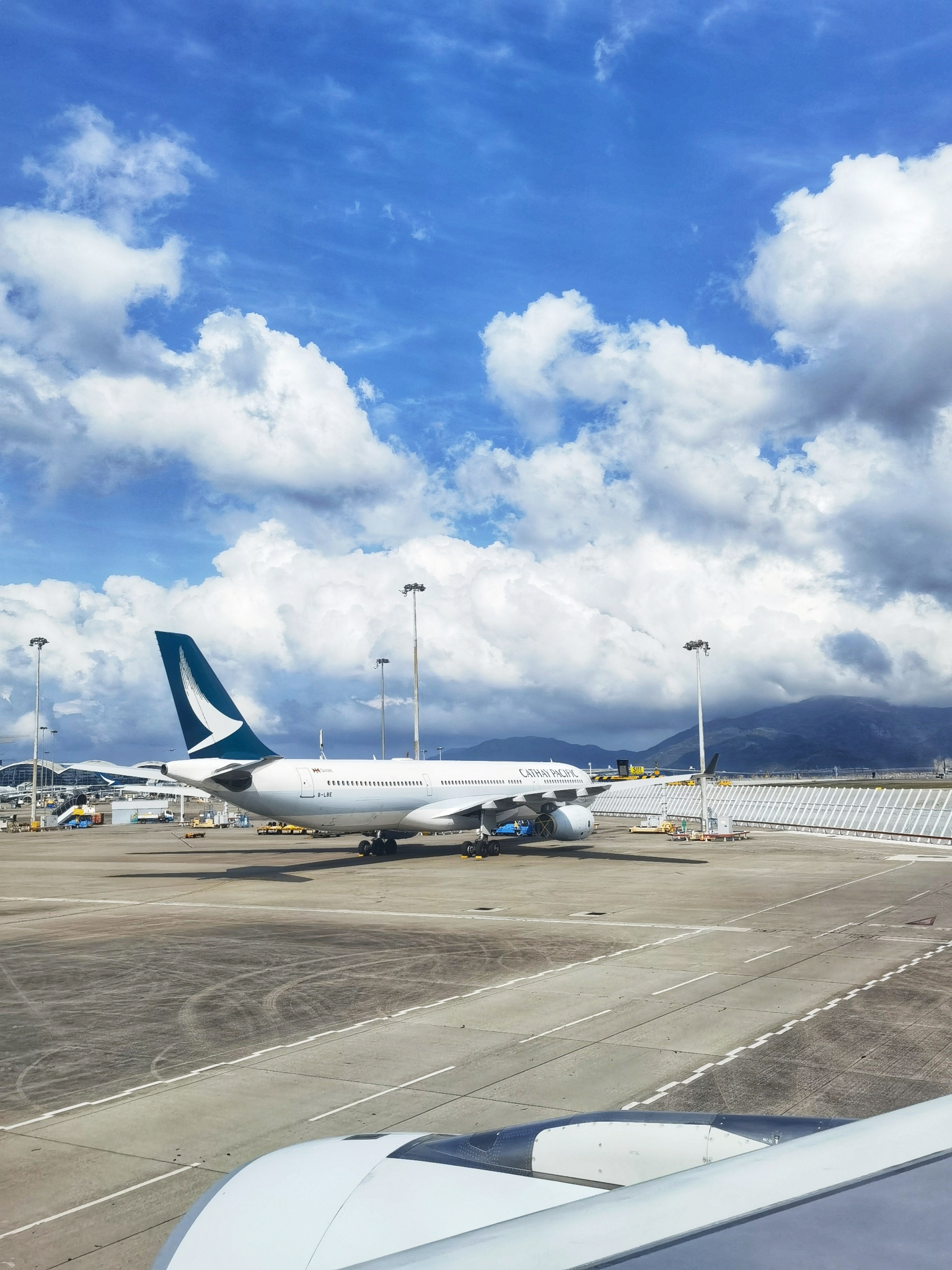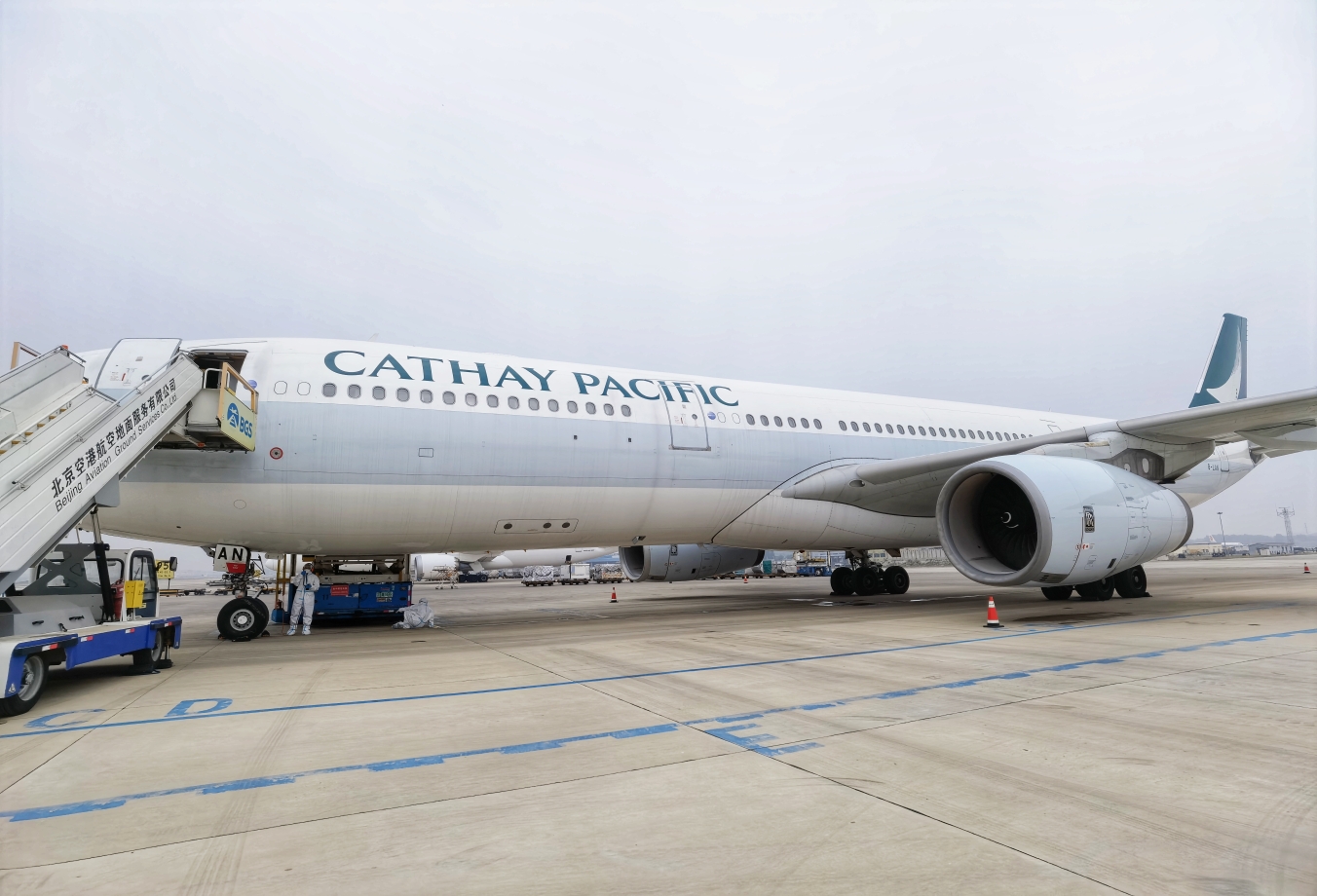 从摆渡车上下来,国泰的航班就在眼前,竟然是一架空客330,可实际上整架航班的乘客还不到80人,用一架大飞机来运送乘客莫非还兼了货运的任务?