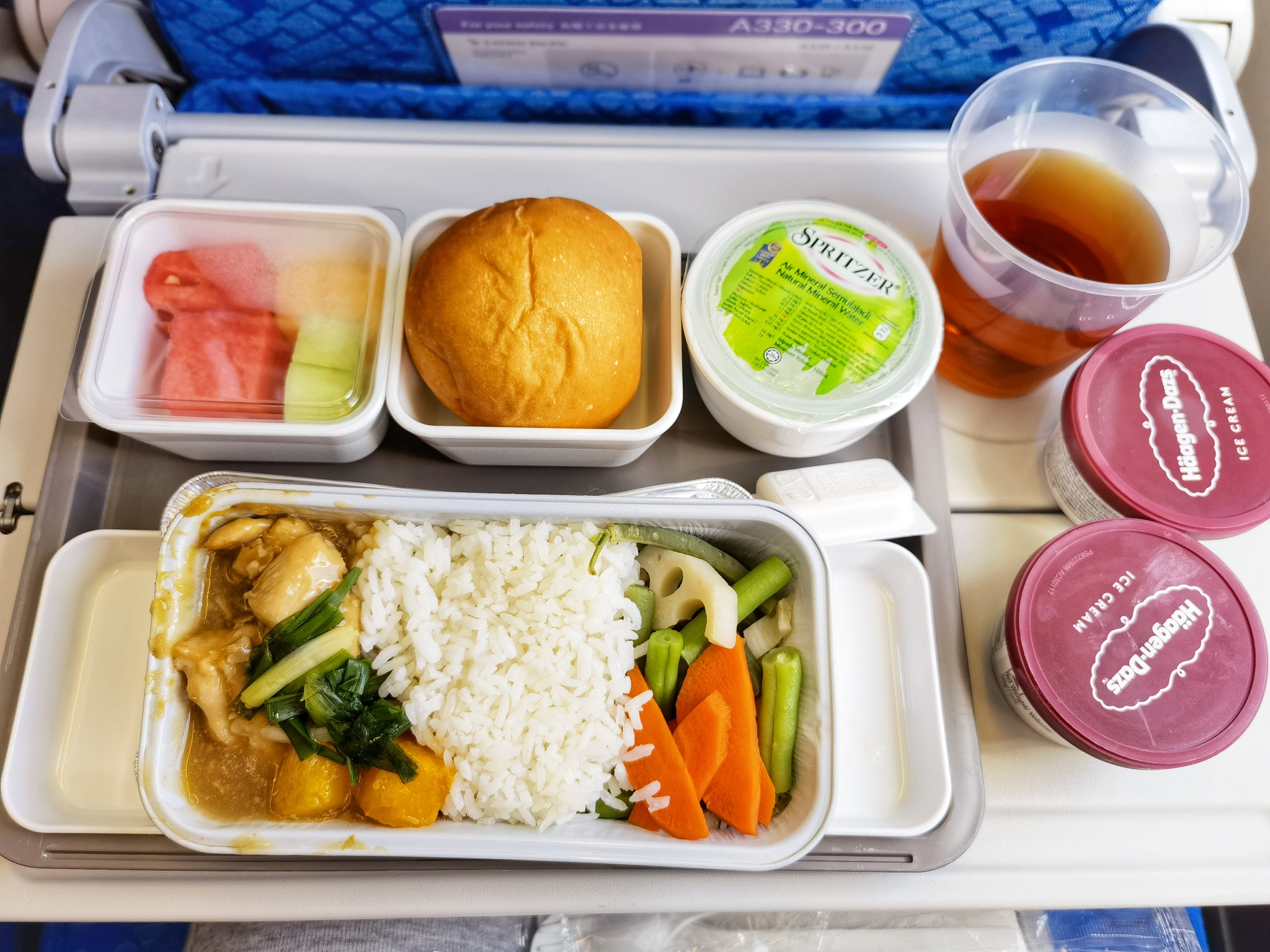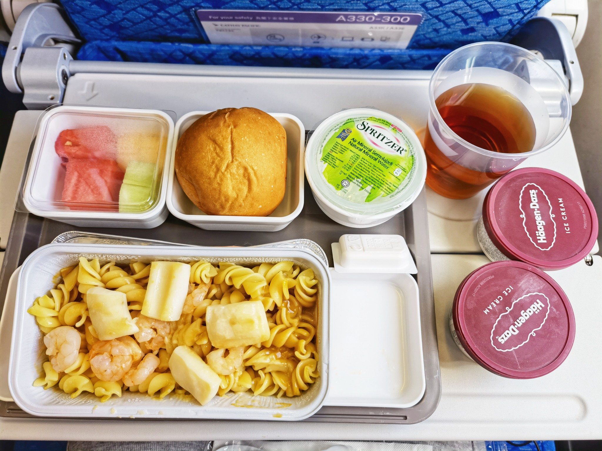 国泰的飞机餐质质量一直不错,午餐提供的是海鲜意面或鸡肉米饭,味道都不错,而且这么多年来,他们一直没有放弃随餐附赠冰激凌的传统,即使是在运营不景气的情况下也是如此