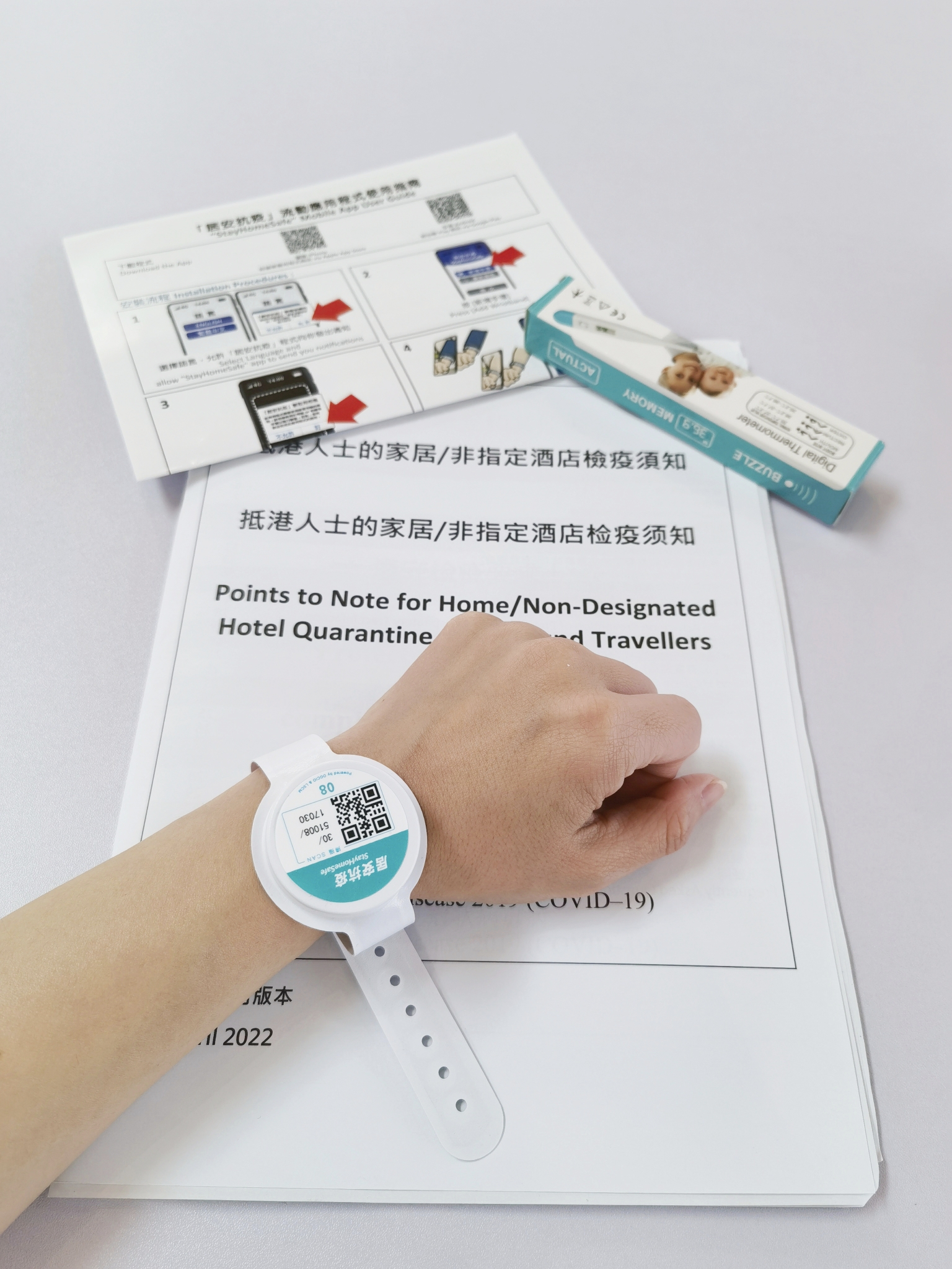 测完核酸以后还有其他的入境流程需要完成:机场办事员会为你戴一个隔离手环,这个防水手环可以显示定位,无论是运动和洗澡都不能摘下来。另外他还会为你派发香港“健康蓝码”和健康认证书,并写好解除隔离的日期和时间。这些流程办下来需要不少时间,但是毕竟核酸结果没出来也不能离开,所以大家都不急,慢慢办理