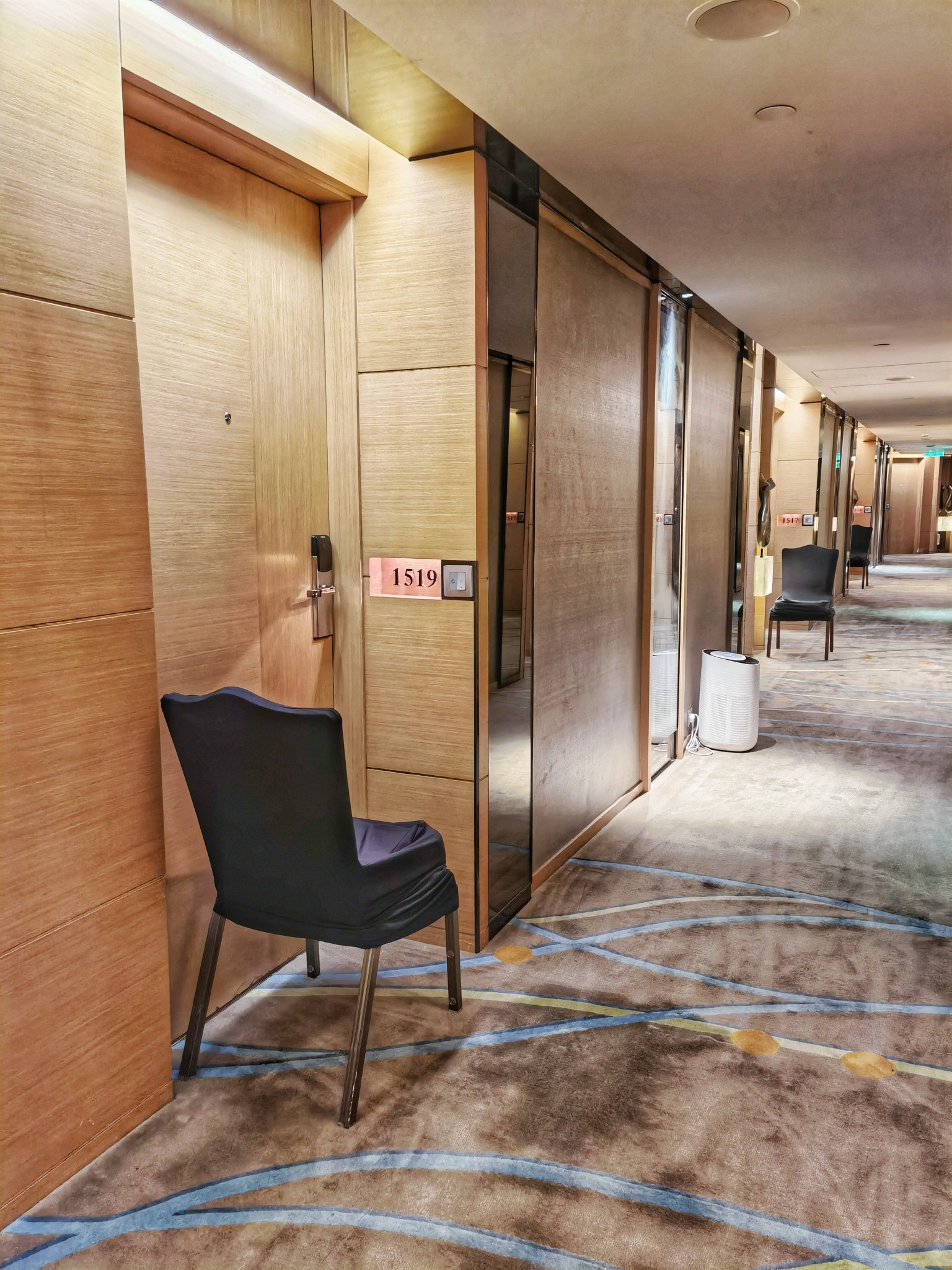 下图便是内地旅客的隔离专用层,每个隔离房间的门口都放了一把椅子用来接收外卖