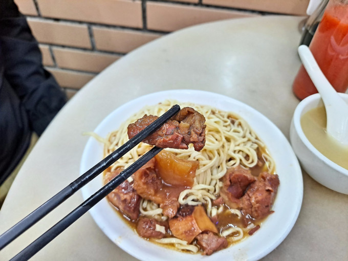 说了这么多,其实我们之前对“伊面”这东西是闻所未闻,在店里陡然见到这么大的“方便面饼”,忍不住好奇的左拍右拍。坚记开业至今已经快七十年了,店里处处可见浓浓的年代感,虽然不是饭点,七八张桌子却坐满了人,本着节约肚皮的原则(其实真的吃不下),我们两人点了一碗招牌的“牛腩捞长寿伊府面”。