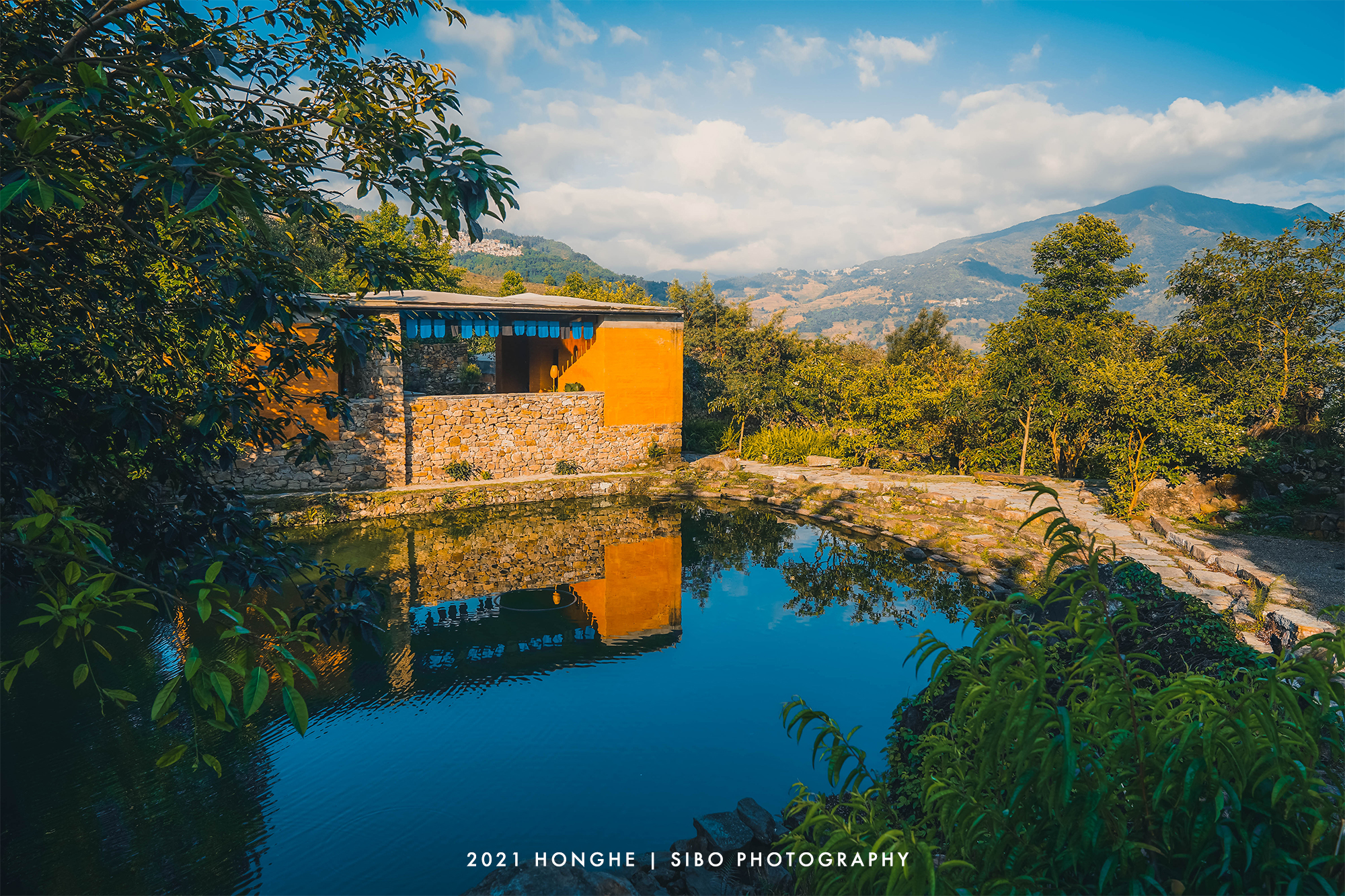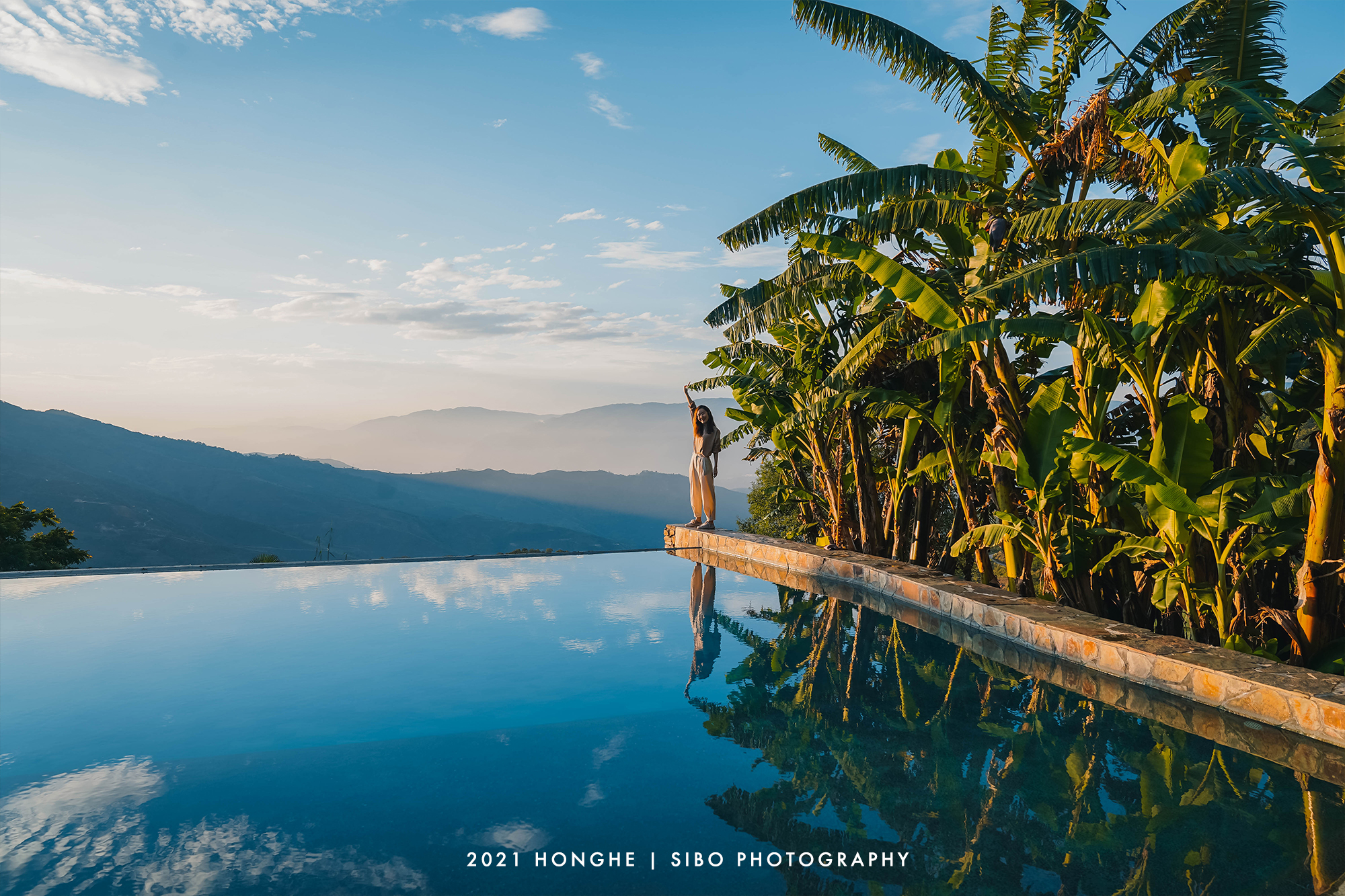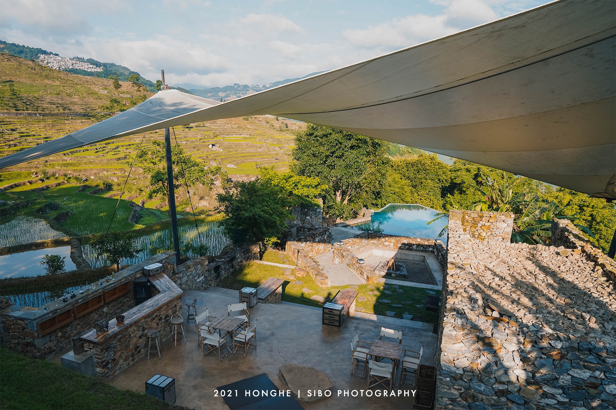 站在泳池边上向外看,就是一层层、一道道、连绵不绝的梯田。远处山脉漫起薄雾,在山谷梯田中游动,就像一副山水画。