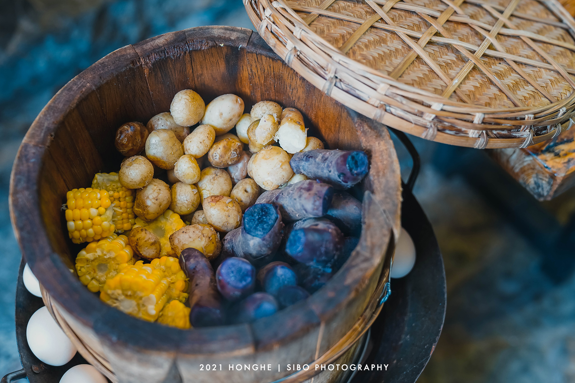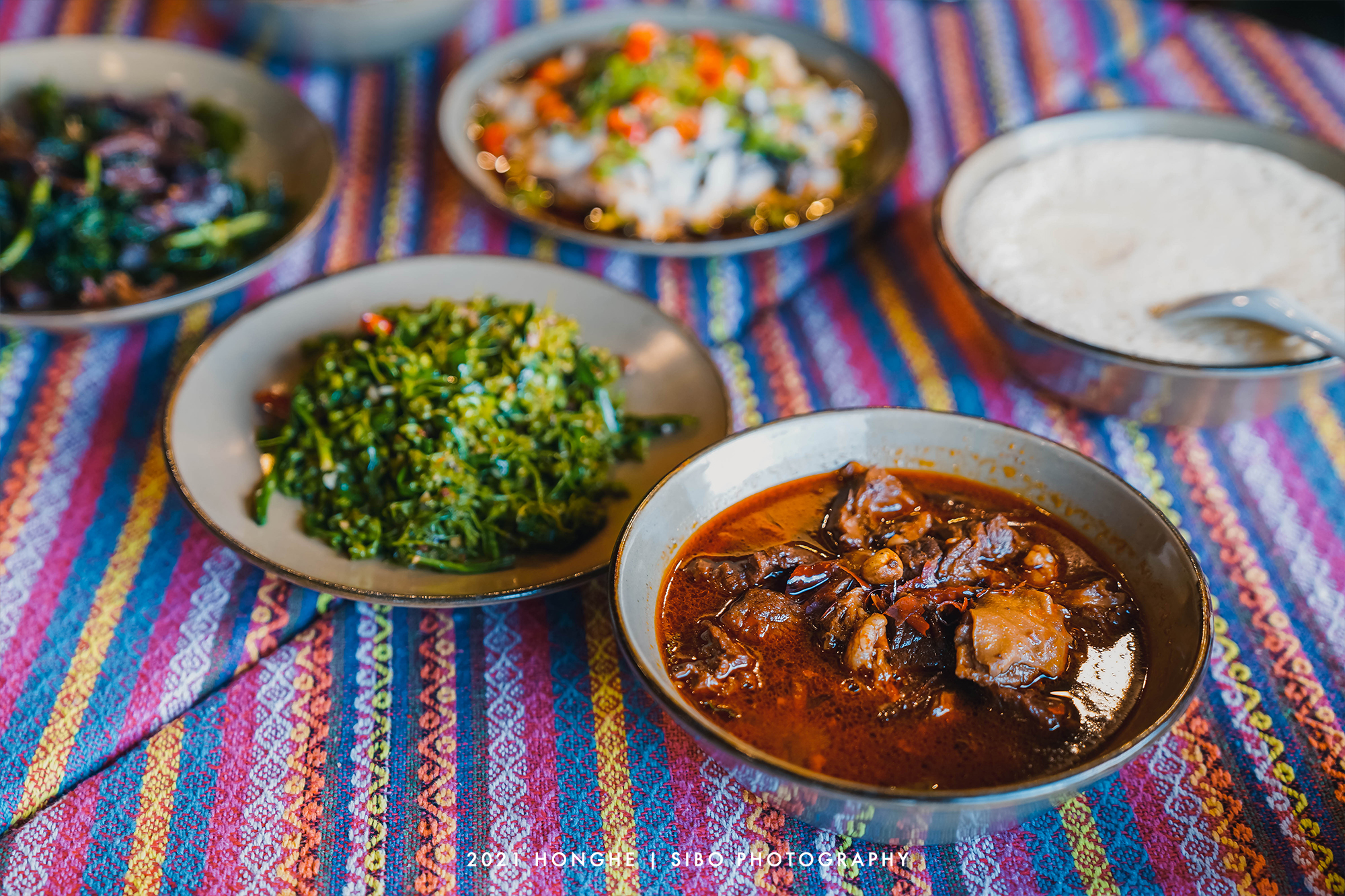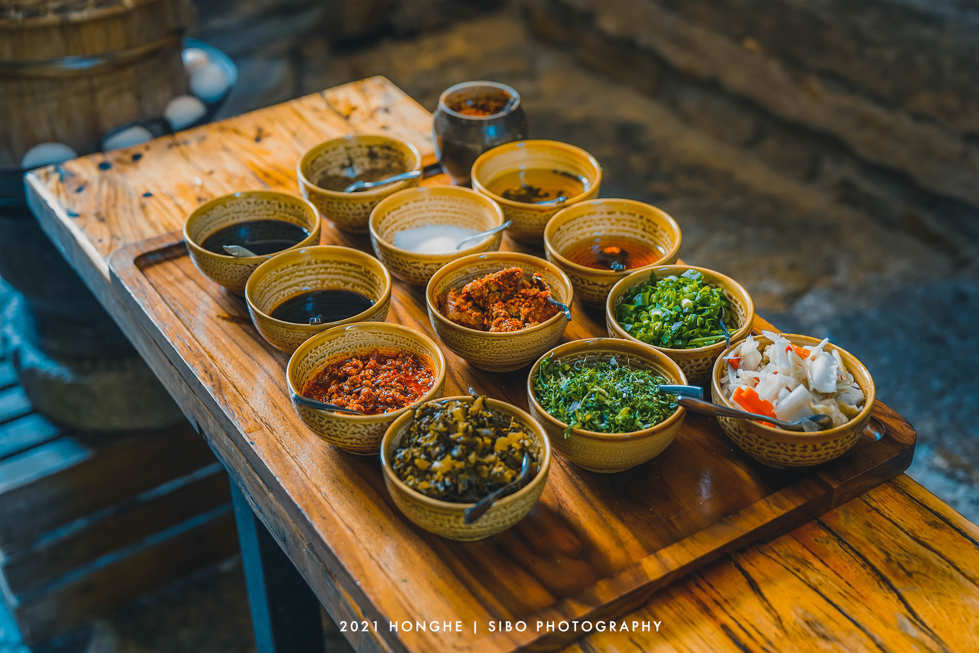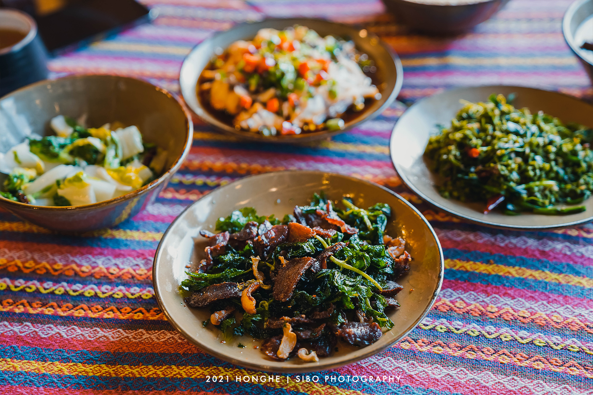 每日的房费已包含了一日三餐的费用,这里没有菜谱,厨娘每天根据采买到的本地食材来做哈尼特色菜,菜不够吃还可以再加。黄牛干巴、山茅野菜、梯田鱼、哈尼蘸水鸡,一道道家常美味小炒,感受山间野味。