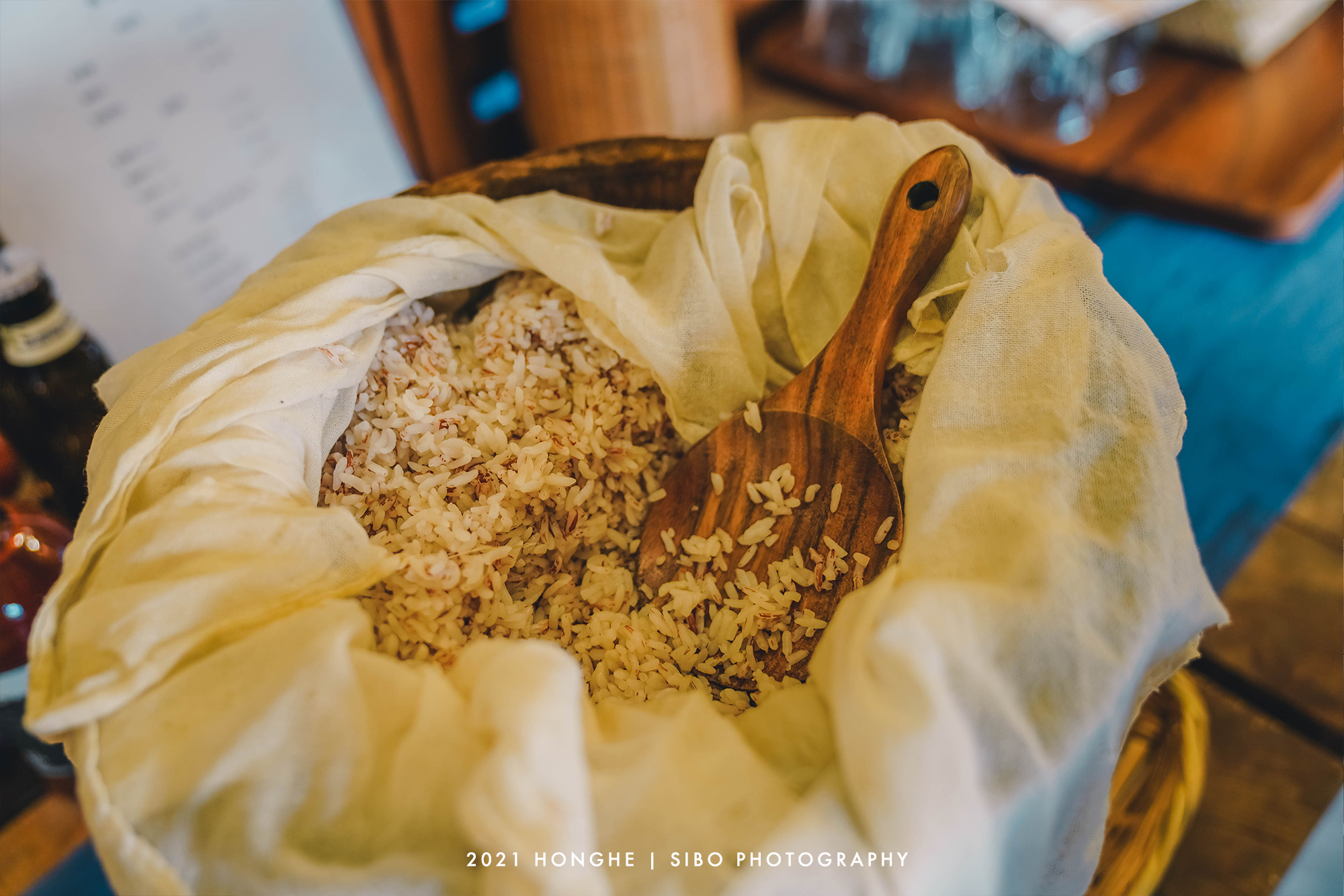 米饭是哈尼梯田红米,一年仅长一季。米粒只有外皮是红色的,里面是富含淀粉的白色,很有嚼劲。