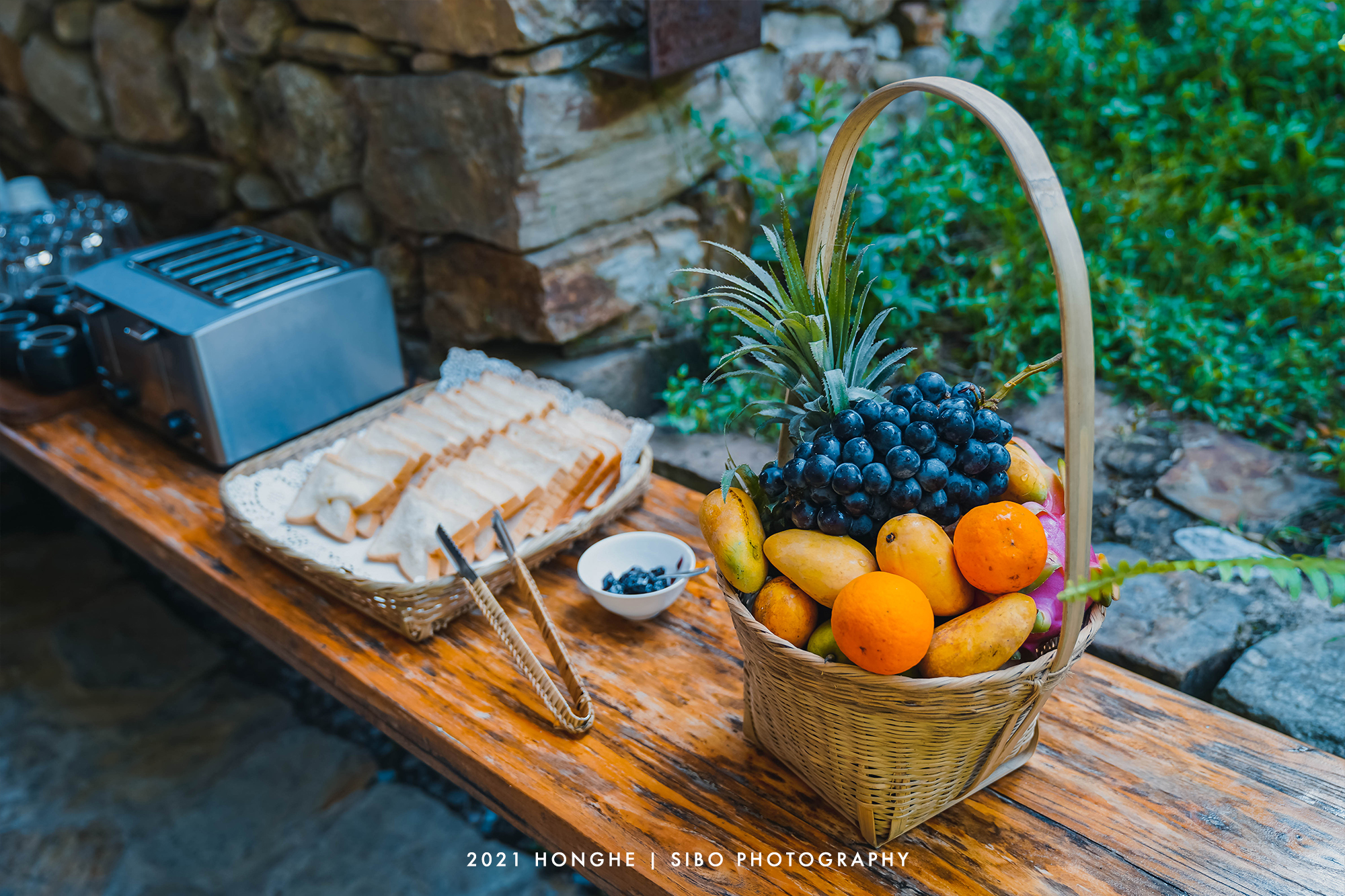 早餐是半自助的形式,食材依然延续着就地取材的形式,炭炉上熬着白粥与豆浆,篮子里放着应季水果,竹笼里蒸着五谷杂粮,按需自取。