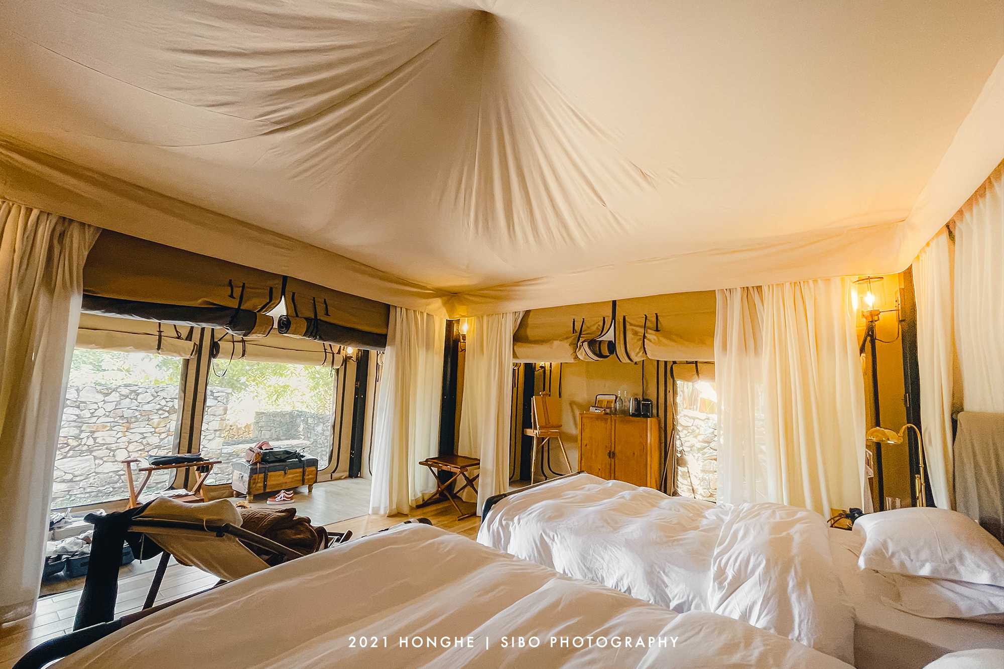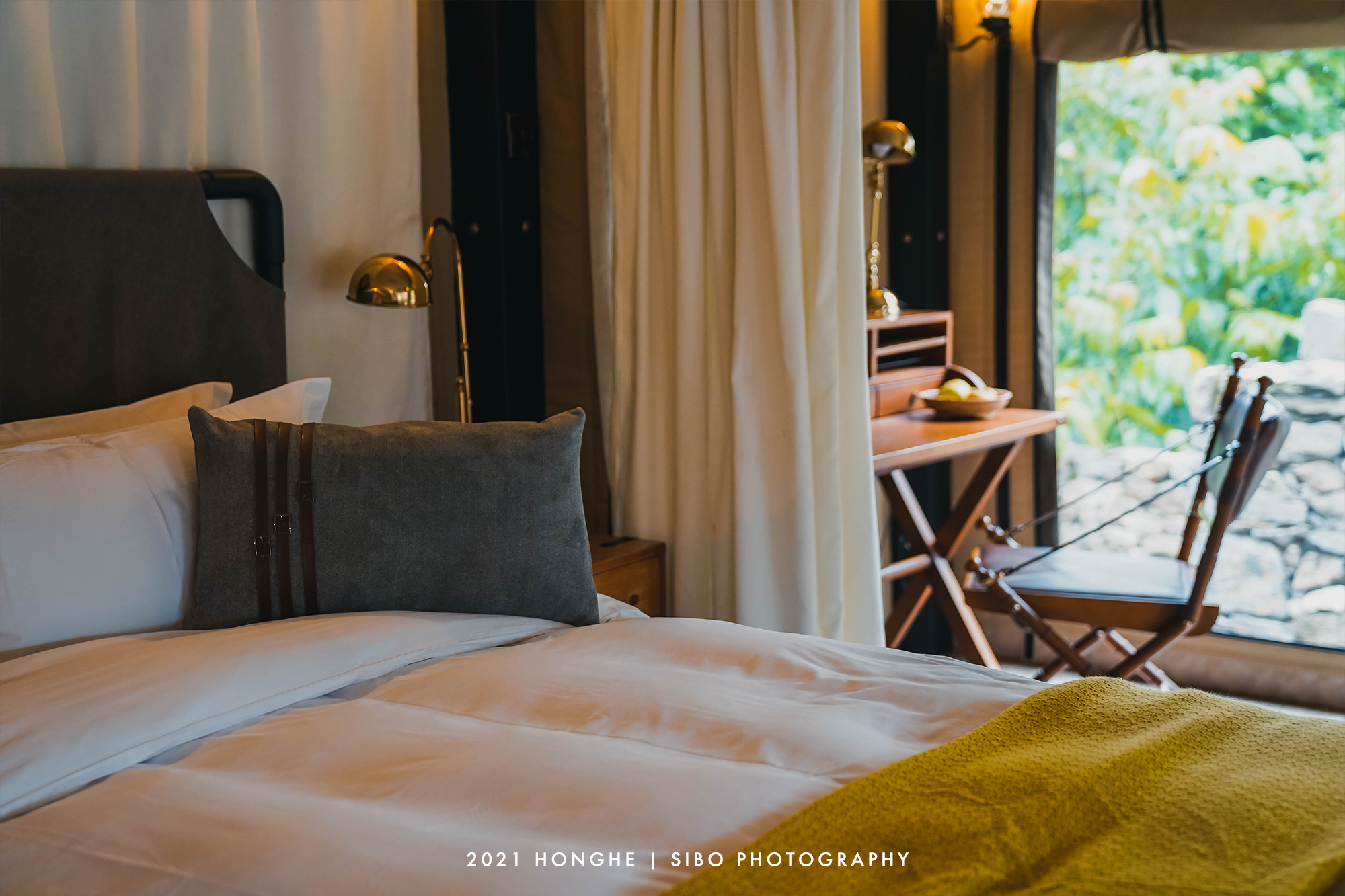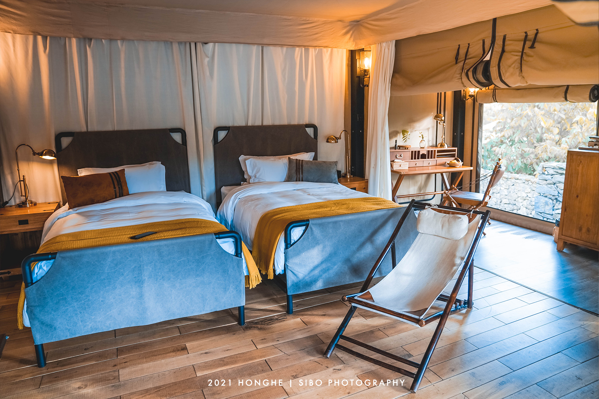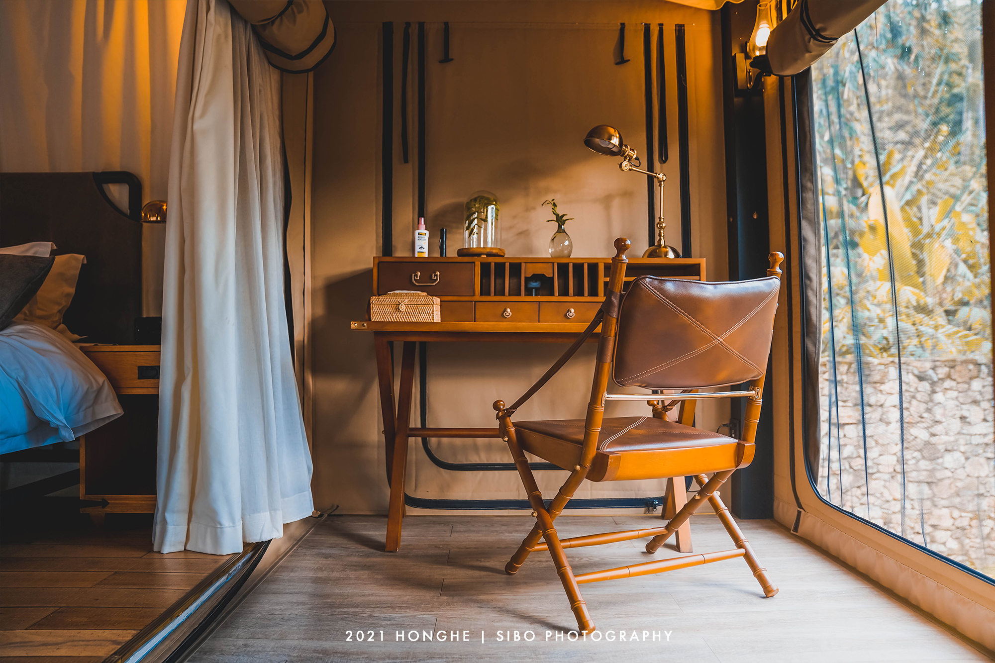 舒适的大床、木质地板、放松的躺椅、精致的床头柜与酒水柜,虽然外观是帐篷,但室内提供了不亚于星级酒店标准的舒适度。