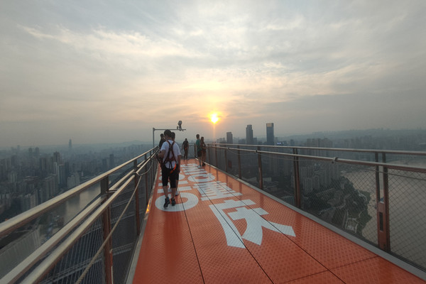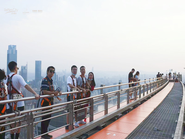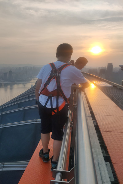 2、为了值回票价,游客要么选择看晚霞,要么选择看夜景。来福士探索仓你可以随意逗留都可以,但“云中漫步”游客们都通过保护绳连接,你如果不走,必然影响后面游客的游玩,所以你在“云中漫步”逗留时间大概半小时左右,除非你运气极好,整个“云中漫步”就只有一两个人,那你就可以随便游玩拍照了