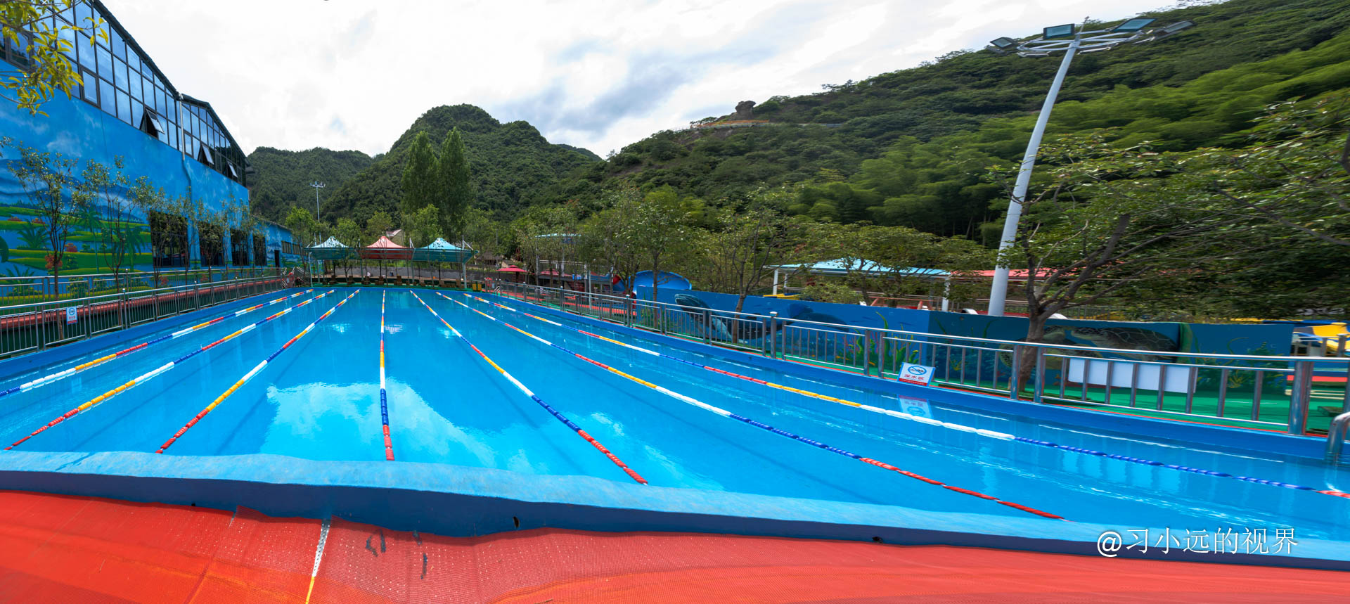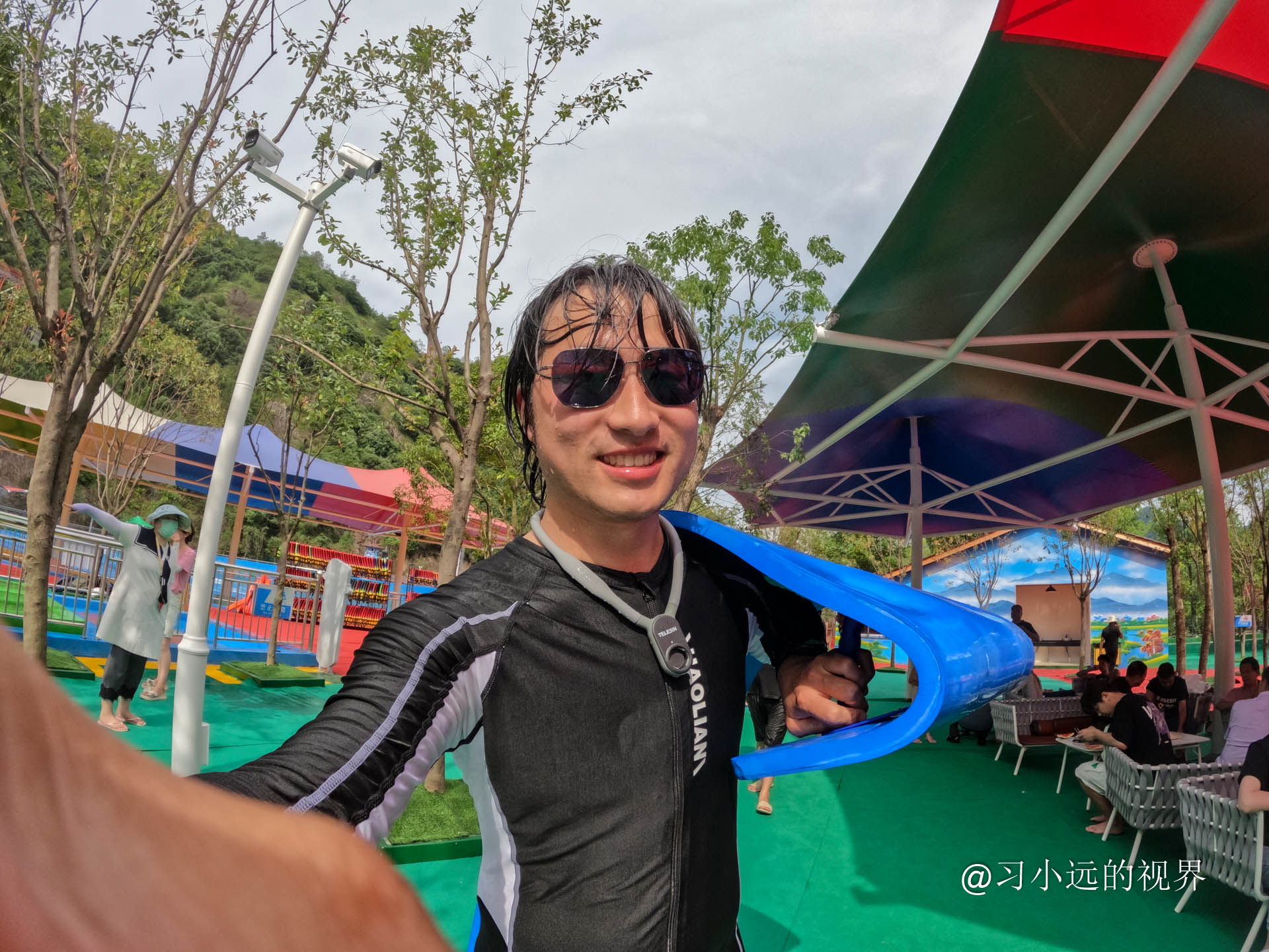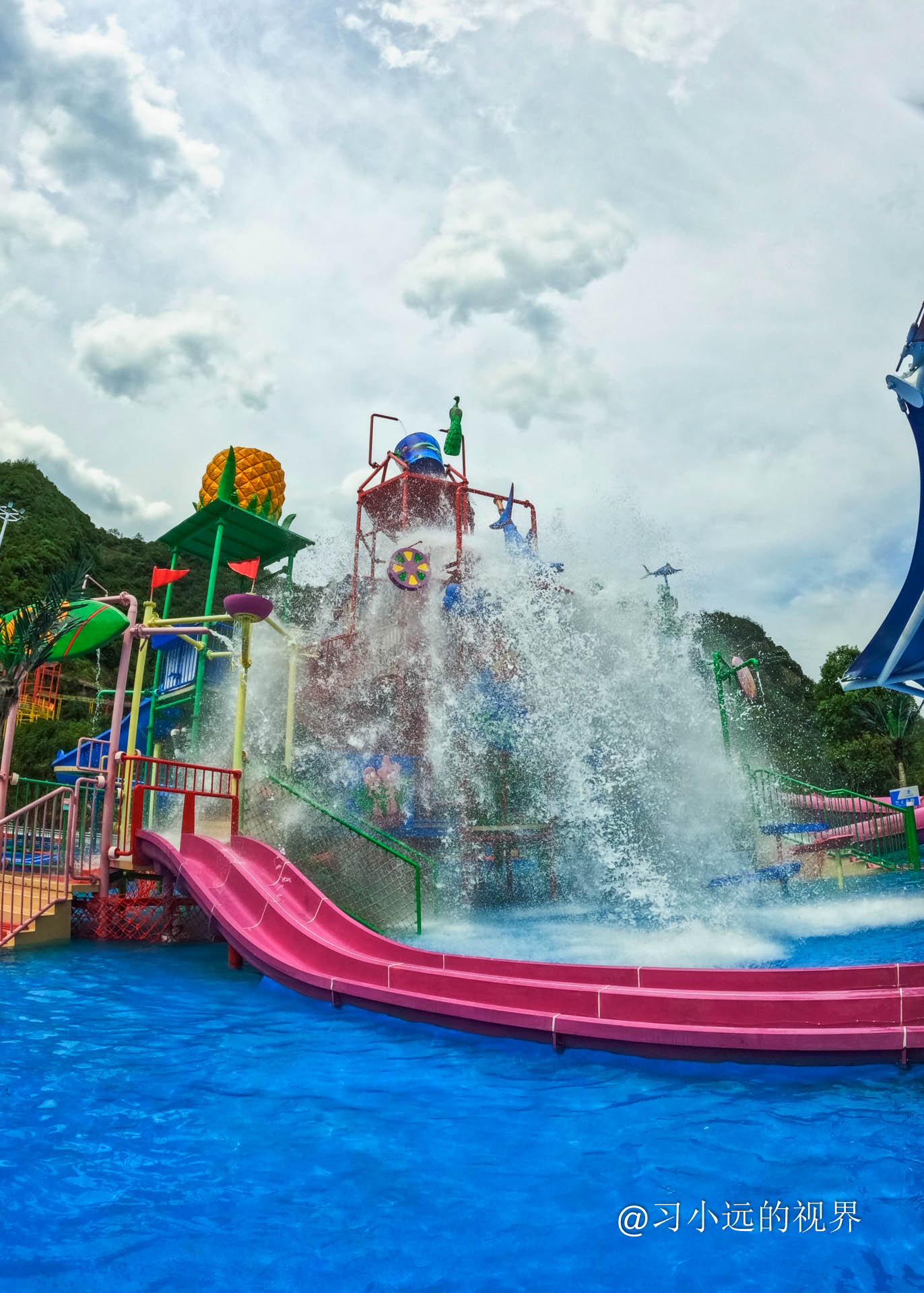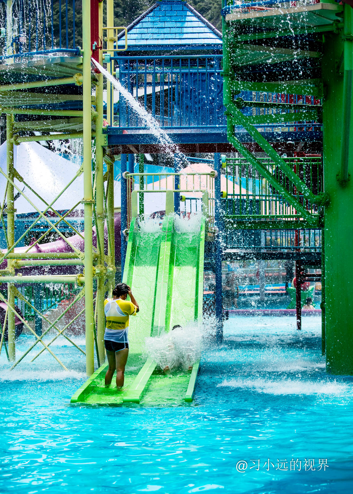 别看这处水乐园依山而建,不过该有的项目它都有,比如大型造浪池,螺旋滑梯,彩虹滑梯,超高速滑梯,超大型儿童水寨,最大的特色应该还是有一个2公里长的依山而建的玻璃滑道,这个滑道从进入水乐园我就盯上了。