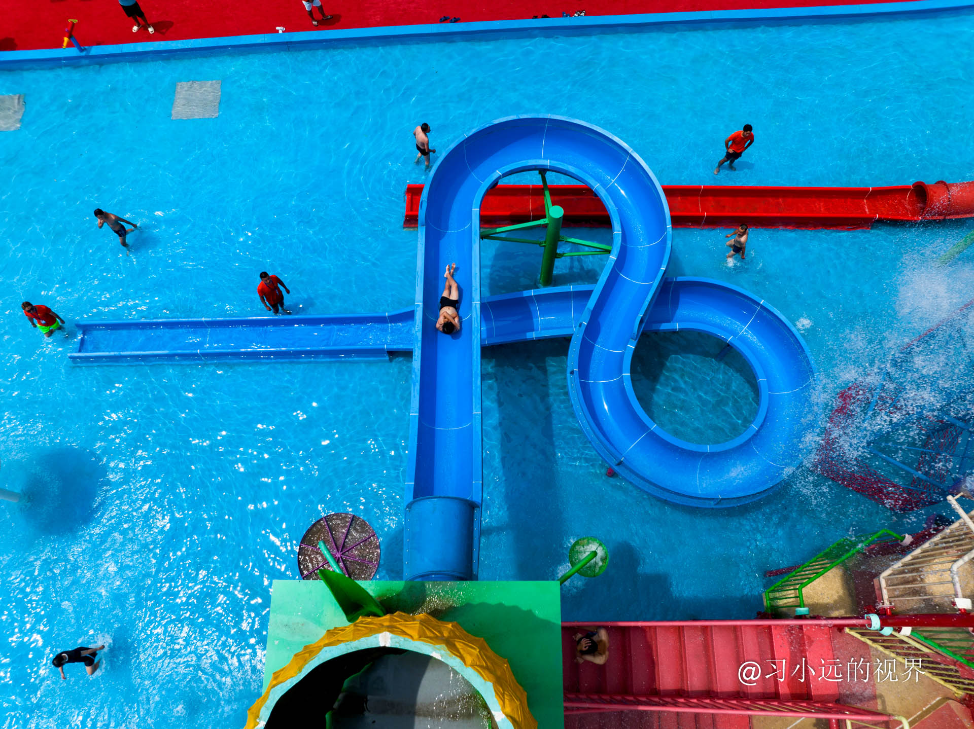 在无人机里先探了一个路,这个水滑道确实很长,弯度还很多,还有螺旋下降的部分。要是玩起来应该很刺激。实际上也确实很不错,跟着摆渡车会把你拉上半山腰上,这里便是水滑道的起点,从这里开始最后冲到水乐园里。这个滑道算是水乐园里的一大亮点了,因为很多水世界没有这么大这么长的滑道。