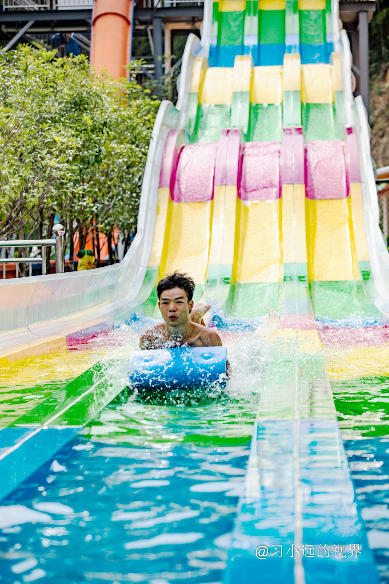 让我玩的话,我可能比较喜欢这种刺激点的项目,可以一趟一趟的听吧不同的滑道都玩个遍,就是喜欢那种一波三折的下落感,到最后激起水花的感觉,当然还会在乎最后冲下来可以冲多远。相对来说,这里的彩虹滑道算是比较温和的,因为以前也玩过长度和坡度更加大的,也因为这样,这更适合大多数人体验。体验的时候听指挥一般就可以很顺利滑下来了。