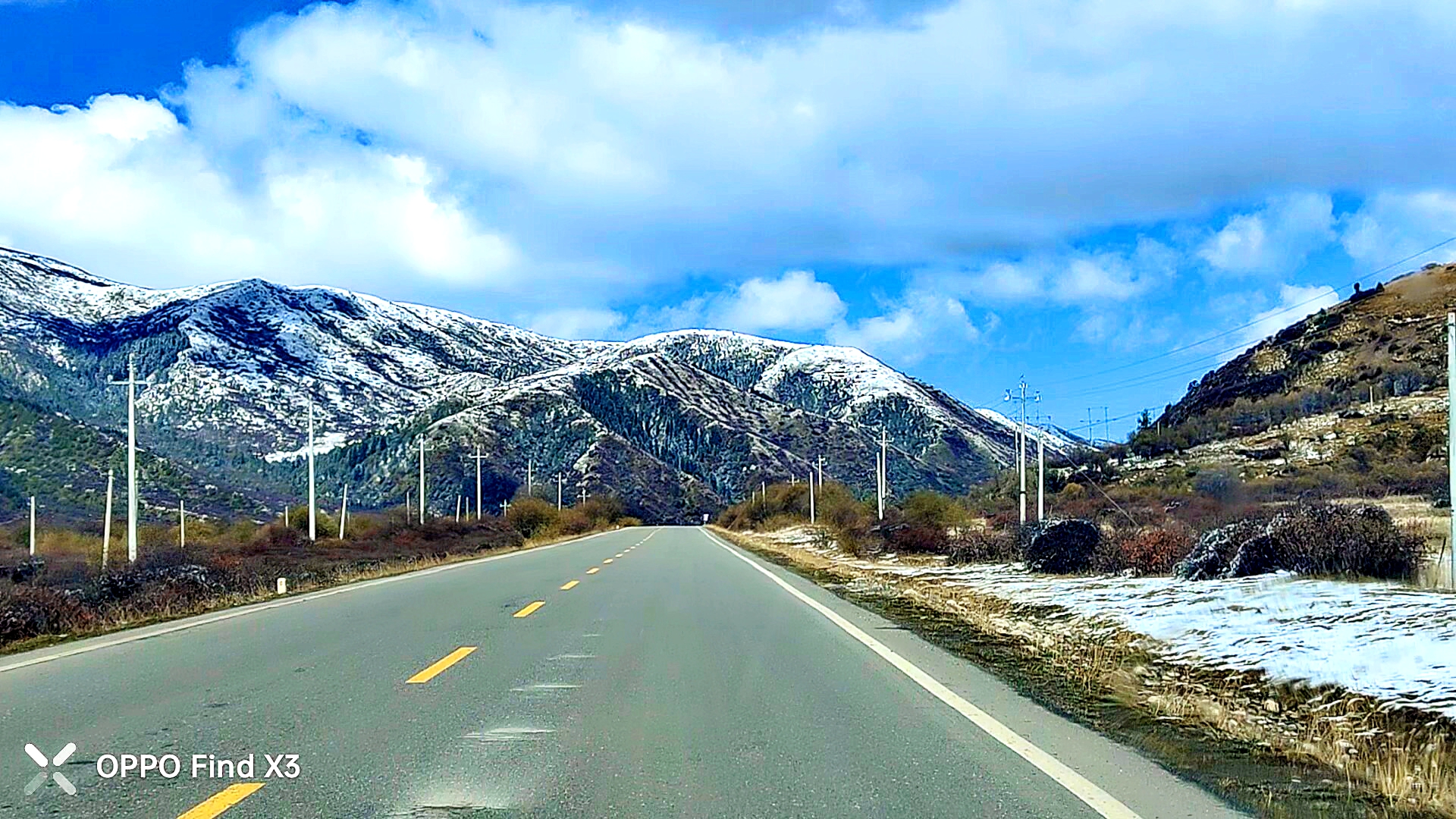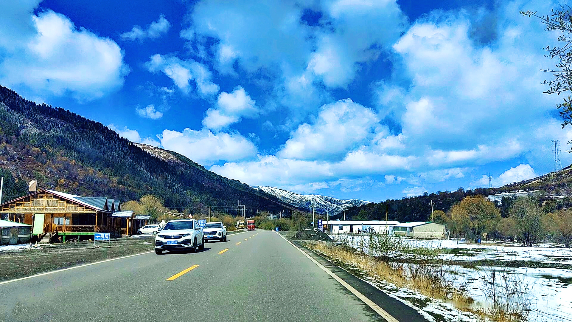 ▼在刷经寺服务区休息20分钟后,我们沿S209省道继续前行,一路上山顶白雪皑皑,路边坡地还有未融化的残雪,一路路况较好且风景优美,隔着车窗手机拍摄几张。