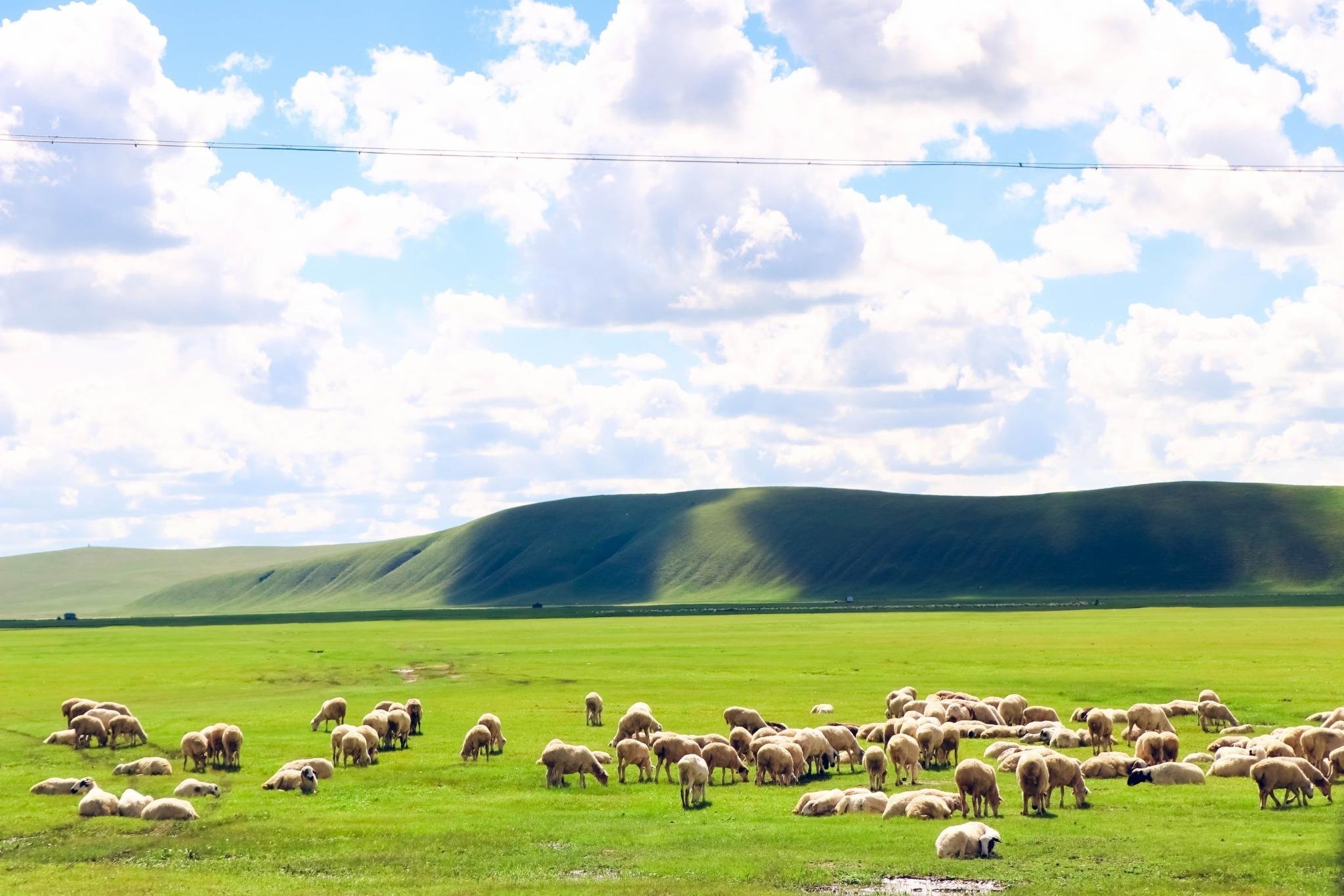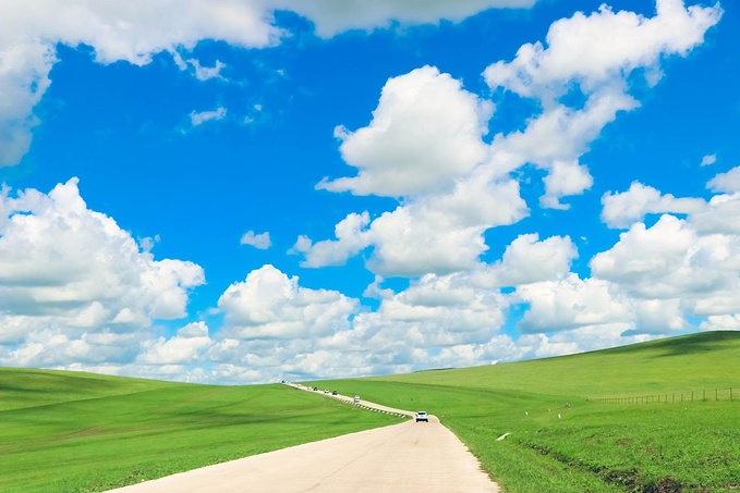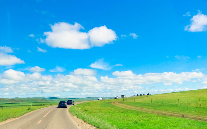 直到到达莫日格勒河,看完“天下第一曲水”之后,车队和旅行团相继折返,而我们选择继续前行,一路向北。这才挣脱出人车的嘈杂,驶入了心中真正的草原!这下子,天地间一下就开阔了,蓝天白云的映衬下青绿的草原连接天际,活脱脱一幅90年代的电脑桌面!同行的美女也哼唱起歌来:“我们在大草原的湖边看候鸟飞回来……”烦躁的心情也随着风景转为兴奋欣喜!天苍苍,野茫茫,风吹草地见牛羊!大草原,你终于美成了我想象中的样子!
