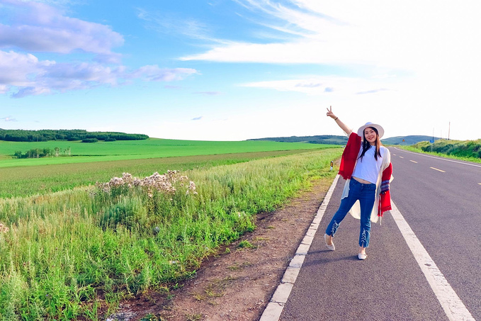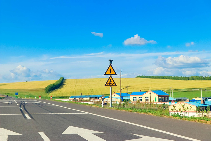穿越草原走过了坑坑洼洼的草原天路,一个转弯便驶上了S301,道路突然间变得平坦开阔起来!本来只想着这不过是去根河的必经之路,路过也就过了,没曾想却一次次抵不住美景的诱惑,忙叫李哥停车拍照!这条路上是从草原到森林的绝美过渡,每一帧画面都是一幅绚丽油画:一座孤单单的木质小屋伫立在无边的草原上;浑身带刺的紫色花朵铺天盖地的绽放,嫩黄色的油菜花即将绽放;微风轻拂过绿油油的麦田卷起层层麦浪;笔直无人的公路仿佛能一直开到天际;黄昏的光韵洒在云卷云舒后幻化成的鱼鳞纹让人不禁想起顾城的诗:“你一会儿看我,一会儿看云,我觉得,你看我时很远,看云时很近”。路上那些不经意遇到的美好瞬间,拼接成这条景观路的完美赞歌!非常美的风景,总是不期而遇!