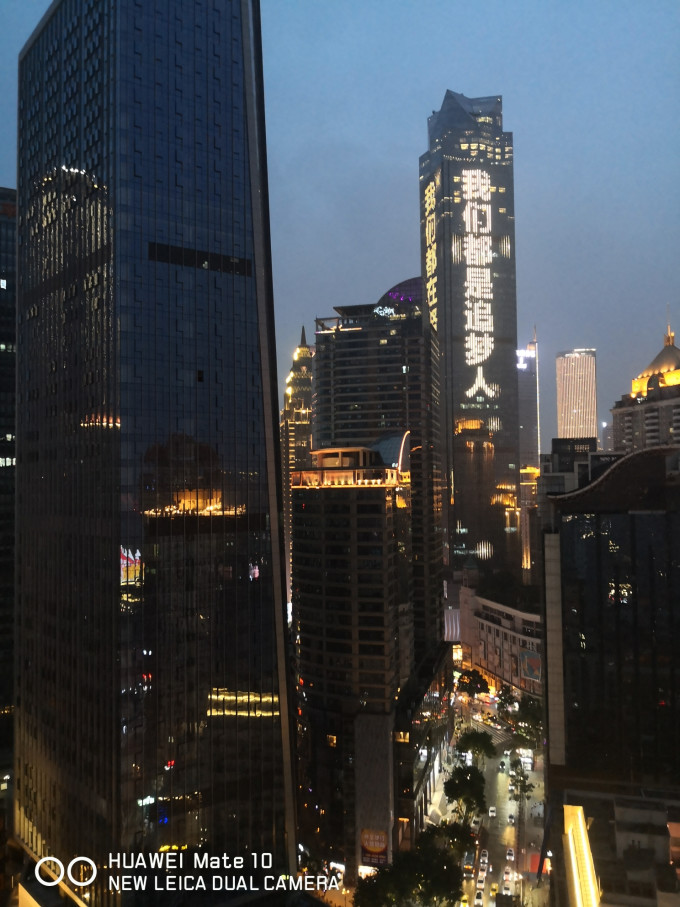 此时正值庆祝中国共产党成立100周年,解放碑附近的高楼大厦都是庆祝的字幕,那流光溢彩的灯光秀让人流连忘返。