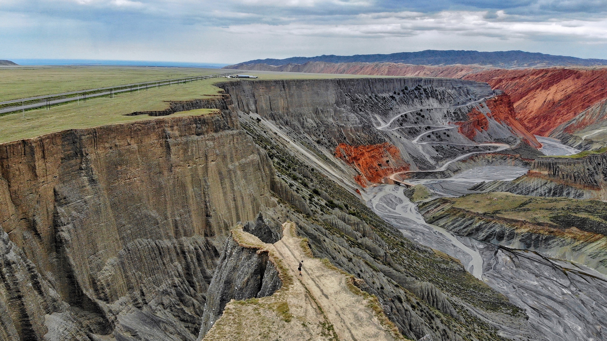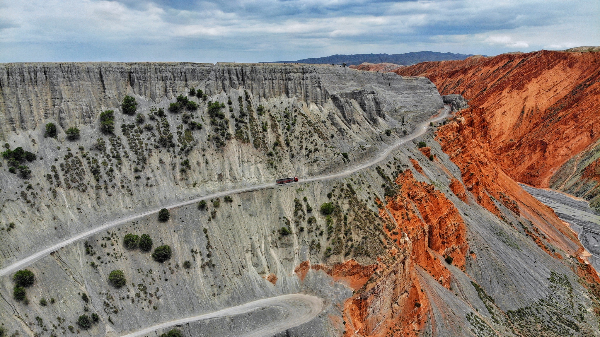 这里隶属于红山煤矿,可以看到紧贴着崖壁的小径上车来车往,都是运送煤矿的货车。
