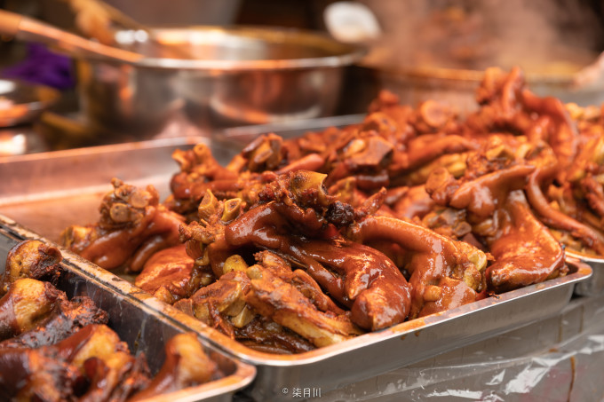 古镇街道两侧有各种店铺,卖当地特产。最有名的当属“青岩卤猪蹄”,又称“状元蹄”,古镇内随处可见。