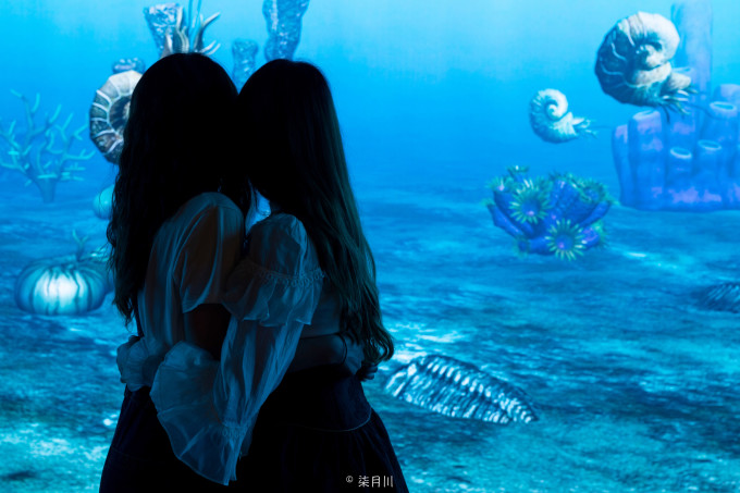 展厅内的海洋部分被蓝色笼罩,大屏幕上播放着远古贵州海洋生物的动画视频,仿佛置身于蓝色梦境。