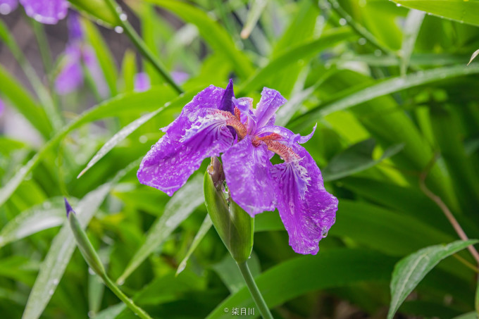 在一个不知名小巷的屋檐上,紫色鸢尾花开得正艳,雨中的鸢尾花娇艳欲滴更显迷人,如梦似幻。