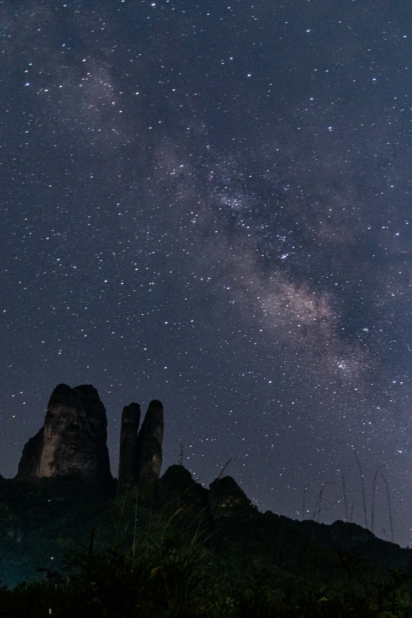 顺着湖边继续走,看到亮光就感觉像萤火虫,其实都是反光。突然发现江郎山就在前头,银河就在他顶上,好美。尝试了各种位置,最终也就这张最满意了。