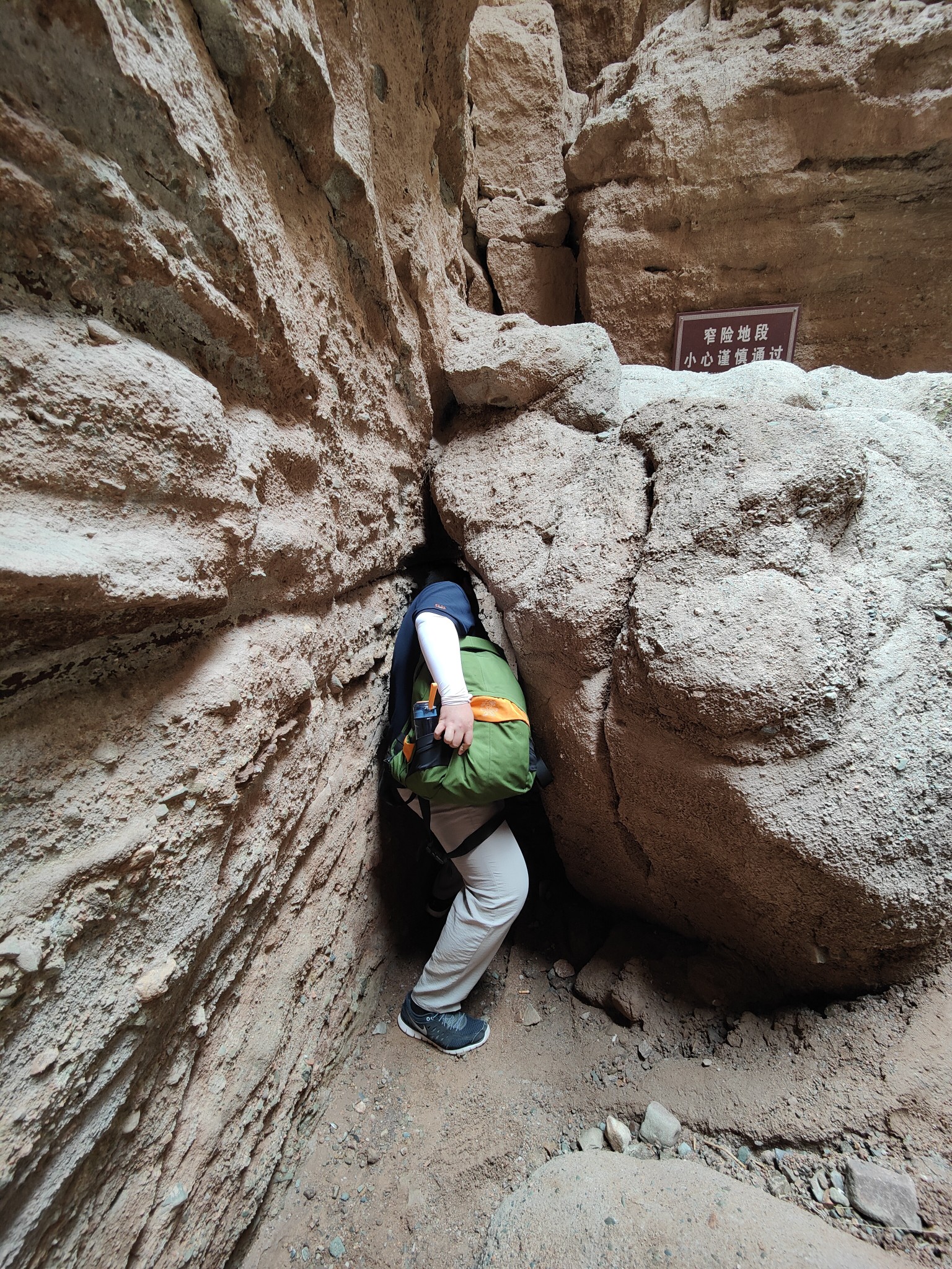 姐自认三十年来去过很多“一线天”的景点,平山湖峡谷一线天的体验最深刻,真正的夹缝中求生存。当然看到娃爹打头阵居然顺利通过的时候还是觉得一线天不够窄