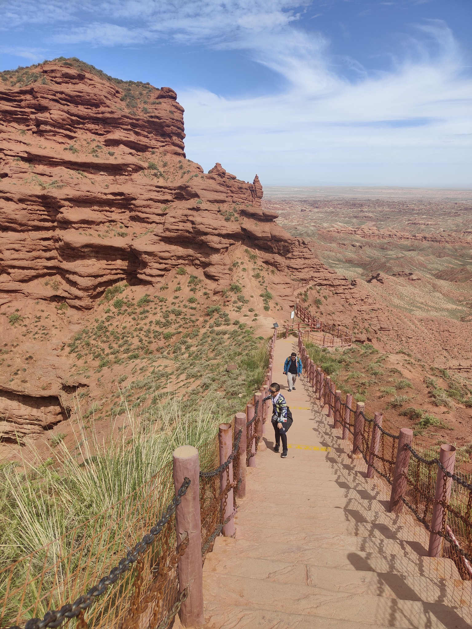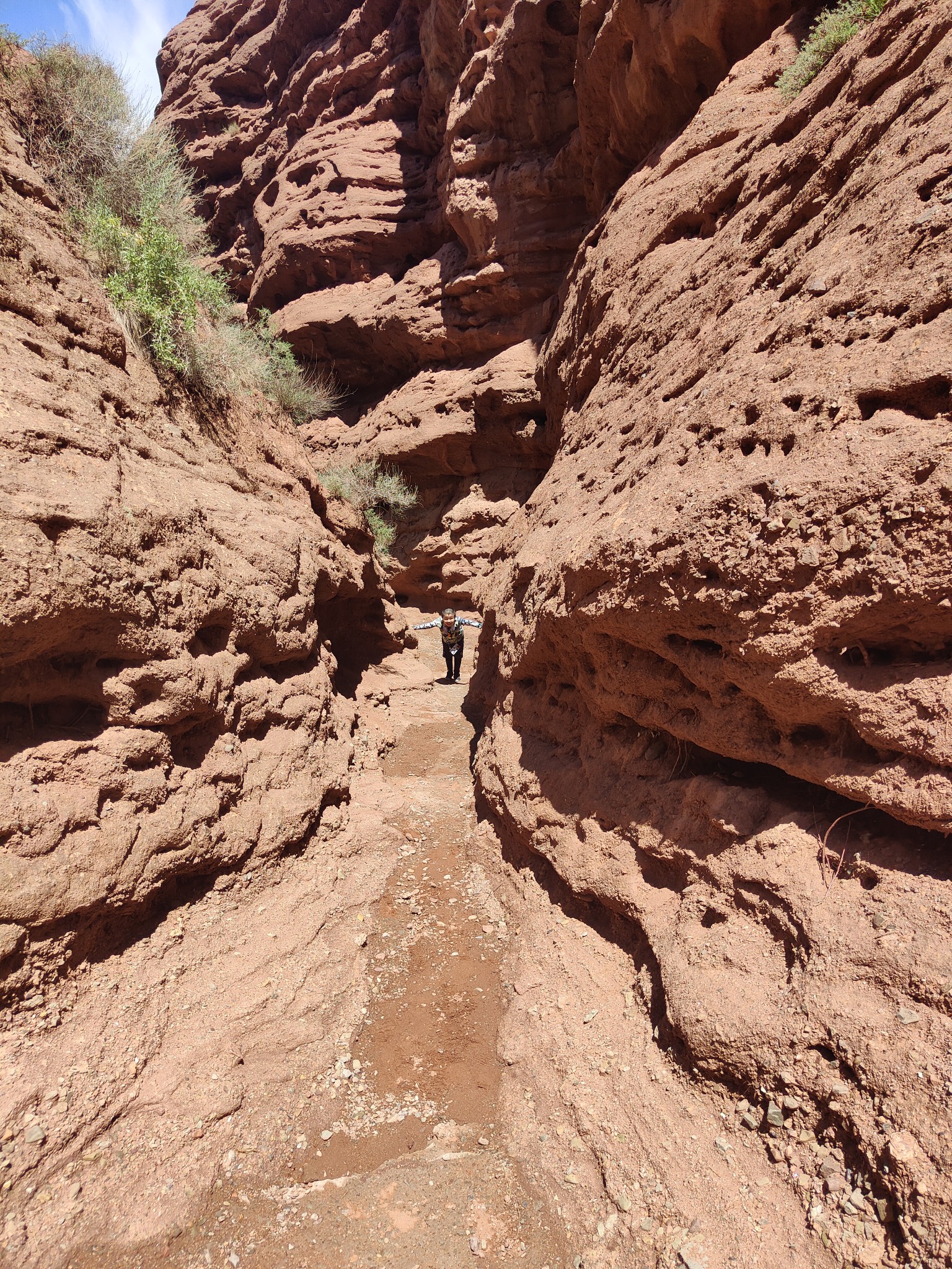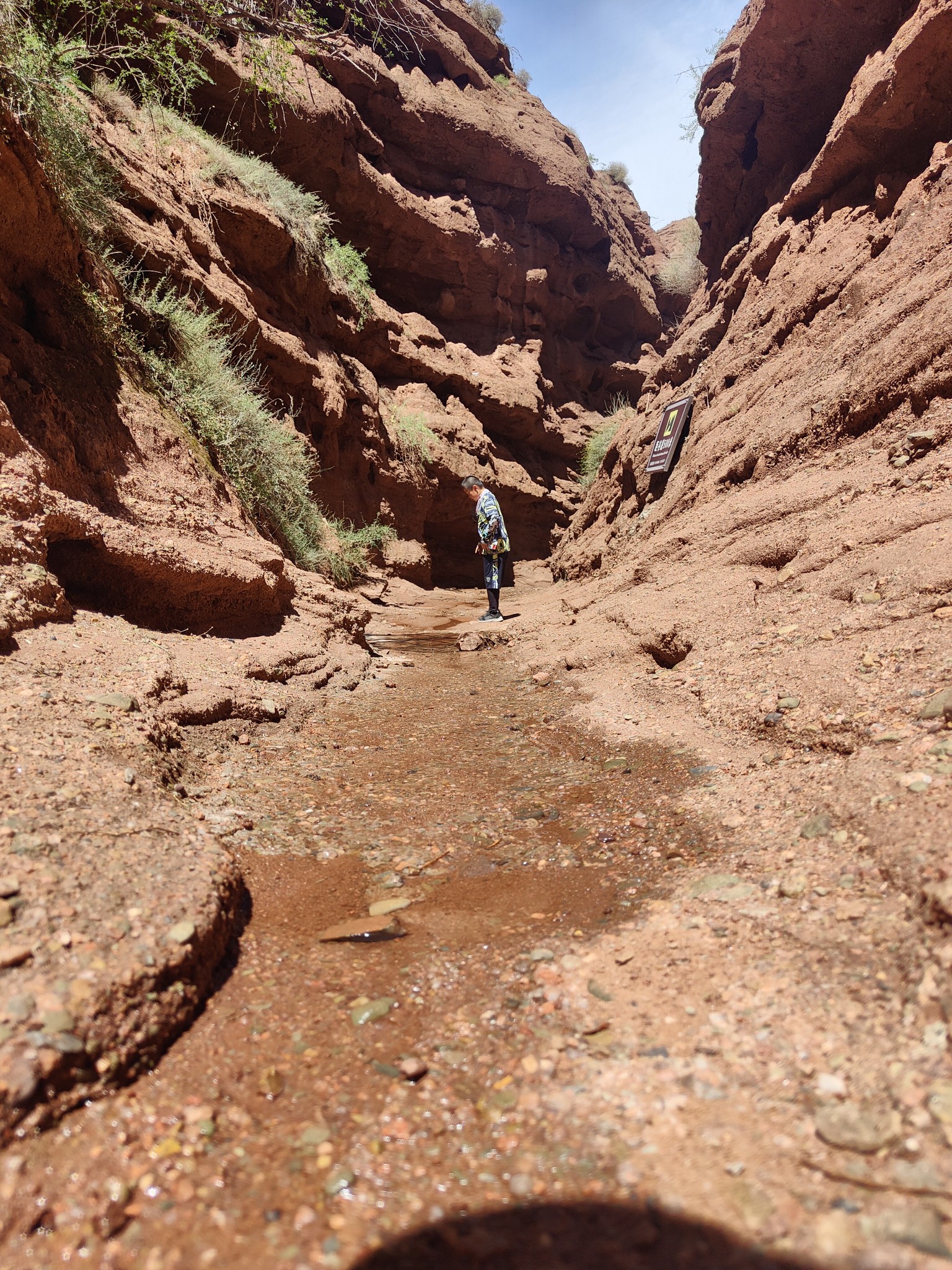顺着观景平台一路前行,前后都看不到人,懒散的拍拍照,眺望远处的风景,约四十分钟后逛到峡谷入口处。在入口处附近有一处遮阴休息区,遇到十来个游客,主要还是年纪大的大爷大妈,他们不下谷,只是干坐着等游览车去到终点。我们简单吃了点自带的干粮和酒店早餐的水果,在入口处对面上个洗手间(MARK一下峡谷下好像没有厕所的)就下谷了。沿着陡梯入谷,有些地方都是钢梯架路,峡谷山脉都是红色砂砾岩,路上依然是没有游客,只有我们仨,惊喜的发现了沙堆上的小蜥蜴,不止一条。而第一次看到峡谷的父子俩也是一路惊叹大自然的鬼斧神工,不停凹造型拍照。峡谷的地面是沙土路,对于江南长大的娃来说看到这样的塞外风光,那真是超级兴奋,走路都是跳着的,直呼刺激。