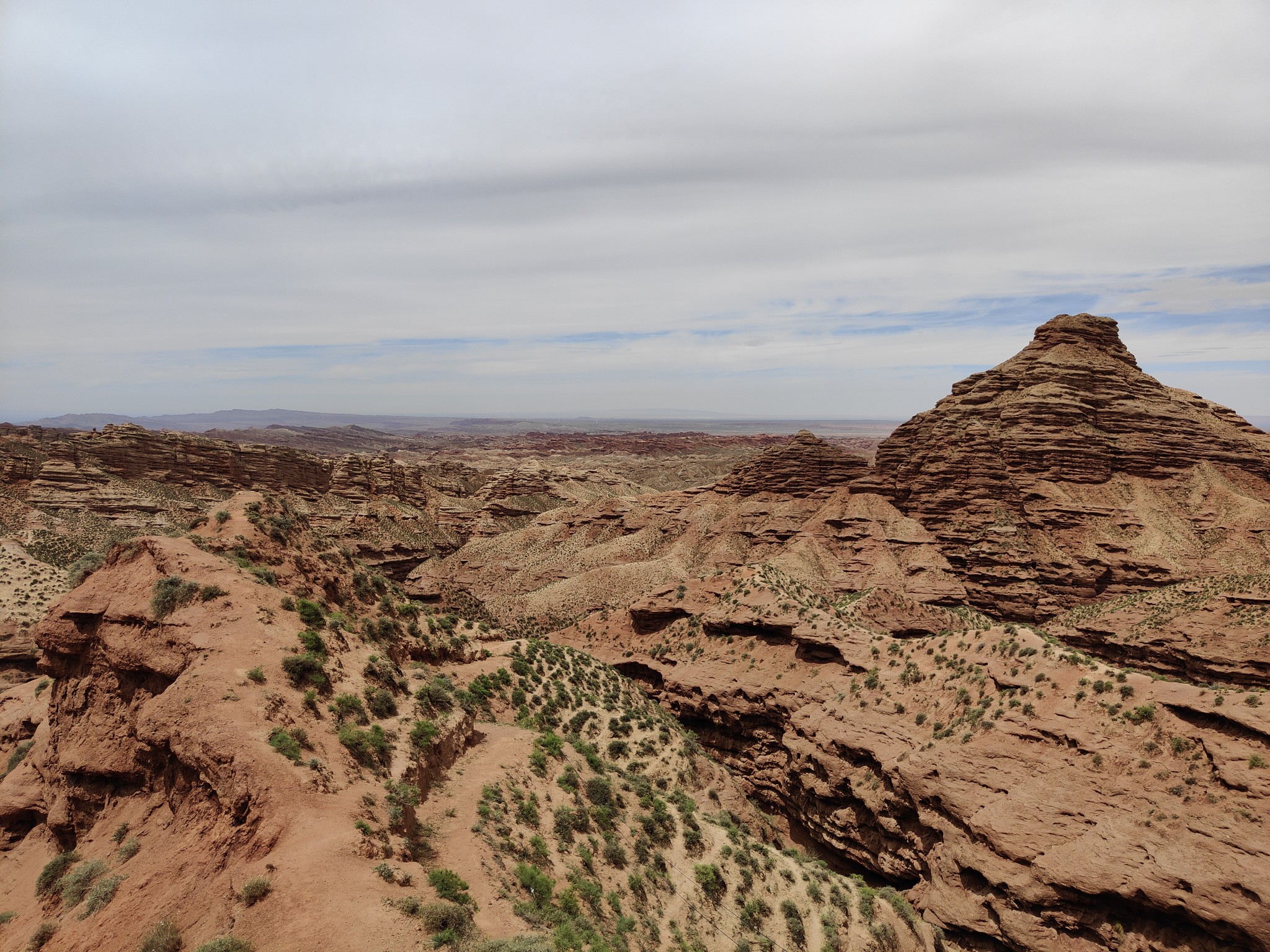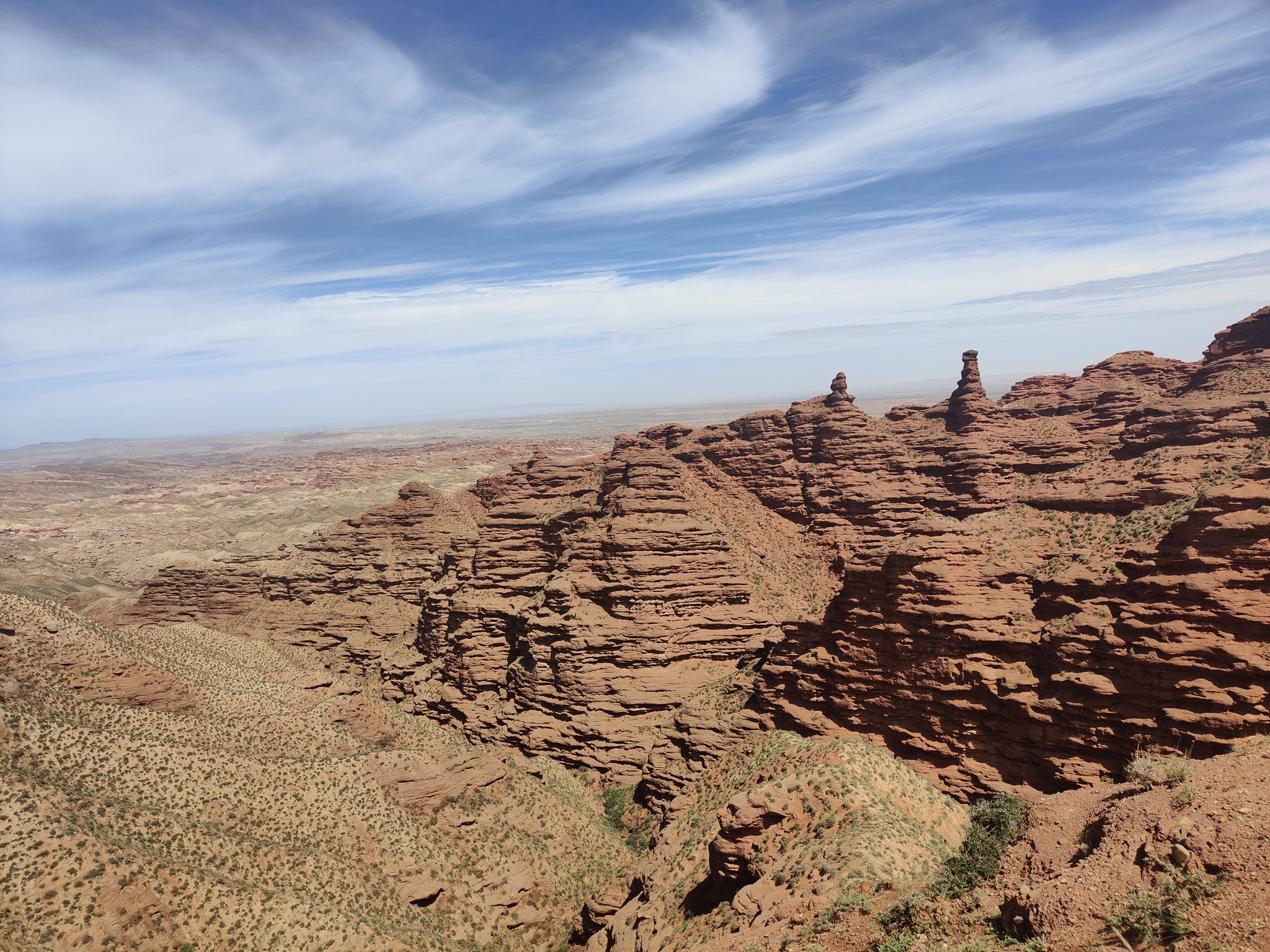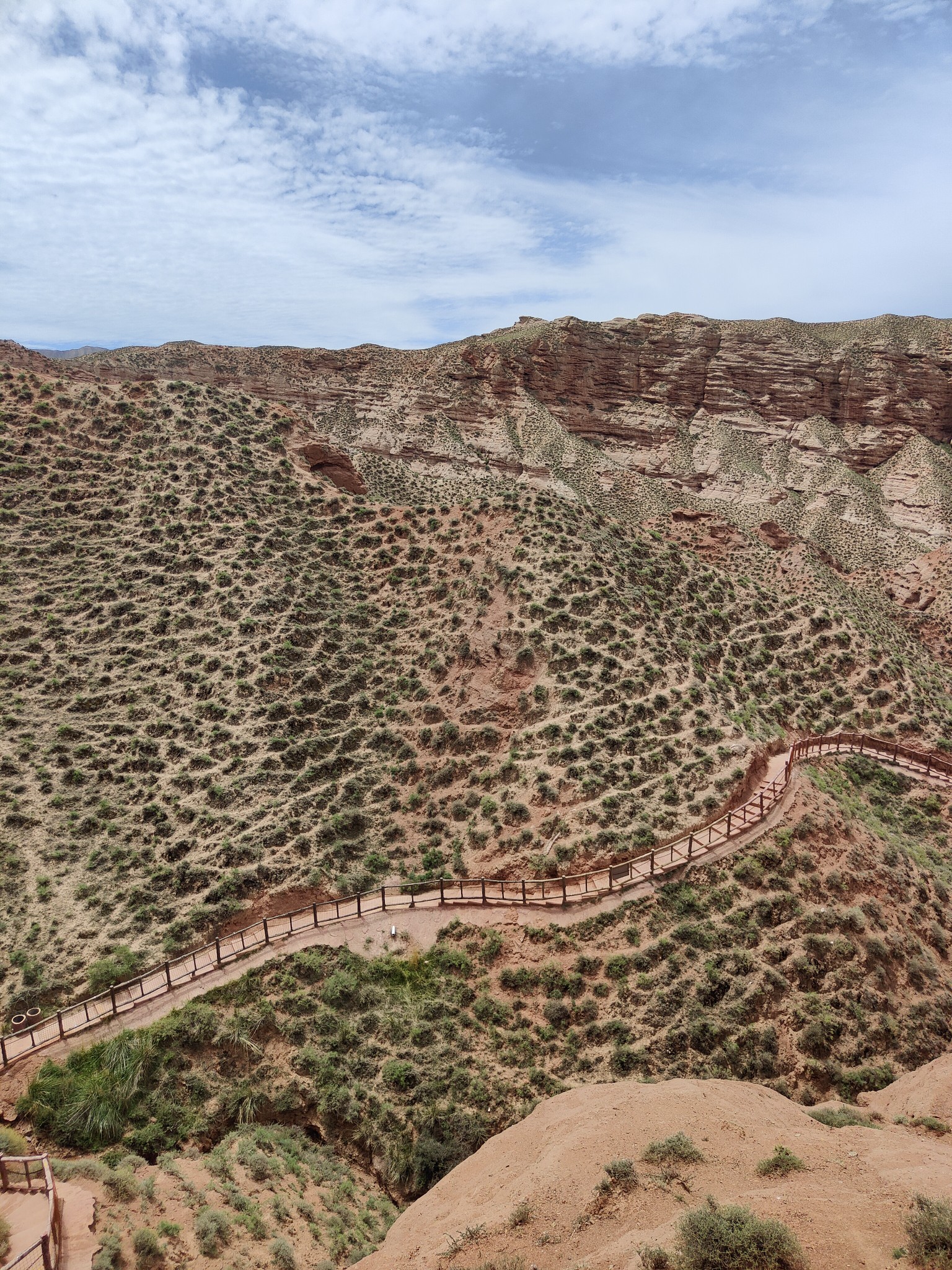 顺着观景平台一路前行,前后都看不到人,懒散的拍拍照,眺望远处的风景,约四十分钟后逛到峡谷入口处。在入口处附近有一处遮阴休息区,遇到十来个游客,主要还是年纪大的大爷大妈,他们不下谷,只是干坐着等游览车去到终点。我们简单吃了点自带的干粮和酒店早餐的水果,在入口处对面上个洗手间(MARK一下峡谷下好像没有厕所的)就下谷了。沿着陡梯入谷,有些地方都是钢梯架路,峡谷山脉都是红色砂砾岩,路上依然是没有游客,只有我们仨,惊喜的发现了沙堆上的小蜥蜴,不止一条。而第一次看到峡谷的父子俩也是一路惊叹大自然的鬼斧神工,不停凹造型拍照。峡谷的地面是沙土路,对于江南长大的娃来说看到这样的塞外风光,那真是超级兴奋,走路都是跳着的,直呼刺激。