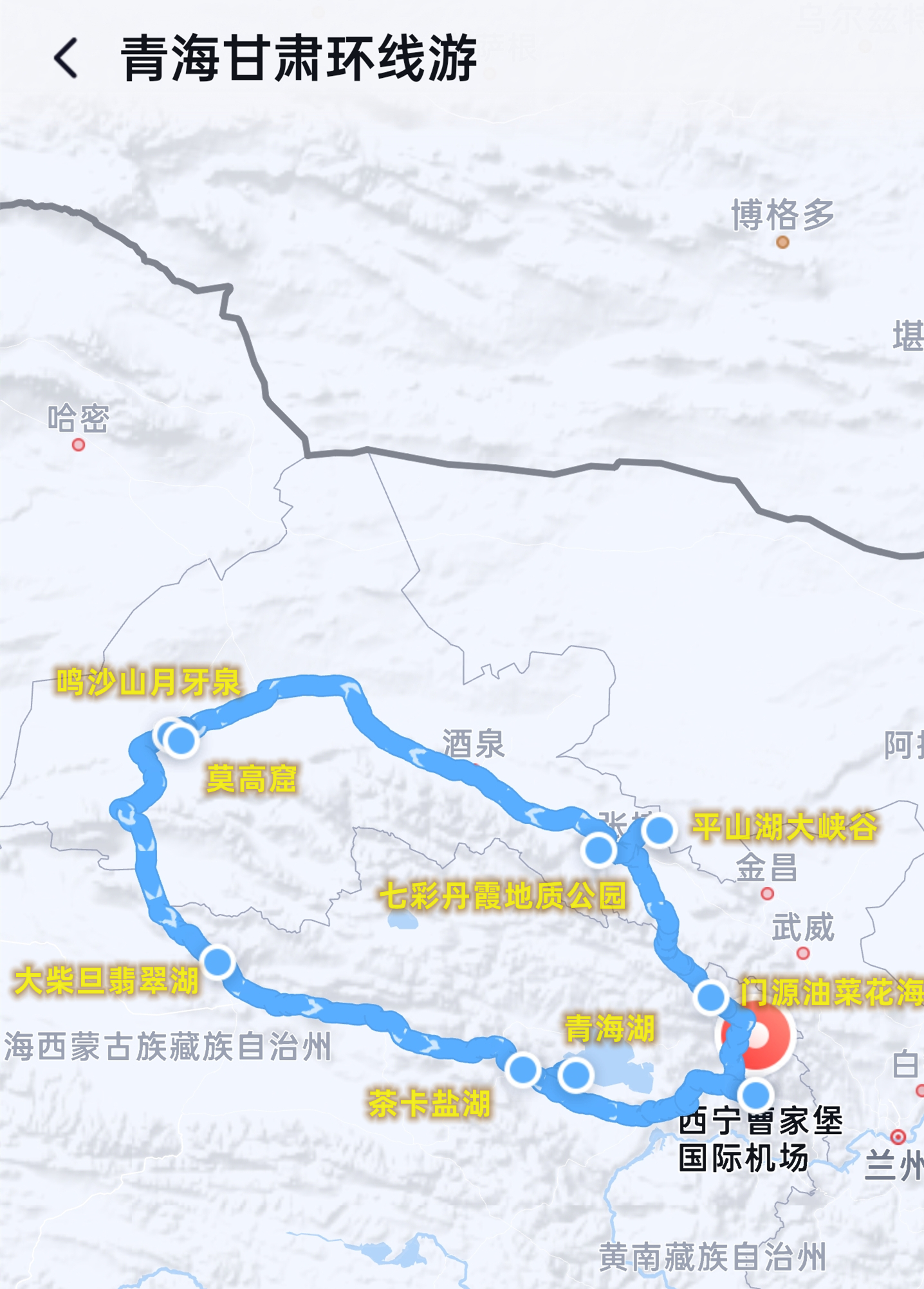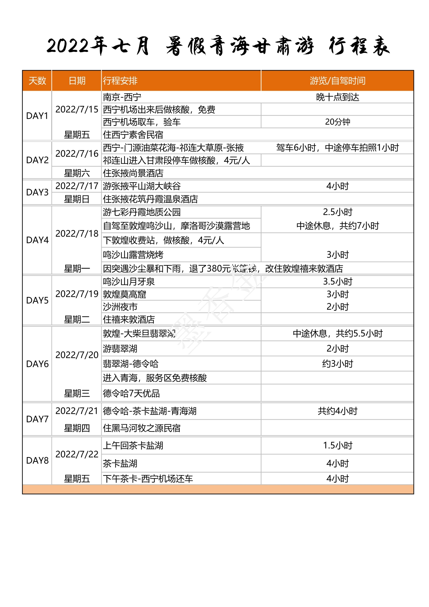 此行原本计划是顺时针环形即西宁-茶卡盐湖-敦煌-张掖-西宁,但是落地当天西宁下起小雨且之后的几天都是阴雨,去盐湖必须要天晴不然什么景色都看不到,好在是自驾,可以随时改,之前订好的酒店都可以免费退掉。以下是本次8天自驾游的行程表: