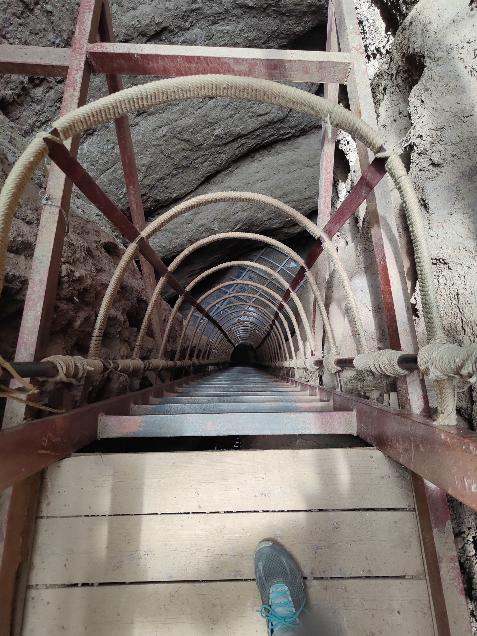 云梯分两段,几乎垂直架在峭壁外。爬完第一段有一处不到5米长的休息平台,如果是曾经的旅游旺季,估计这里要挤满了人。但是我们一家前后半小时一个个爬上来,等姐最后一个上来的时候,回头看看都没有游客,多少觉得BOOK思议,人呢,人都去哪儿了