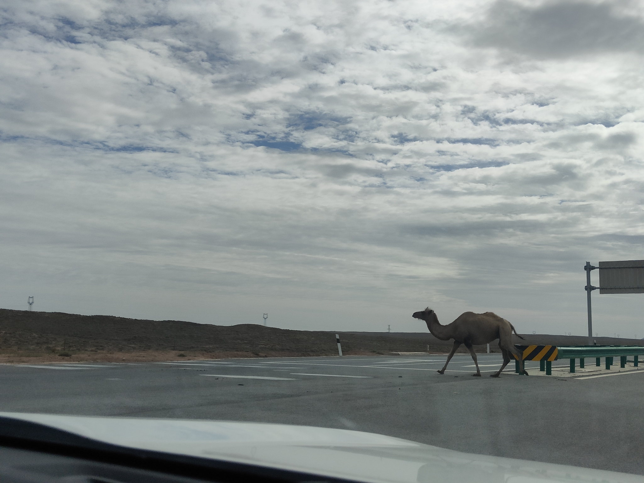 早上7点刚过,服务员敲门直接把打包好的两份早餐送到房间,因为疫情的原因(前一阵张掖老城区有2个外地回来的阳性,相关区街已封控),酒店不能堂食。吃饱饭收拾行李退房后,自驾约1个小时到达平山湖风景区,路上还遇到横穿马路的骆驼,好不自在。